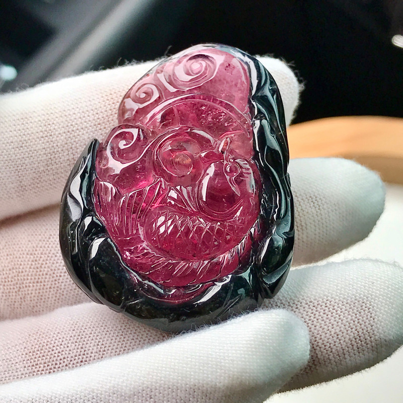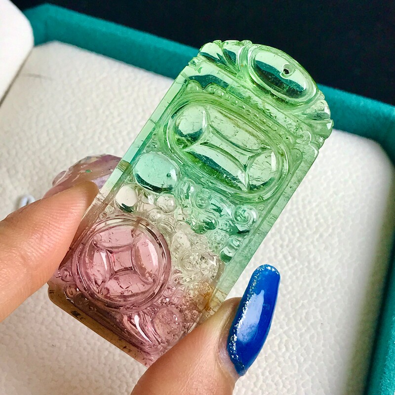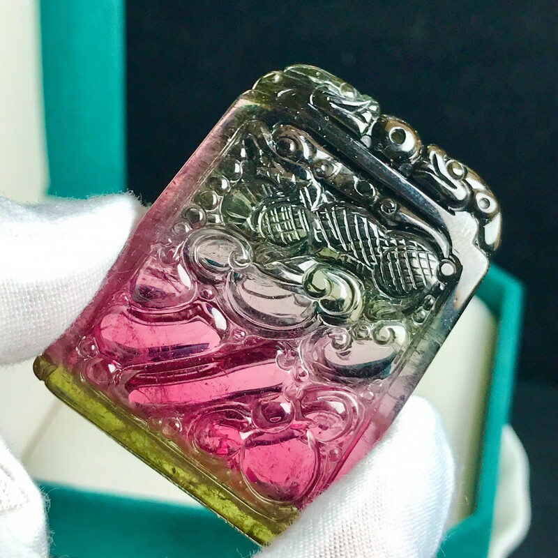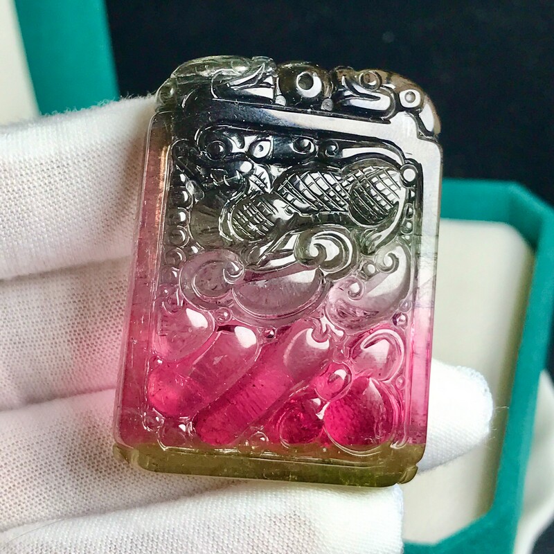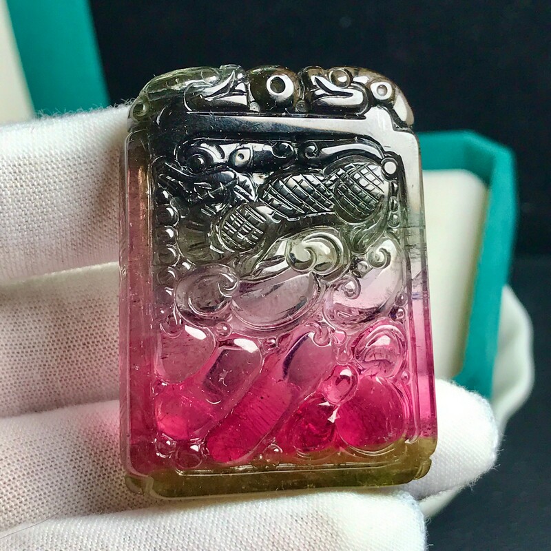 描述:天然西瓜碧璽年年有余吊墜,紅紫雙色,雕工精細,晶體透徹,魚兒靈動有生機,招財滿滿