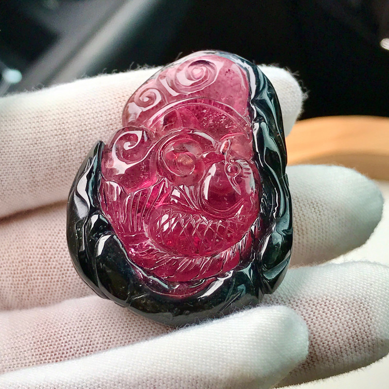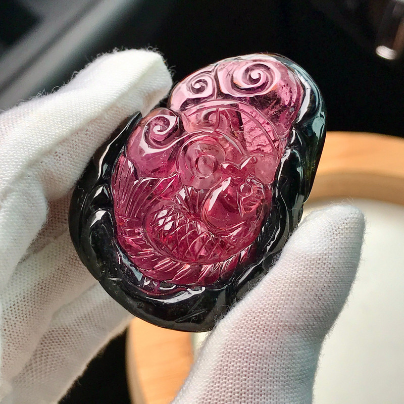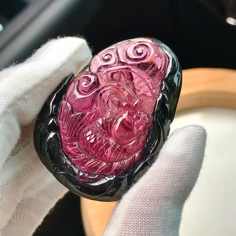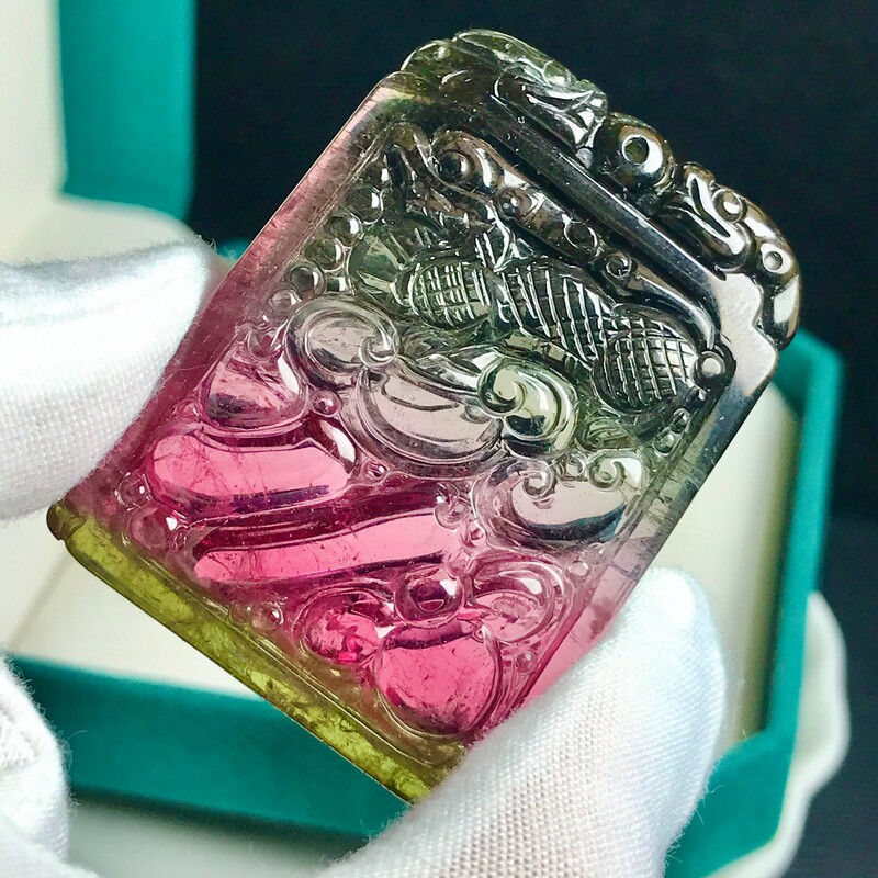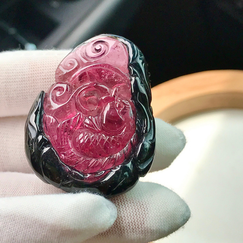 描述:天然西瓜碧璽年年有余吊墜,紅紫雙色,雕工精細,晶體透徹,魚兒靈動有生機,招財滿滿