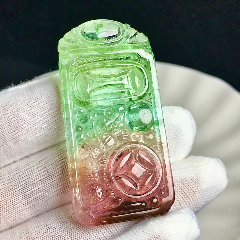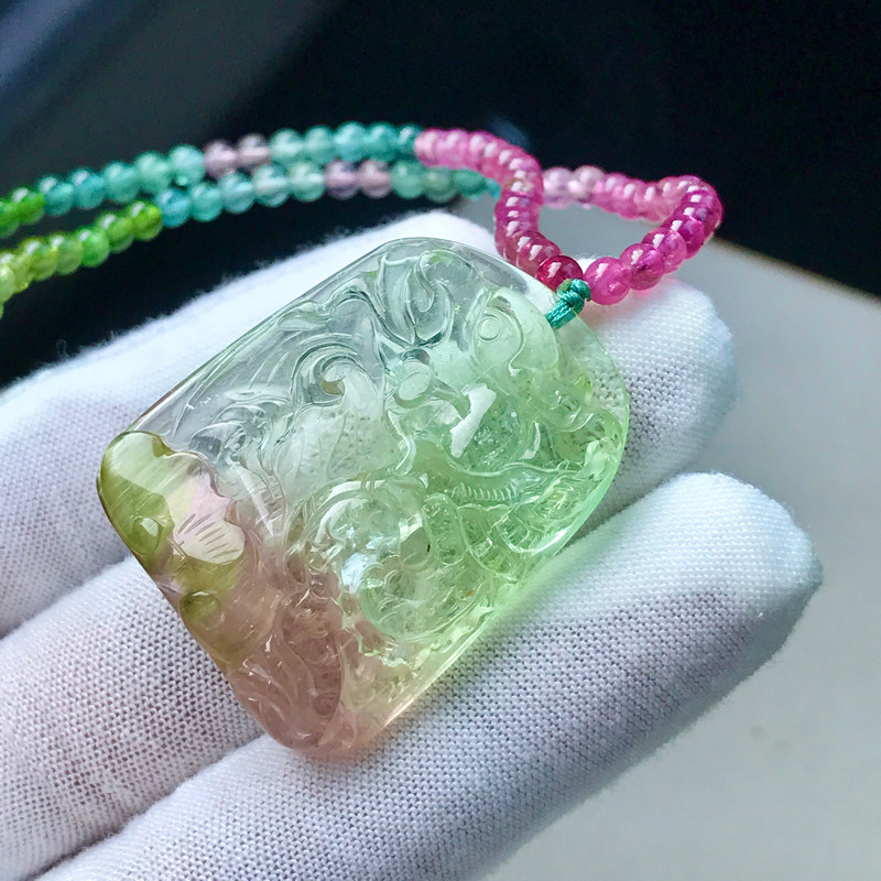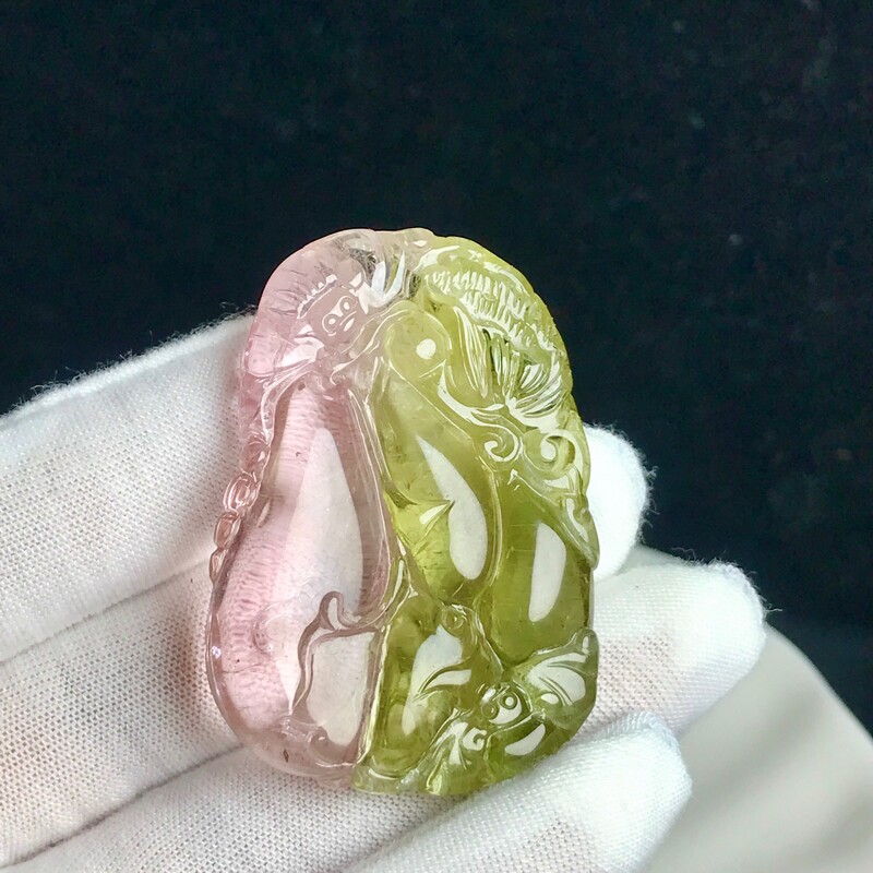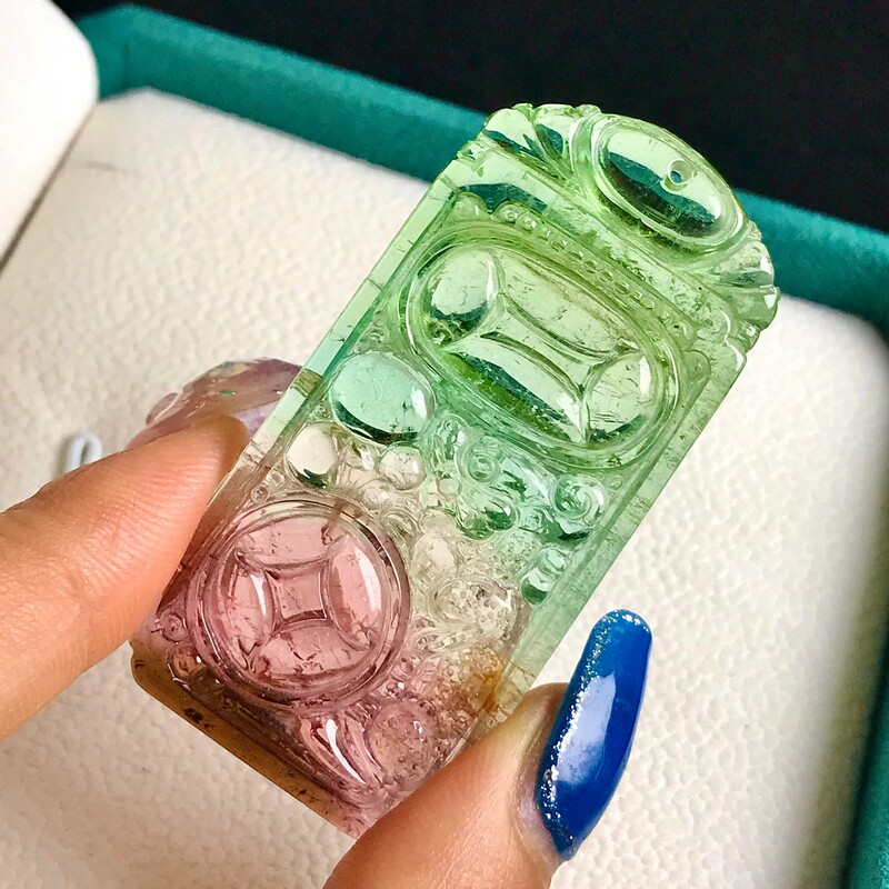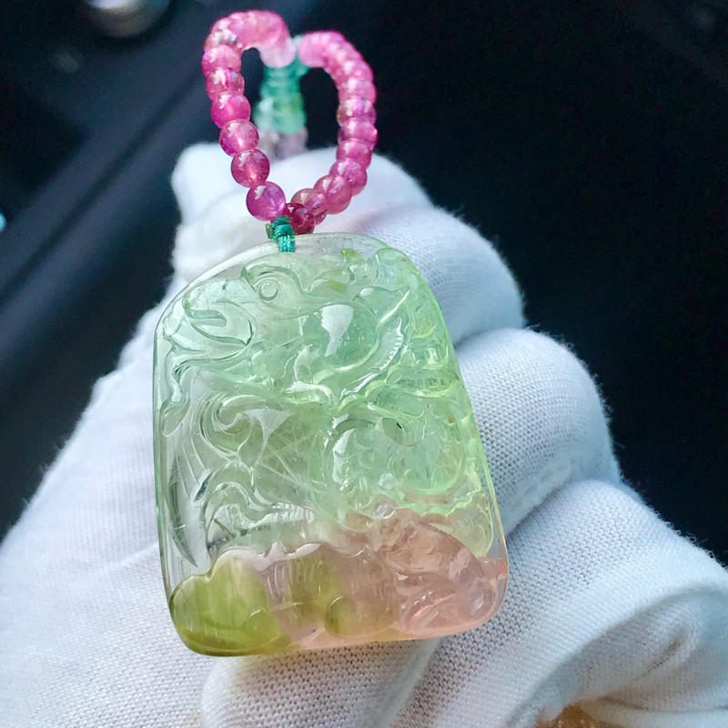 描述:仙女色,天然西瓜碧璽龍牌吊墜,精雕栩栩如生大龍,優雅生輝,氣質經典款!雕工細致,龍魚如意,靈動!晶體通透,潤澤,