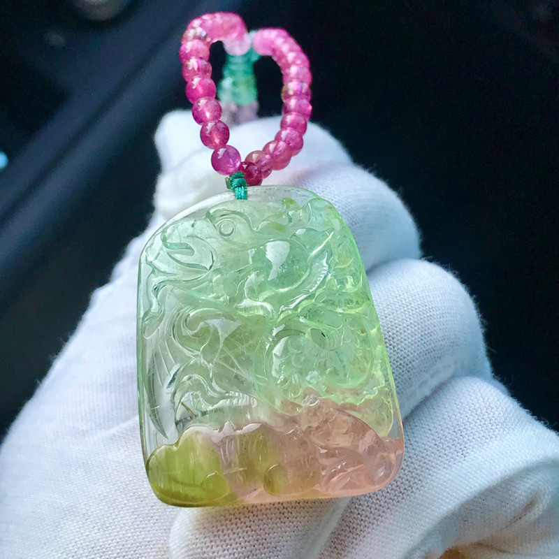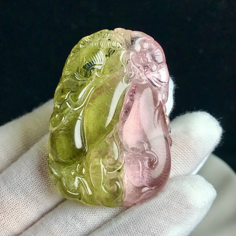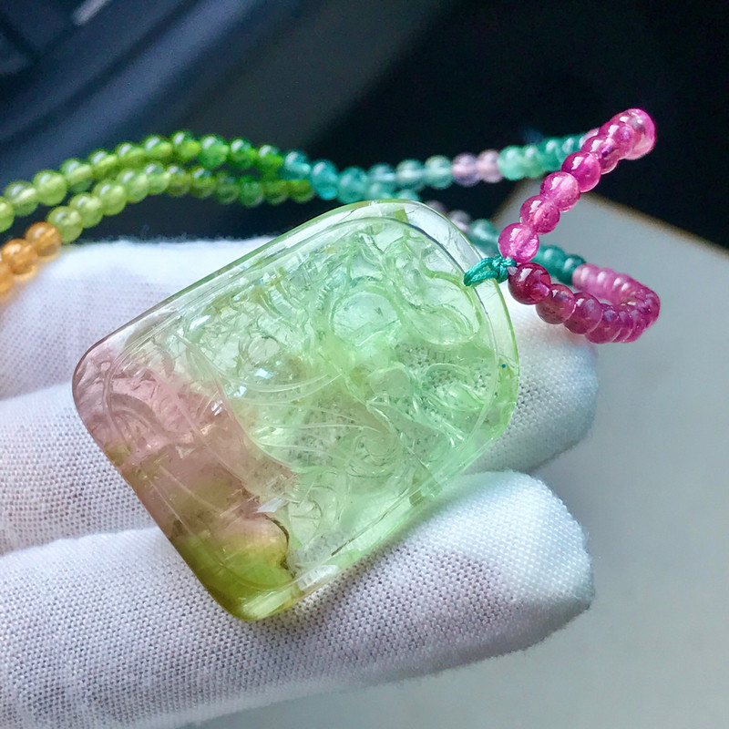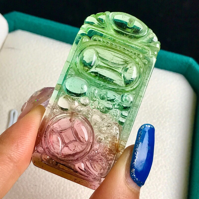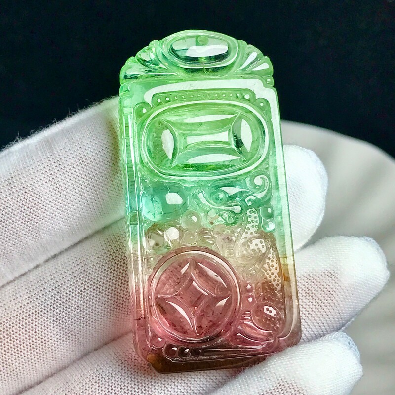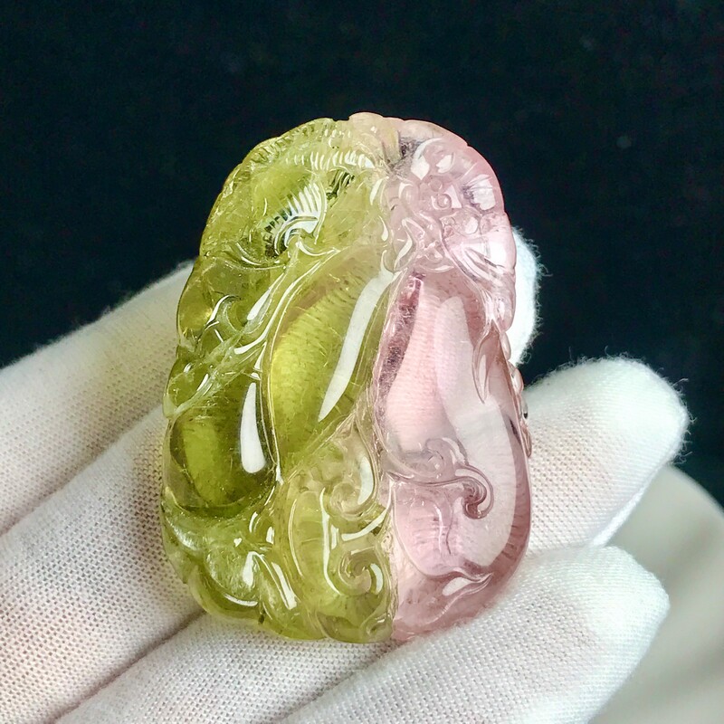 描述:仙女色,天然西瓜碧璽龍牌吊墜,精雕栩栩如生大龍,優雅生輝,氣質經典款!雕工細致,龍魚如意,靈動!晶體通透,潤澤,