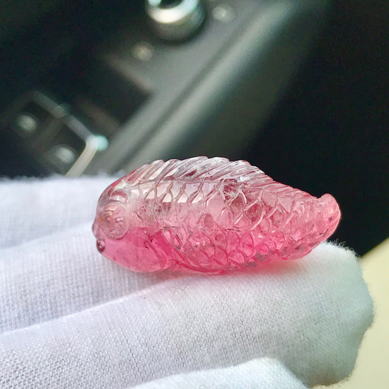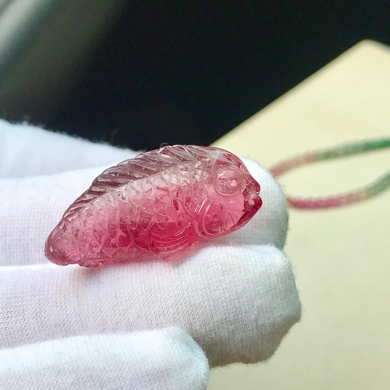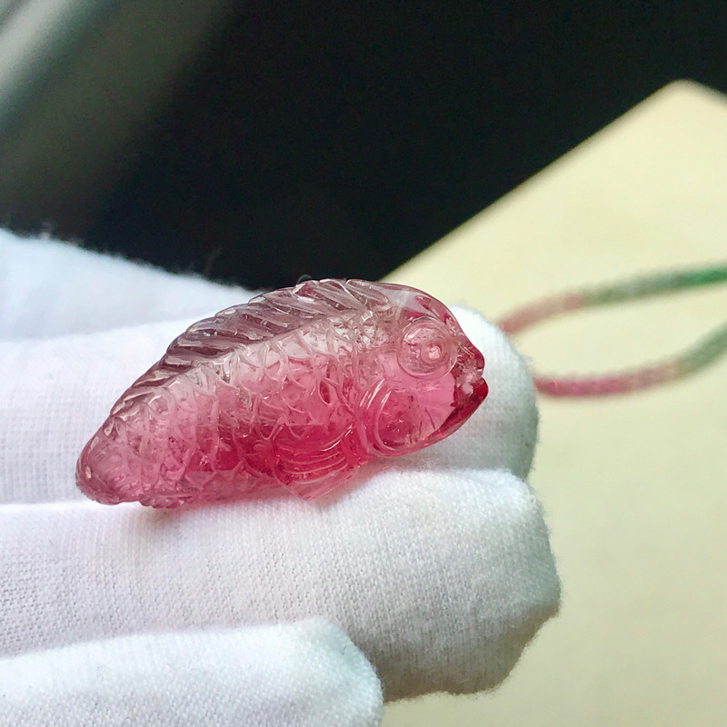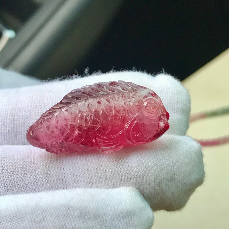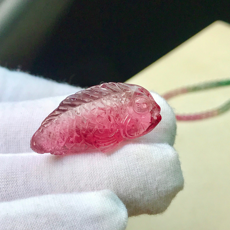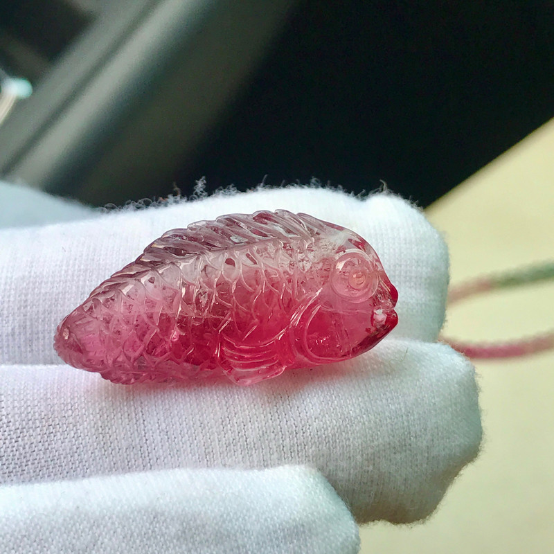 描述:天然西瓜碧璽魚吊墜,月兒彎彎復古美麗形狀,美美滴,經典稀有色,俏色巧雕,潤澤,油亮,雕刻魚與如意,魚代表生機,招財滿滿,事事順利