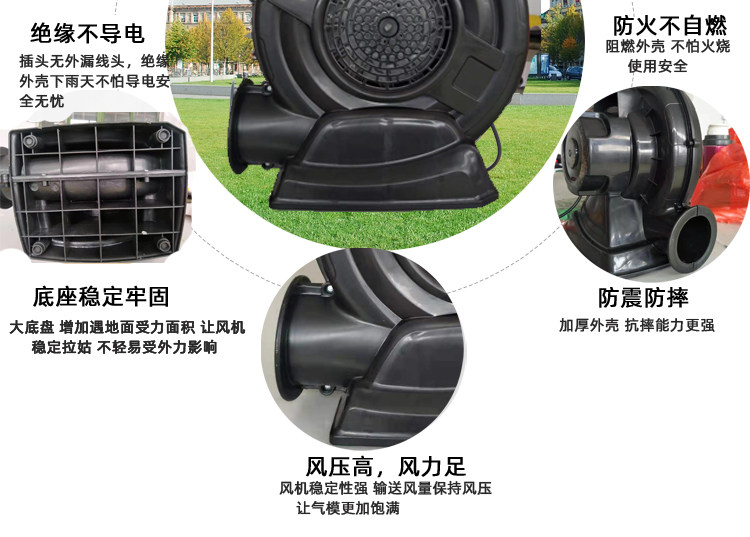 2.內置底座款,此款氣模人底座有個底盤,風機在內部。整體外觀更美觀些。風機的音量也非常小,比較適合室內等要求更完美的客戶。可增加內置LED射燈。