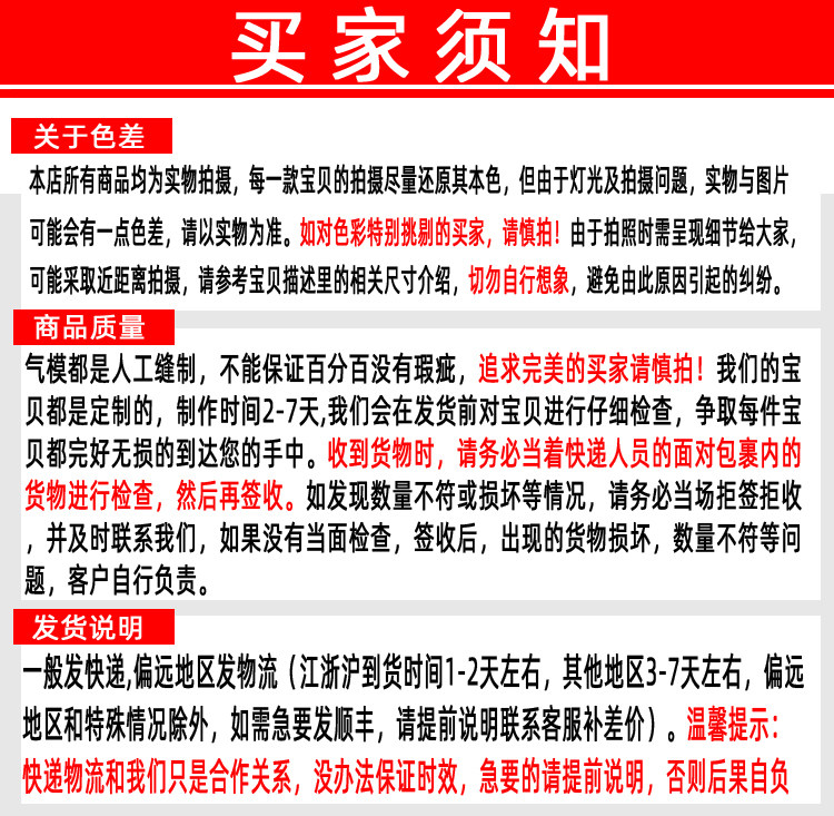 此款氣模為定制產品,不支持七天無理由退貨,購買的親們請確定好需求再購買。購買時請發具體文字或圖案給客服詳細說明制作的要求。