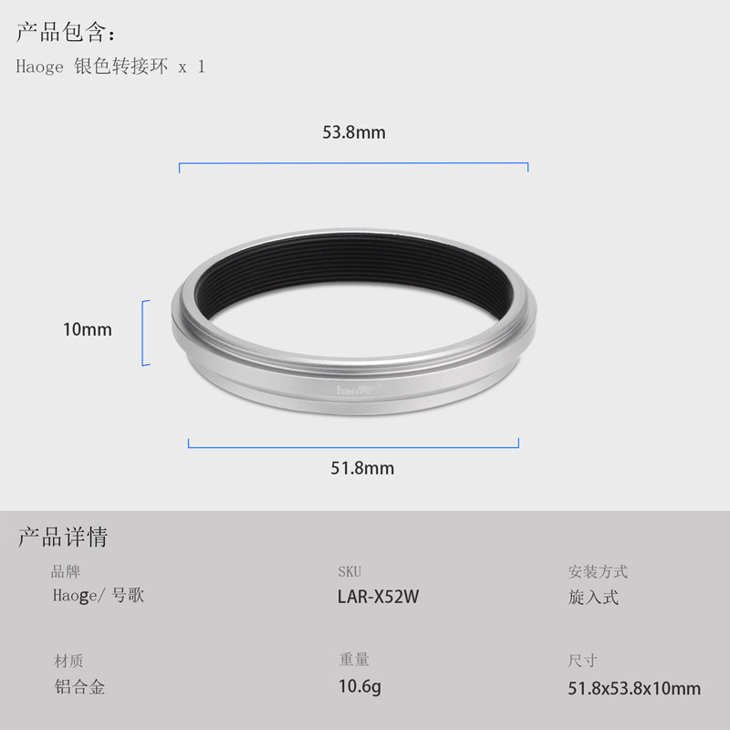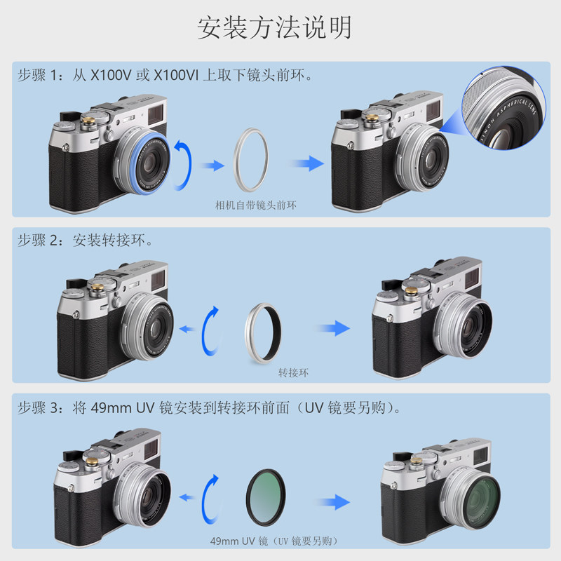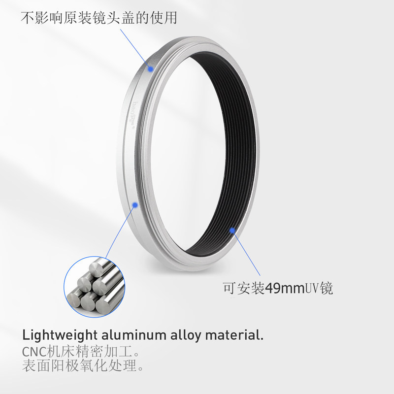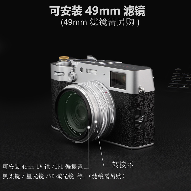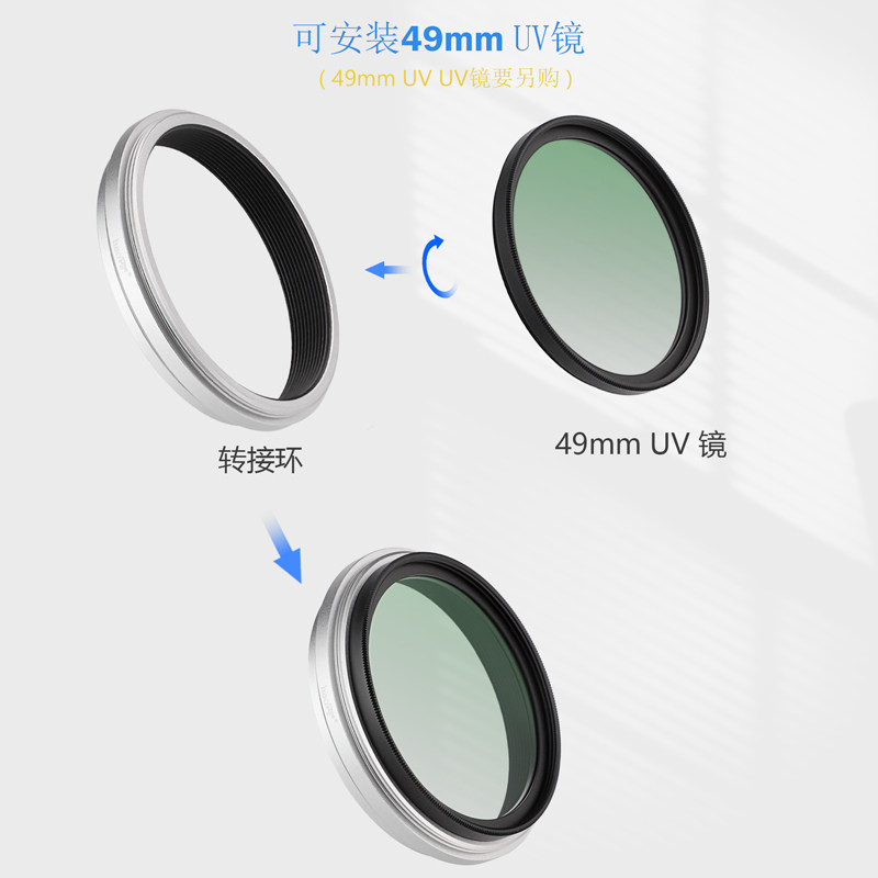 產品簡介:號歌濾鏡轉接環,專為富士X100VI/X100V相機設計,裝上轉接環后,它能為以上機型提供一個49mm的口徑,從而相機能使用口徑為49mm的濾鏡和鏡頭蓋了。方便攝影者使用各種49MM的濾鏡進行創作,加入對應的濾鏡后就能獲得特定的拍攝效果。不會影響變焦,四周也不會產生暗角或者黑影。