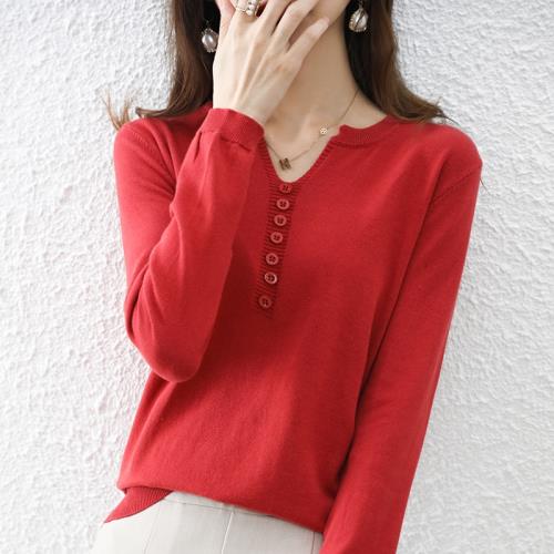 全棉線長袖打底針織衫女士V領套頭寬松短款純色百搭內搭純棉線女