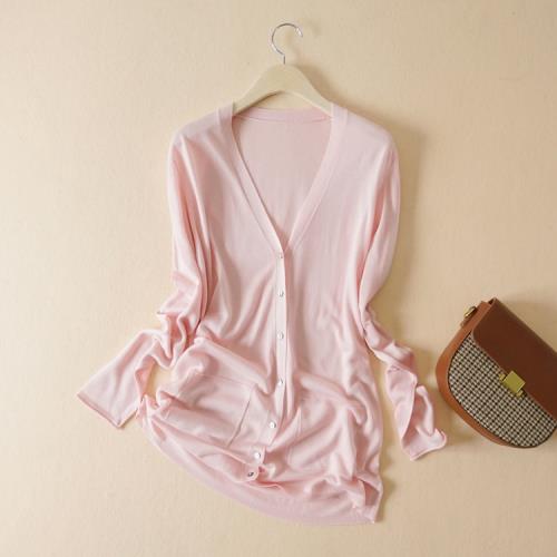 春秋款簡約基礎百搭舒適透氣絹絲+棉V領長袖薄款針織開衫防曬衫女