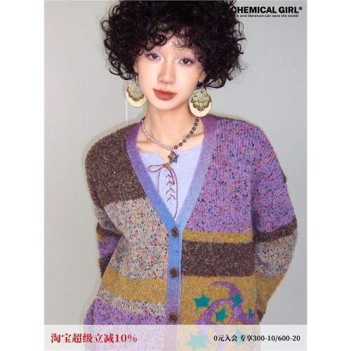 化學少女「星星圓夢曲」復古彩點提花拼接針織開衫外套女秋冬毛衣