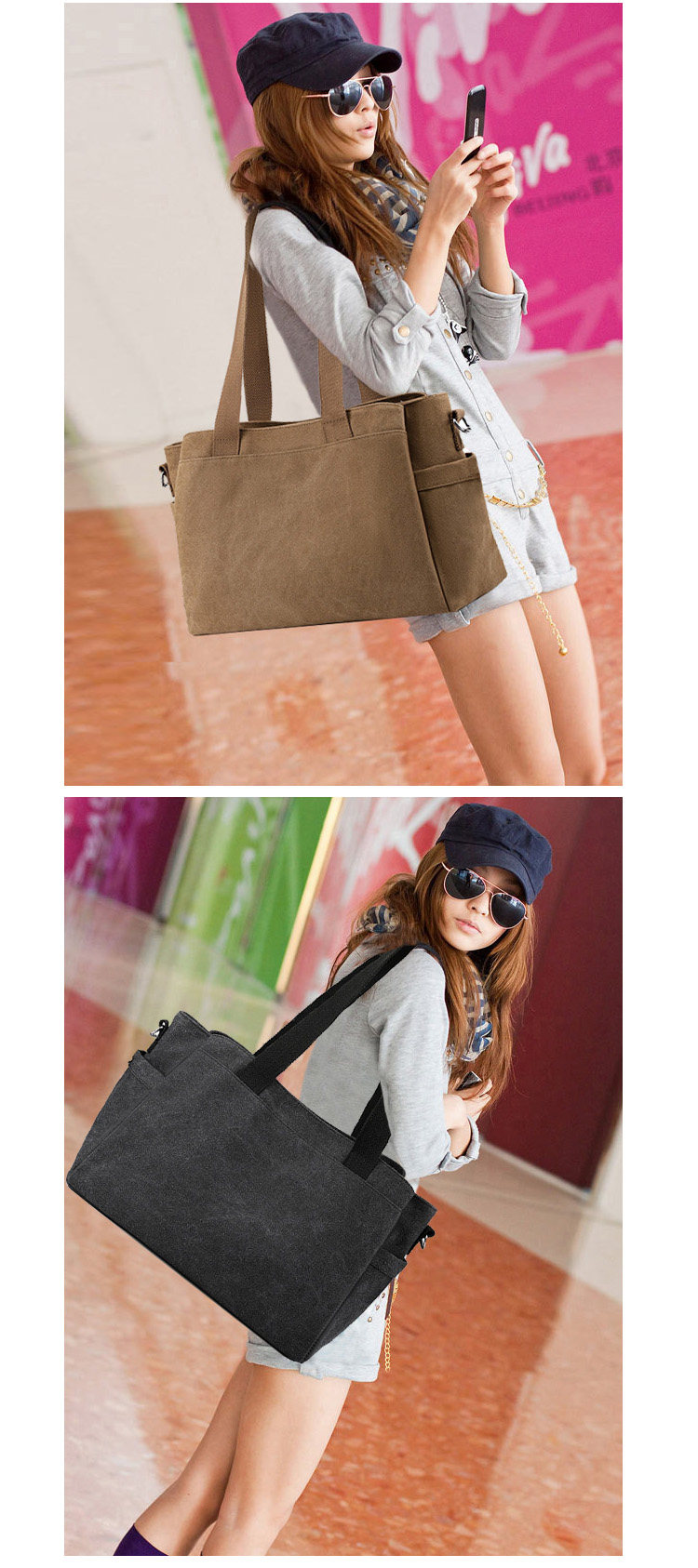 提示:購買前,請您仔細看一下商品尺寸!【尺寸】包包底長34厘米,包包高27厘米,包包底寬14厘米,手提帶高度30厘米。(誤差1至3cm)【材質】帆布材質,材質偏軟。【重量】大約0.58KG。【結構】包包主袋拉鏈封口;包包正面有一個大的搭扣裝袋,可以放一些東西;主袋內有一個拉鏈暗袋,一個手機袋和一個證件袋;包包背面有一個大的搭扣裝袋和一個拉鏈暗袋;兩個側面均有小袋,可以放短雨傘,礦泉水和水杯等等。(每批貨的內襯顏色和圖案可能不一樣)【款式】可手提,單肩,斜挎,配有一根長帶子。
