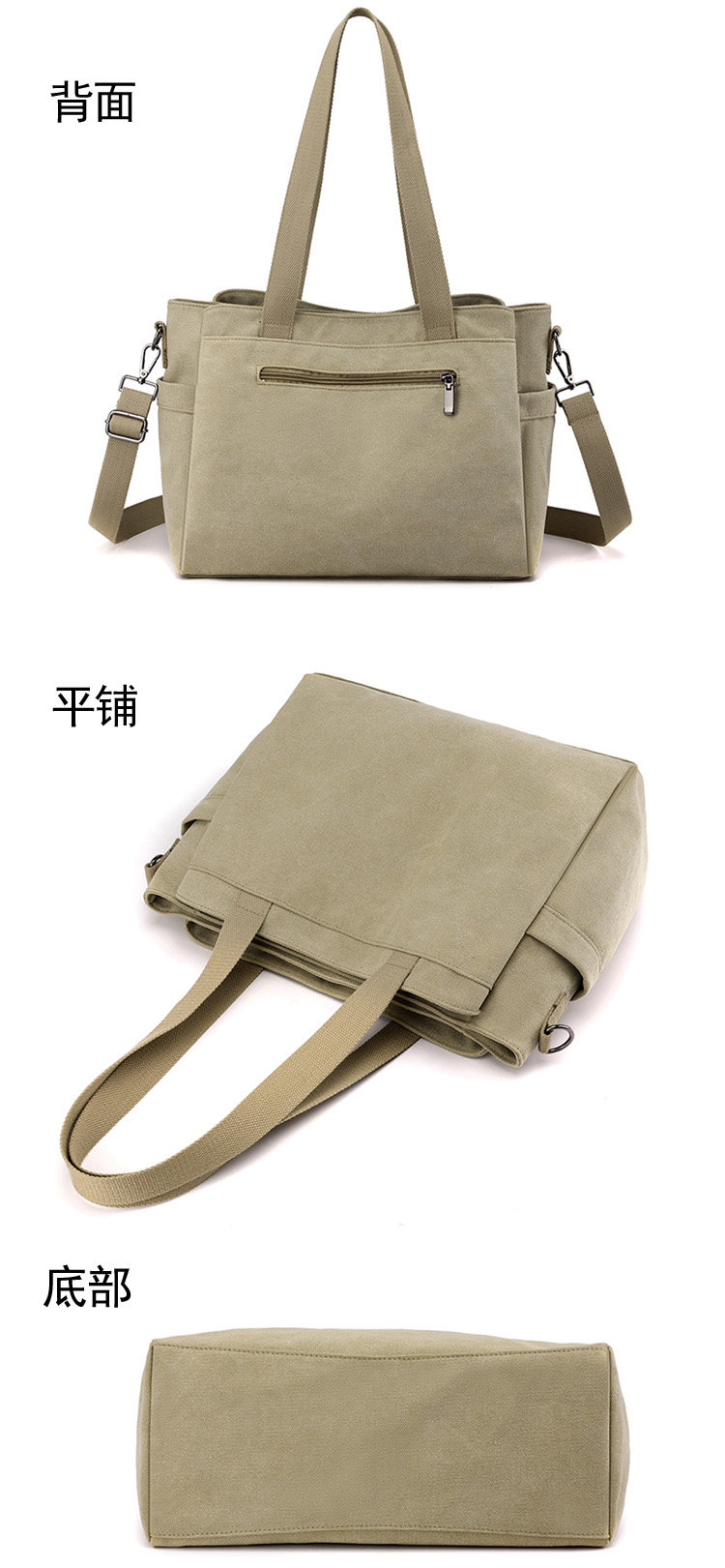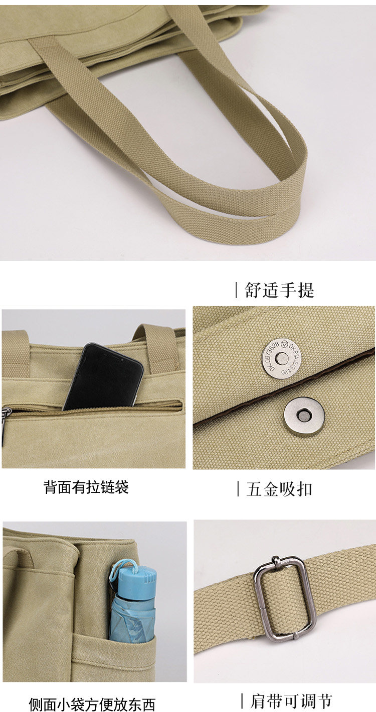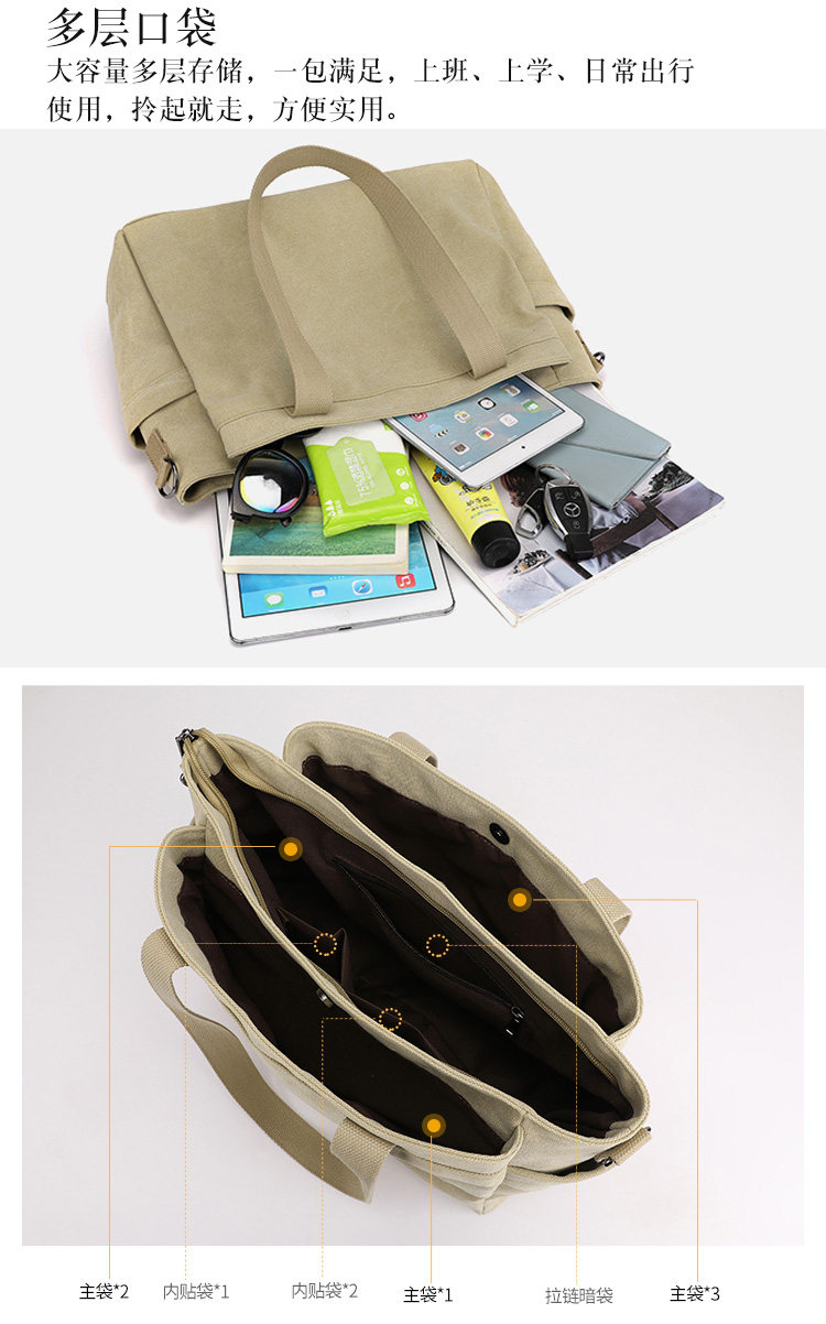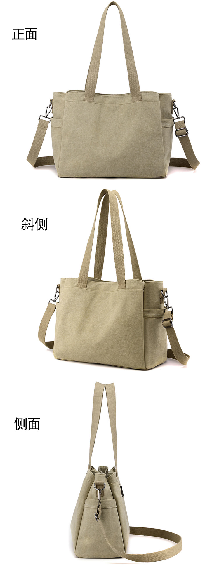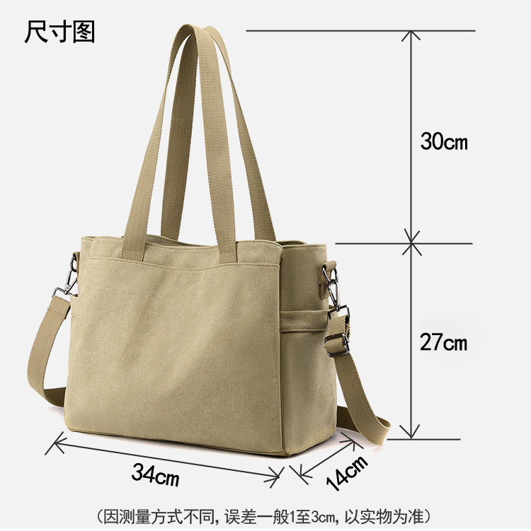 提示:購買前,請您仔細看一下商品尺寸!【尺寸】包包底長34厘米,包包高27厘米,包包底寬14厘米,手提帶高度30厘米。(誤差1至3cm)【材質】帆布材質,材質偏軟。【重量】大約0.58KG。【結構】包包主袋拉鏈封口;包包正面有一個大的搭扣裝袋,可以放一些東西;主袋內有一個拉鏈暗袋,一個手機袋和一個證件袋;包包背面有一個大的搭扣裝袋和一個拉鏈暗袋;兩個側面均有小袋,可以放短雨傘,礦泉水和水杯等等。(每批貨的內襯顏色和圖案可能不一樣)【款式】可手提,單肩,斜挎,配有一根長帶子。