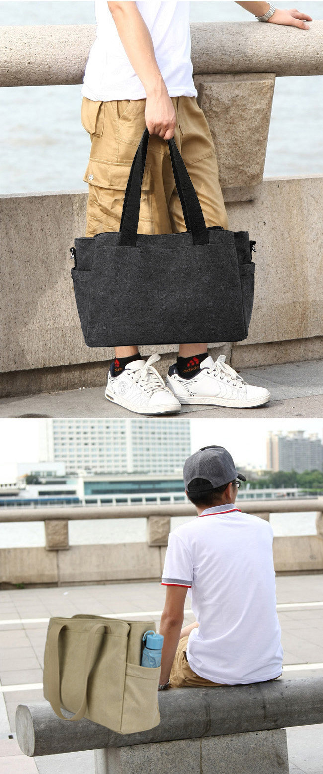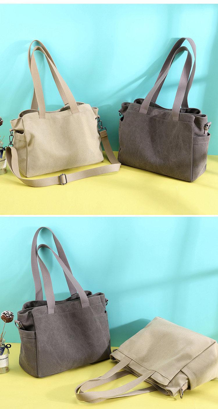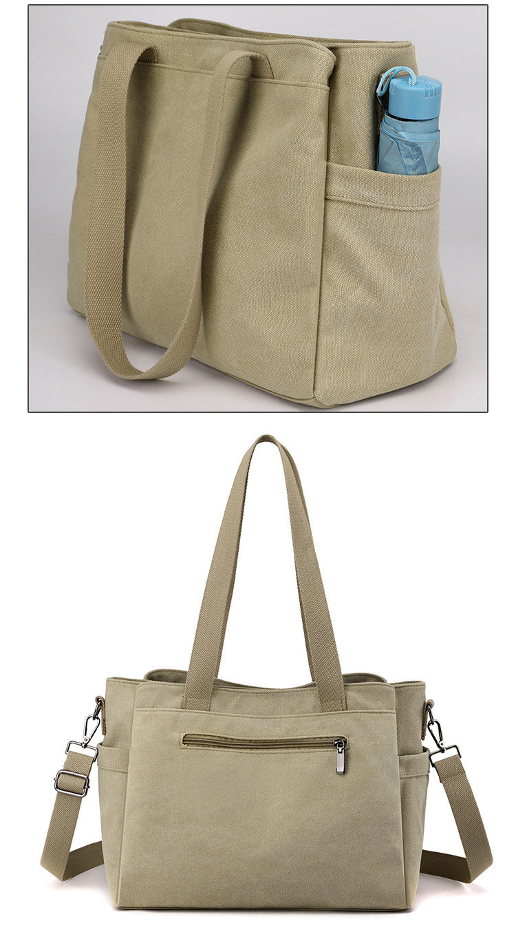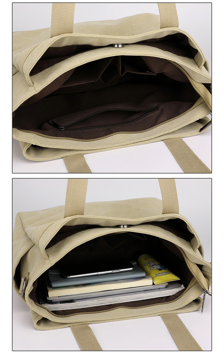 提示:購買前,請您仔細看一下商品尺寸!【尺寸】包包底長34厘米,包包高27厘米,包包底寬14厘米,手提帶高度30厘米。(誤差1至3cm)【材質】帆布材質,材質偏軟。【重量】大約0.58KG。【結構】包包主袋拉鏈封口;包包正面有一個大的搭扣裝袋,可以放一些東西;主袋內有一個拉鏈暗袋,一個手機袋和一個證件袋;包包背面有一個大的搭扣裝袋和一個拉鏈暗袋;兩個側面均有小袋,可以放短雨傘,礦泉水和水杯等等。(每批貨的內襯顏色和圖案可能不一樣)【款式】可手提,單肩,斜挎,配有一根長帶子。