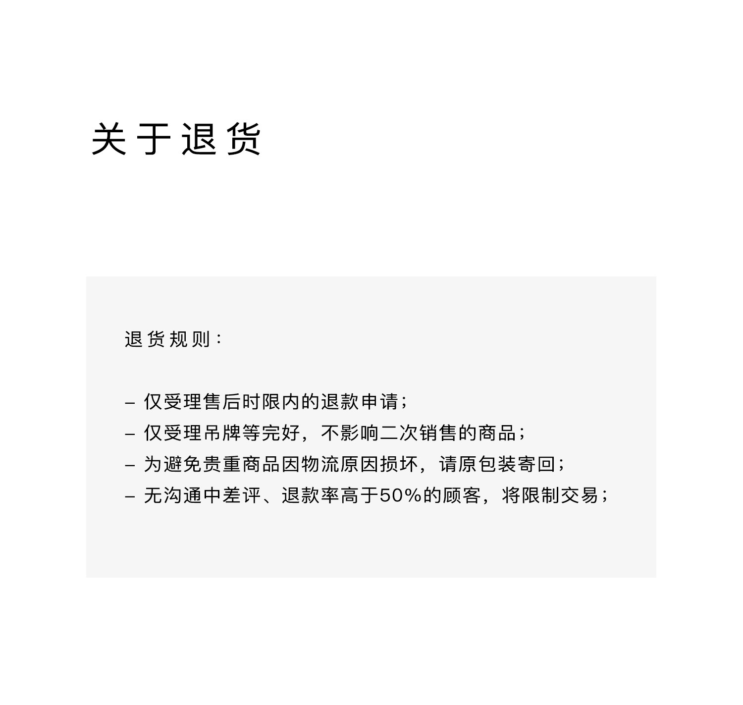 因商品為海外寄送,若拒收包裹,包裹將會退回海關並被銷毀,且訂單款項不會退款。請務必在下單前確認收件地址及商品內容無誤。 - 非瑕疵商品退貨手續費