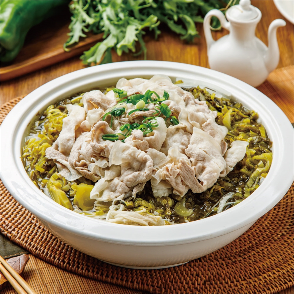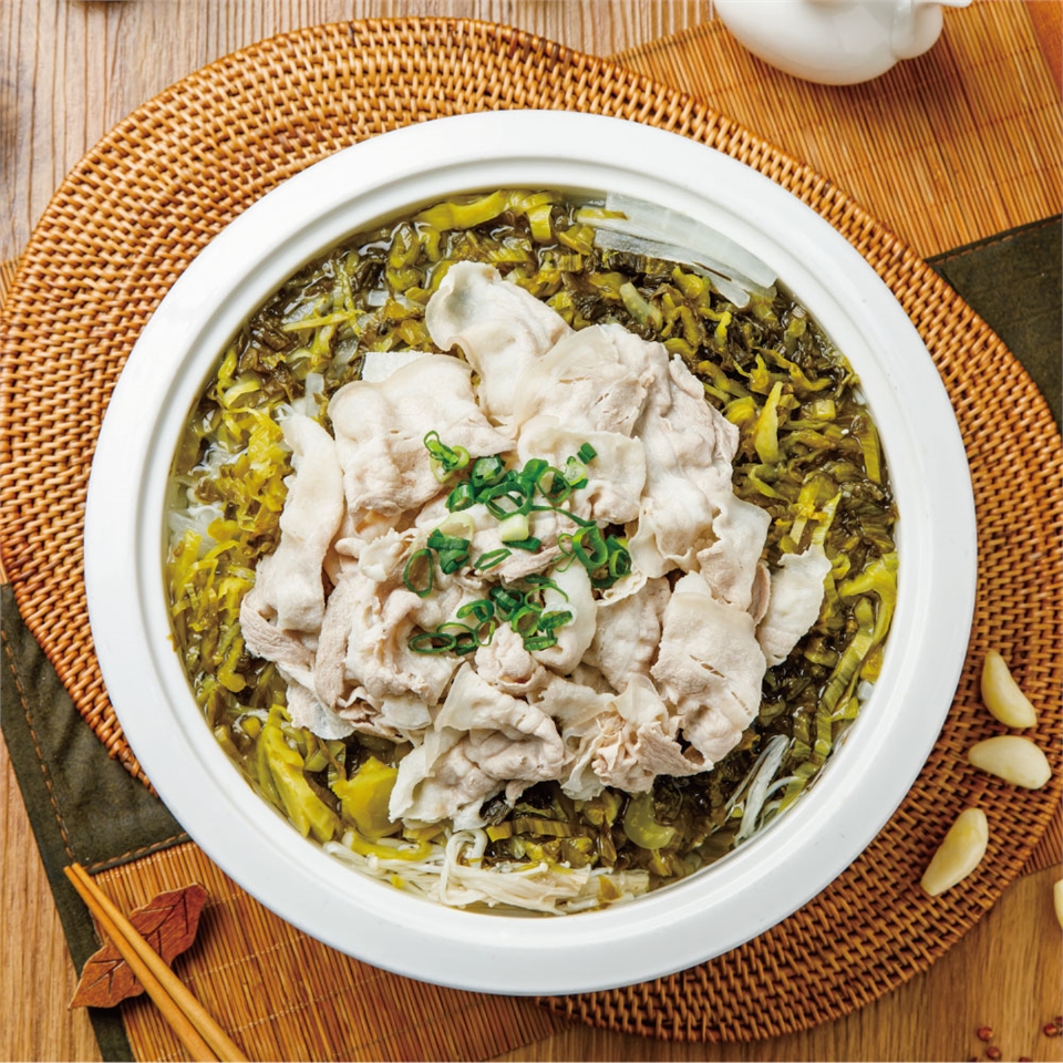 嚴選傳統客家酸菜,結合特調濃醇高湯,佐以白蘿蔔、金針菇及嫩滑五花肉片,融合鹹香酸菜湯汁,多層次的口感,令人胃口大開。