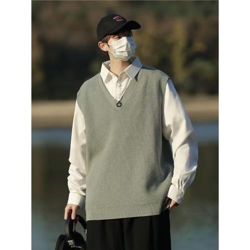假兩件針織襯衫男秋冬季休閑毛衣背心馬甲拼接襯衣外套學院風上衣