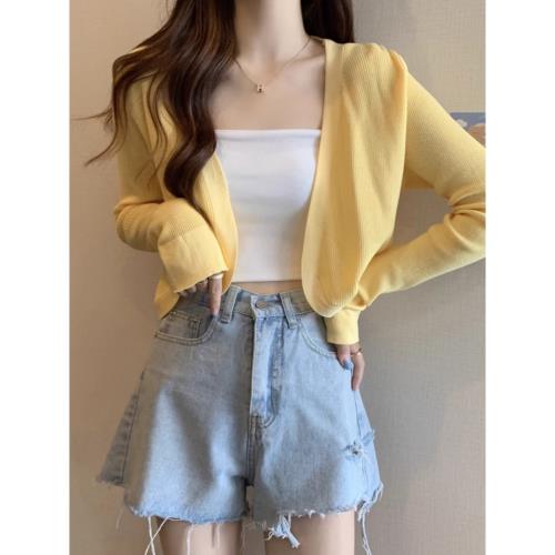 法式黃色小披肩女夏季冰絲罩衫防曬針織開衫配吊帶裙外搭外套上衣