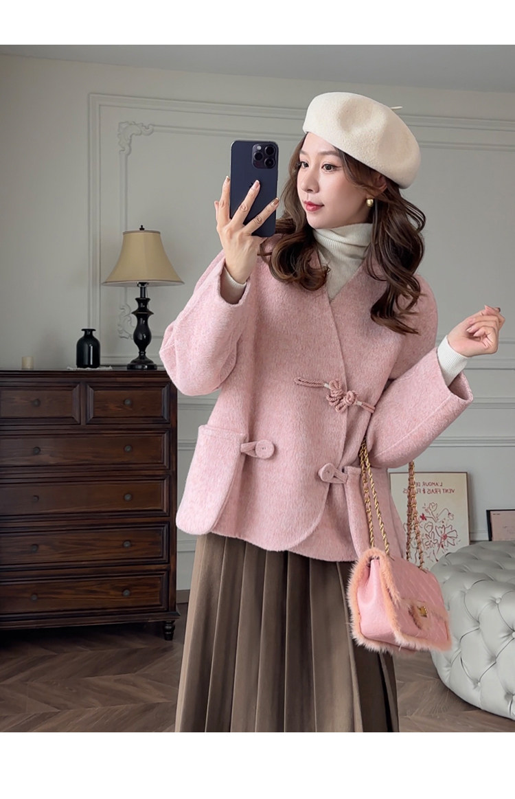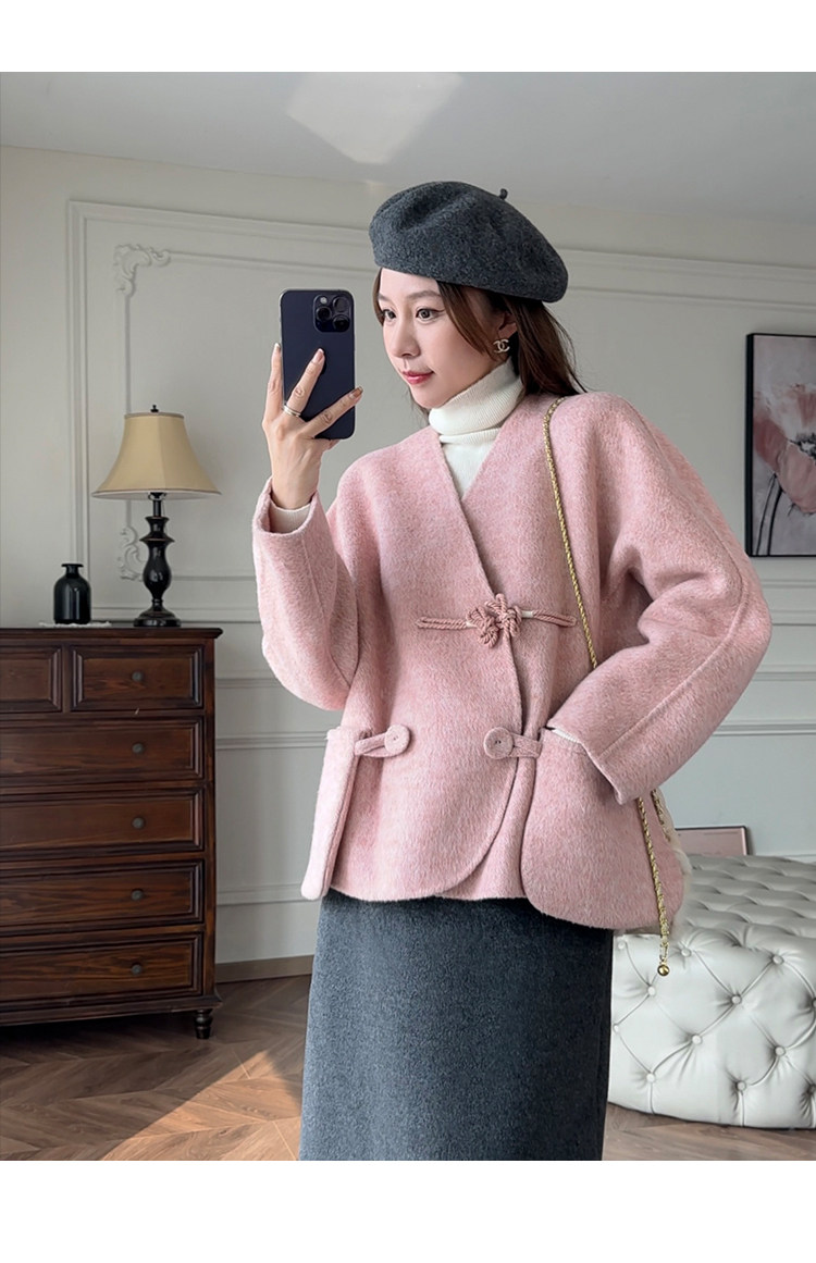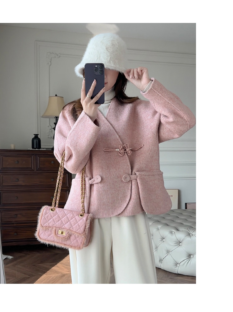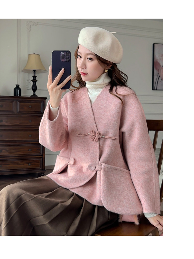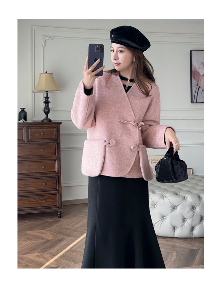 V字領型設計,疊門襟手作結繩打扣的中國結盤扣扣合彰顯復古韻味