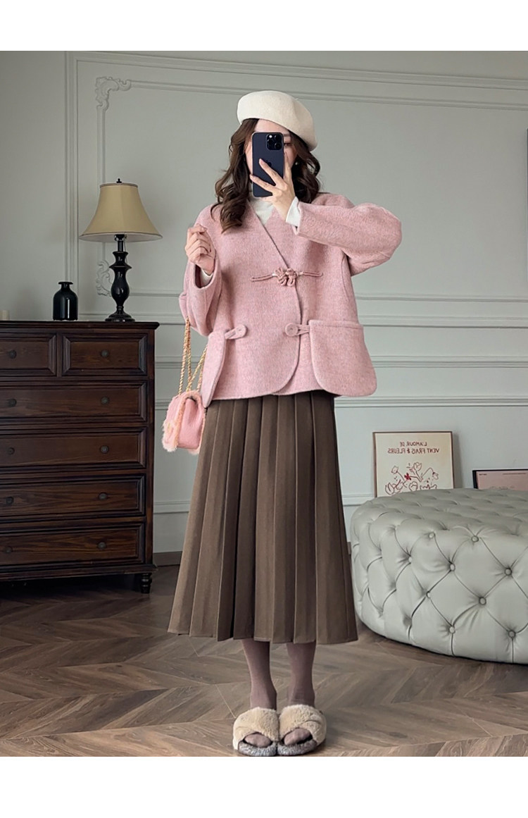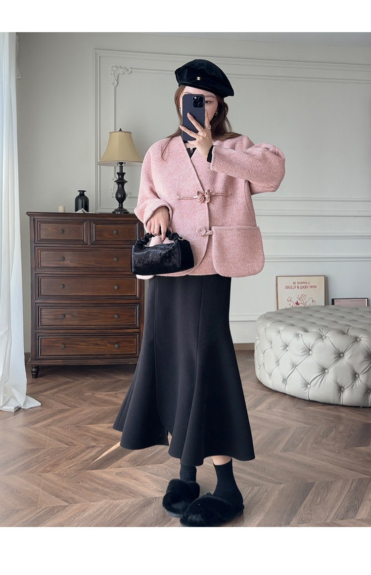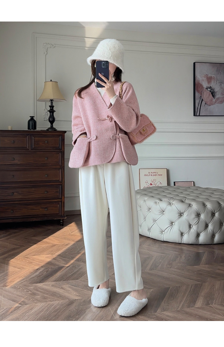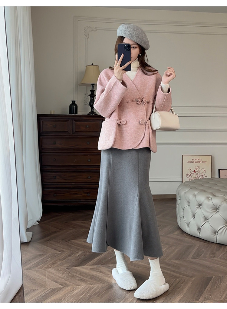 V字領型設計,疊門襟手作結繩打扣的中國結盤扣扣合彰顯復古韻味