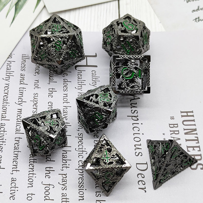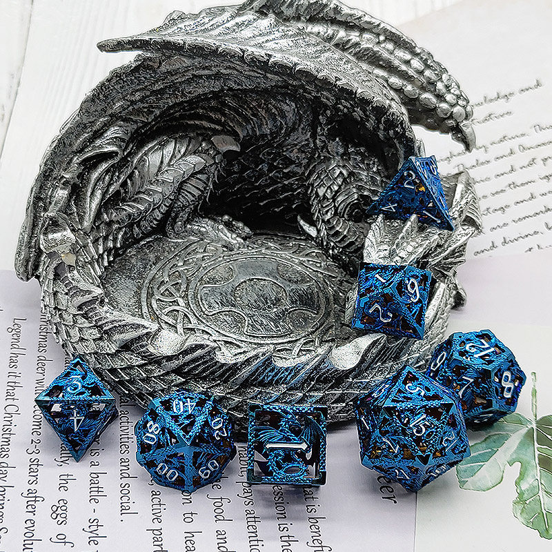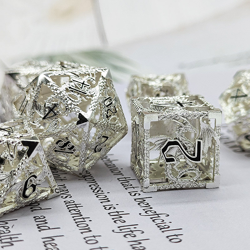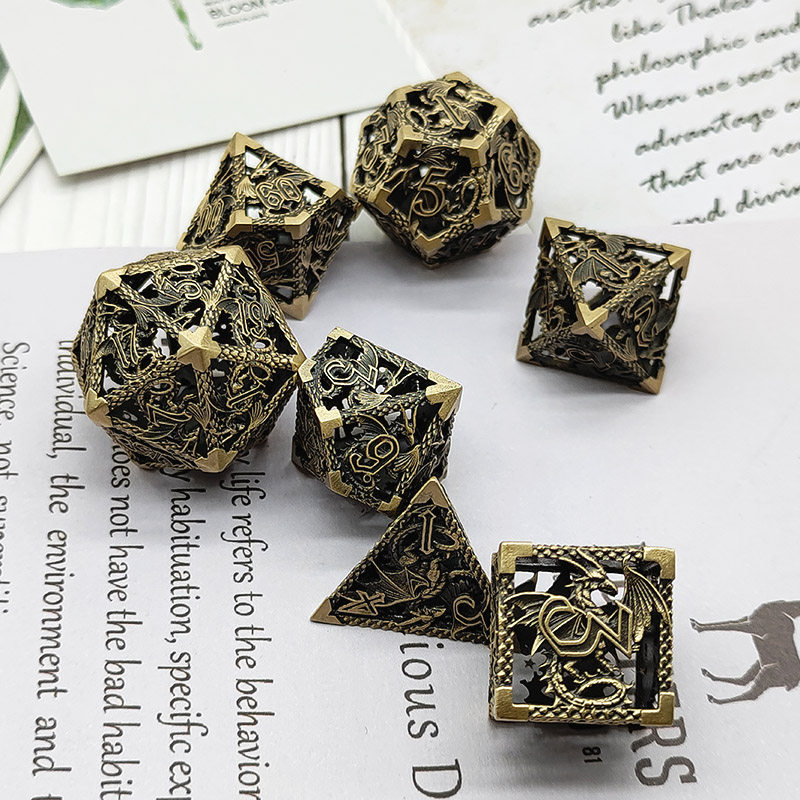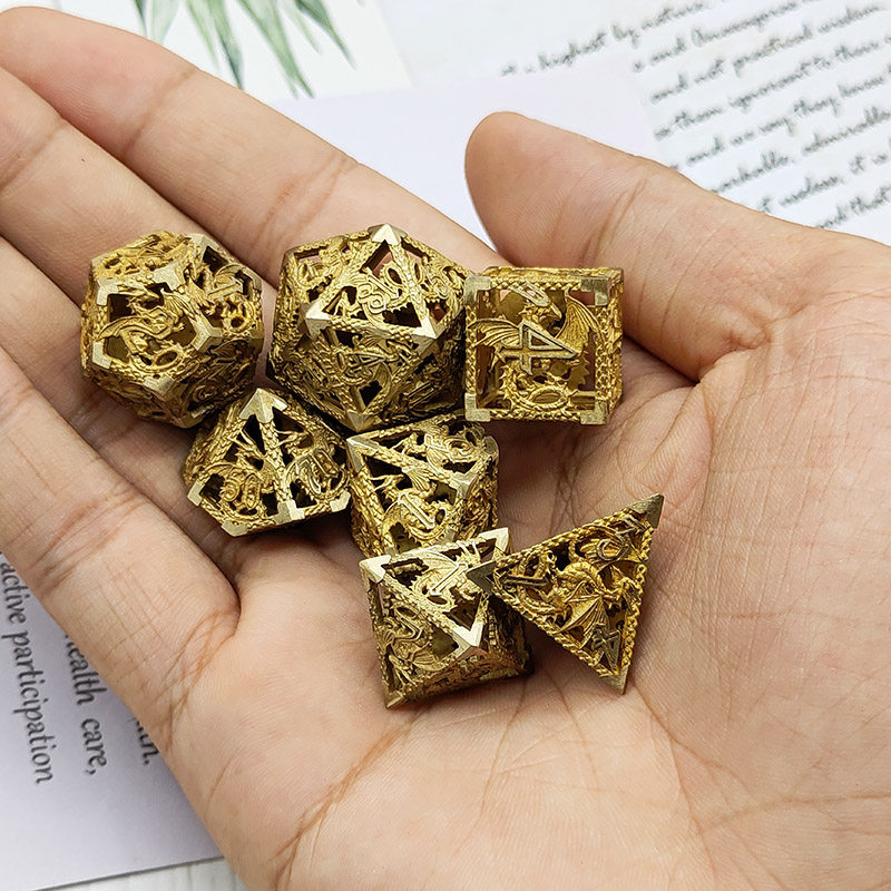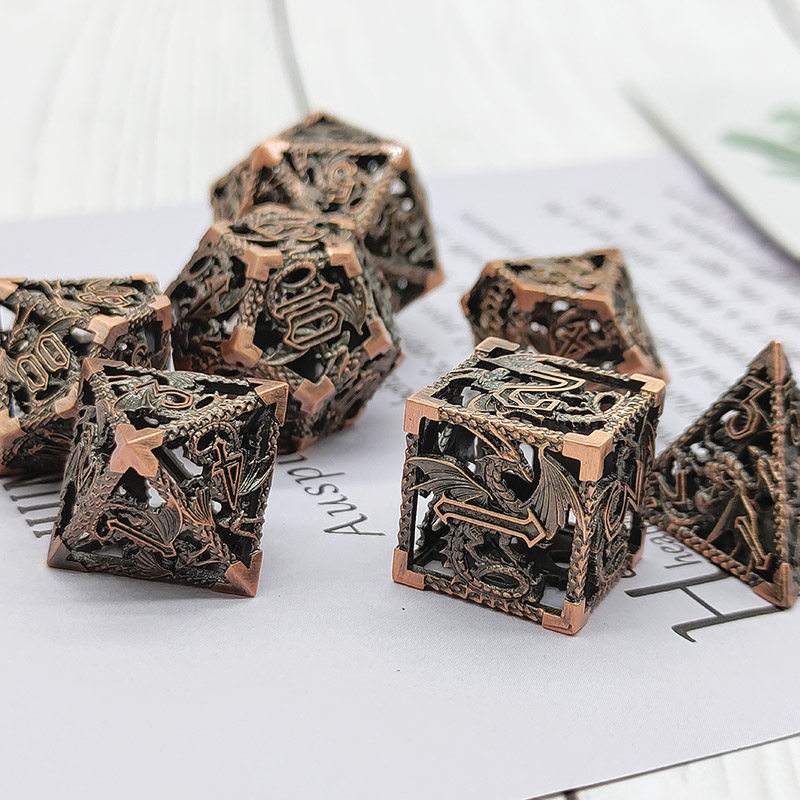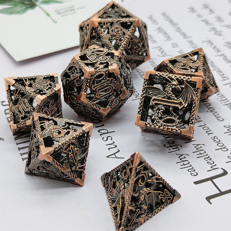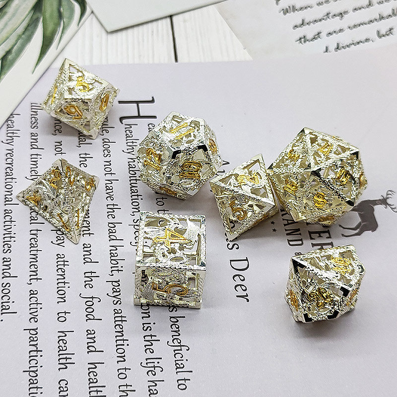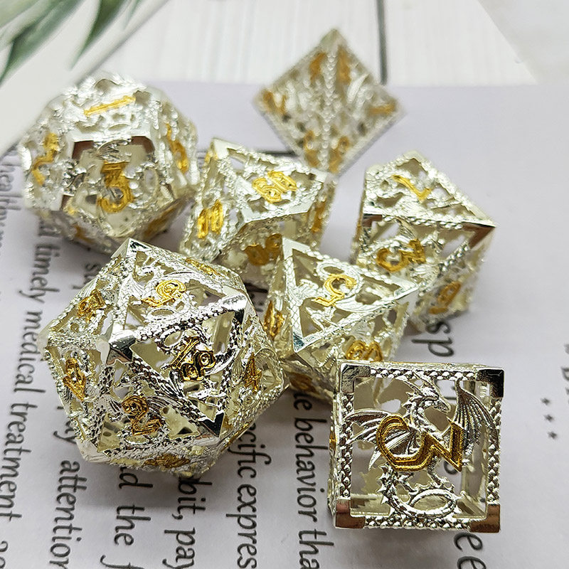 DND金屬龍空心骰子套裝,每套7個,送一個金屬包裝盒。包含:D4、D6、D8、D10(0-9)、D10(00-90)、D12、D20。