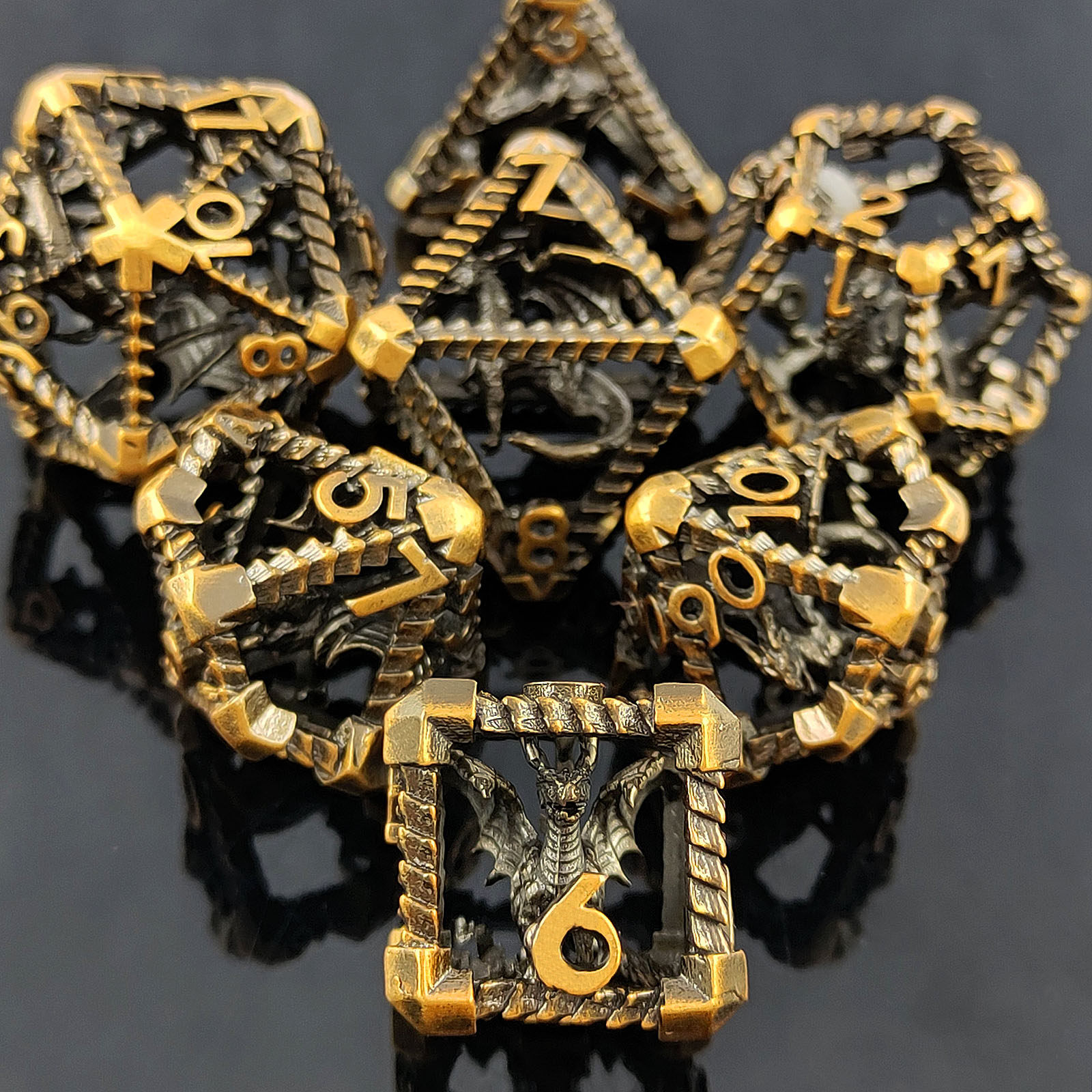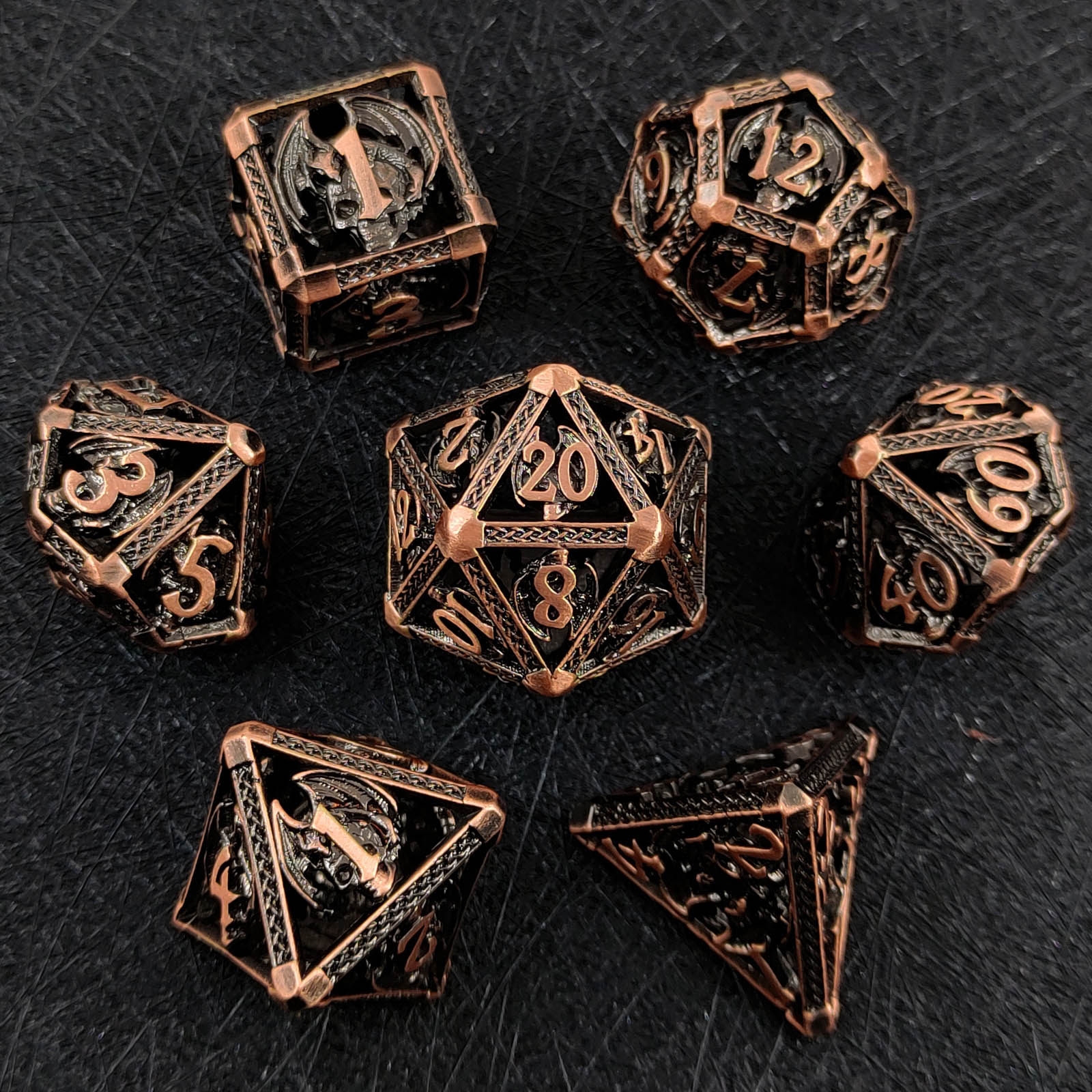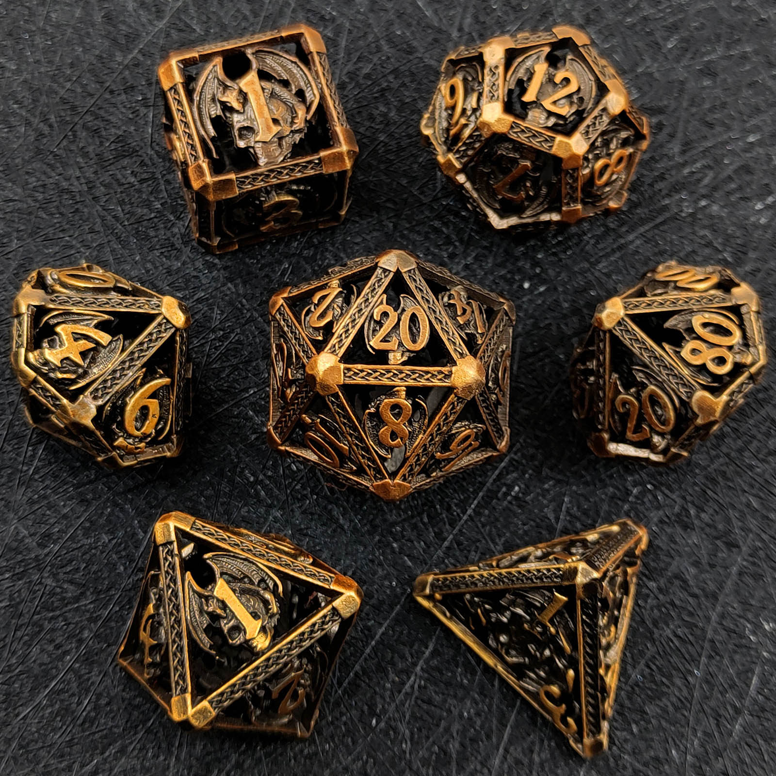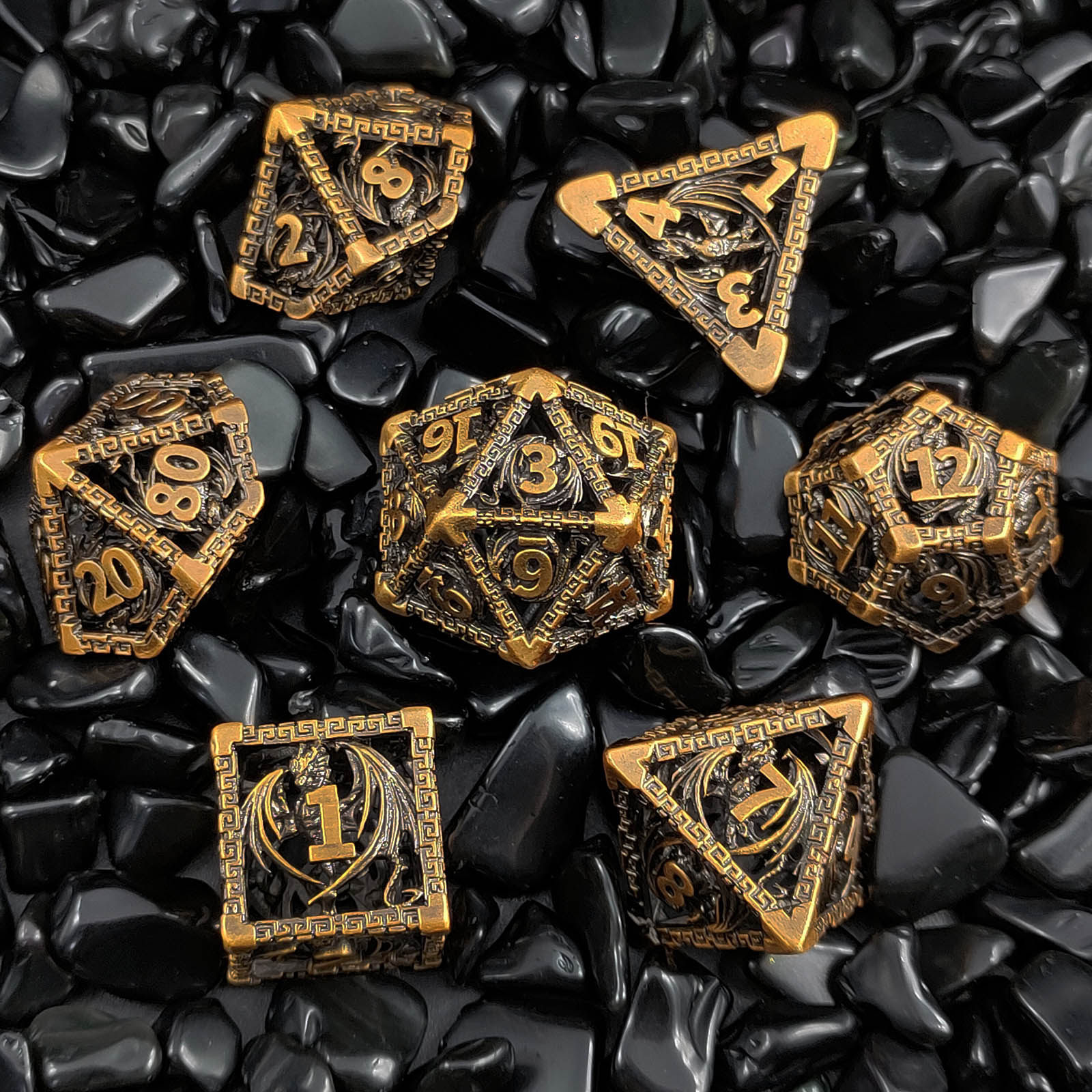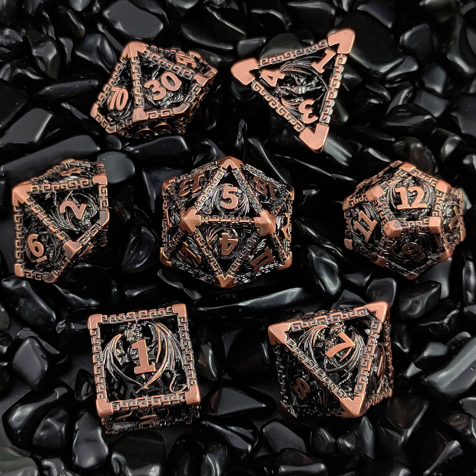 DND金屬龍空心骰子套裝,每套7個,送一個金屬包裝盒。包含:D4、D6、D8、D10(0-9)、D10(00-90)、D12、D20。