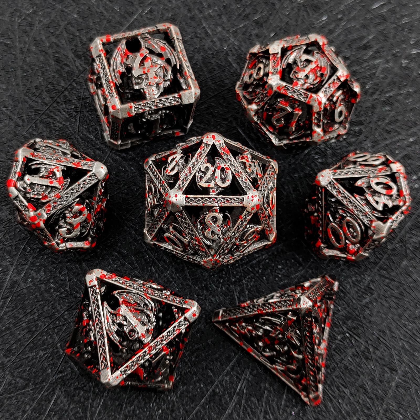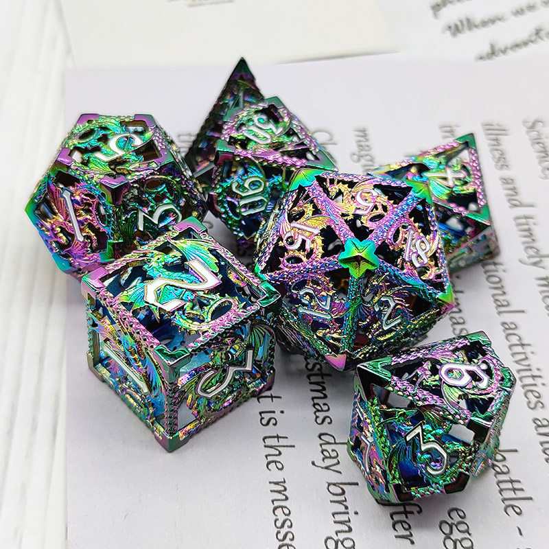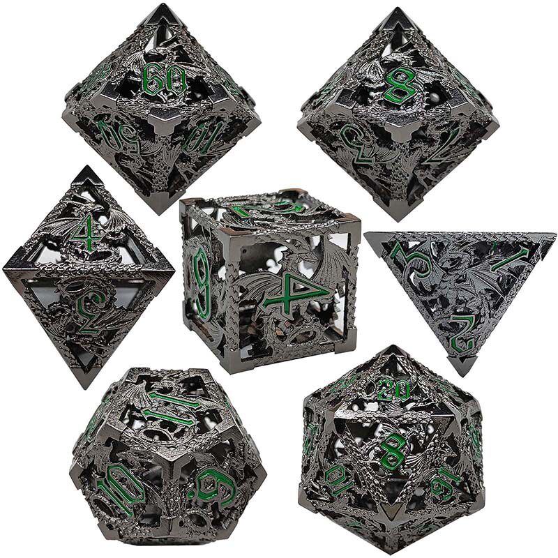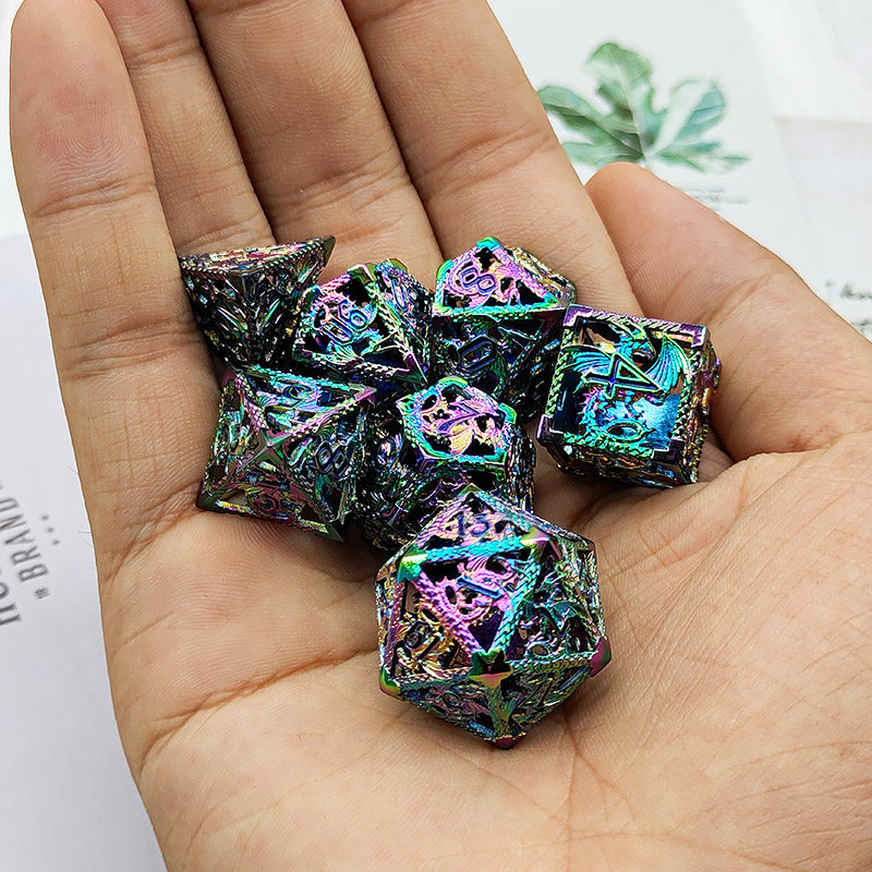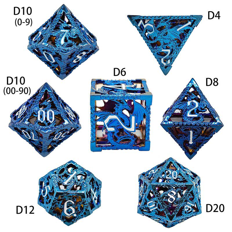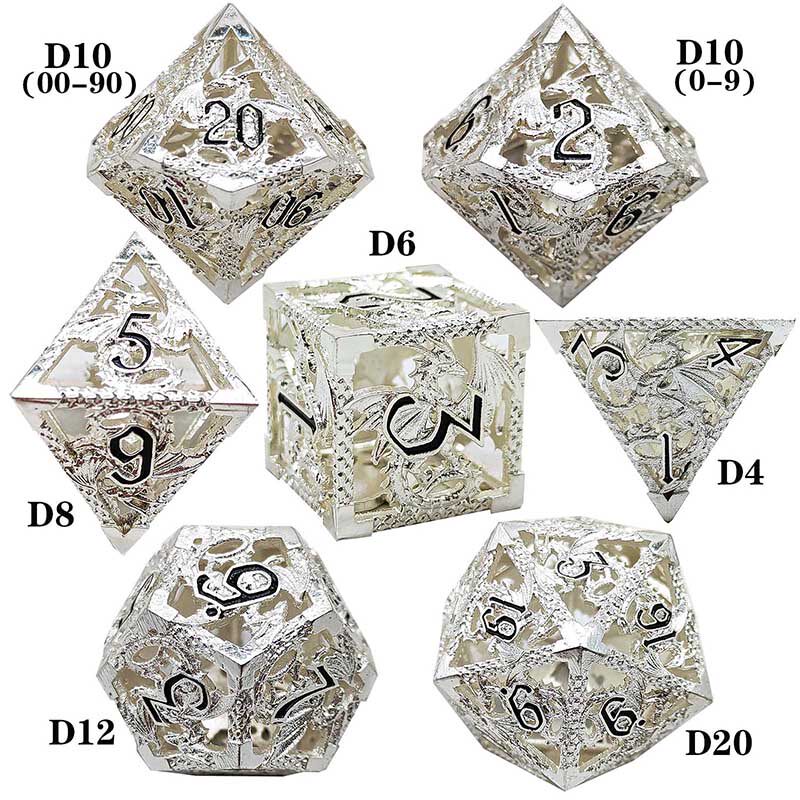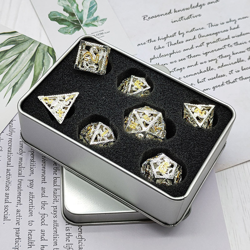 套餐包含:7顆金屬空心骰子,和一個金屬收納盒!骰子包括:D4,D6,D8,D10(0-9)D10(00-90),D12,D20
