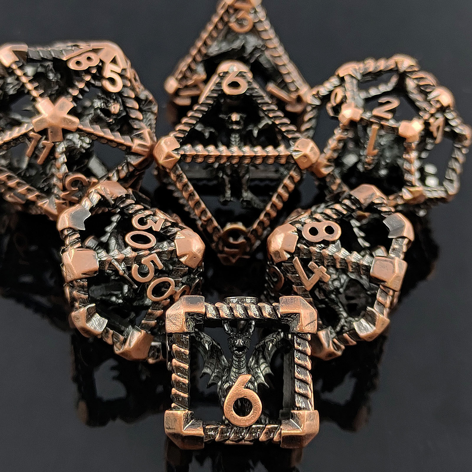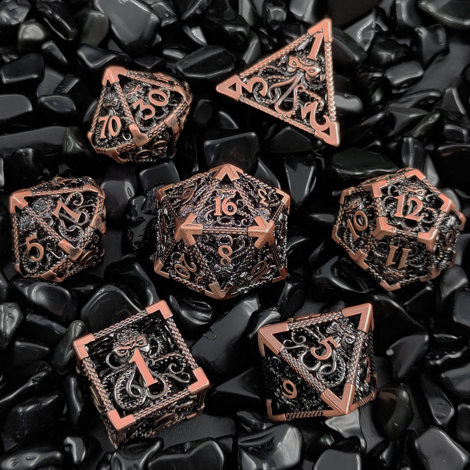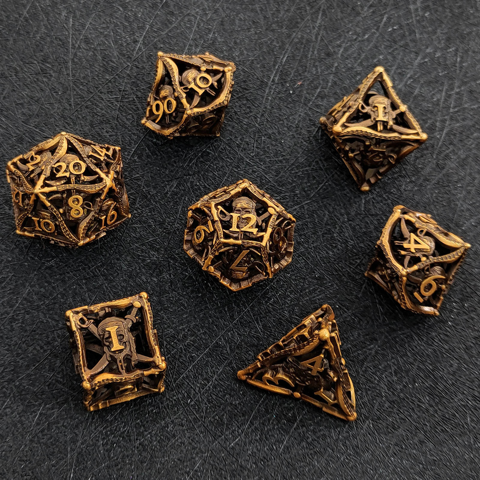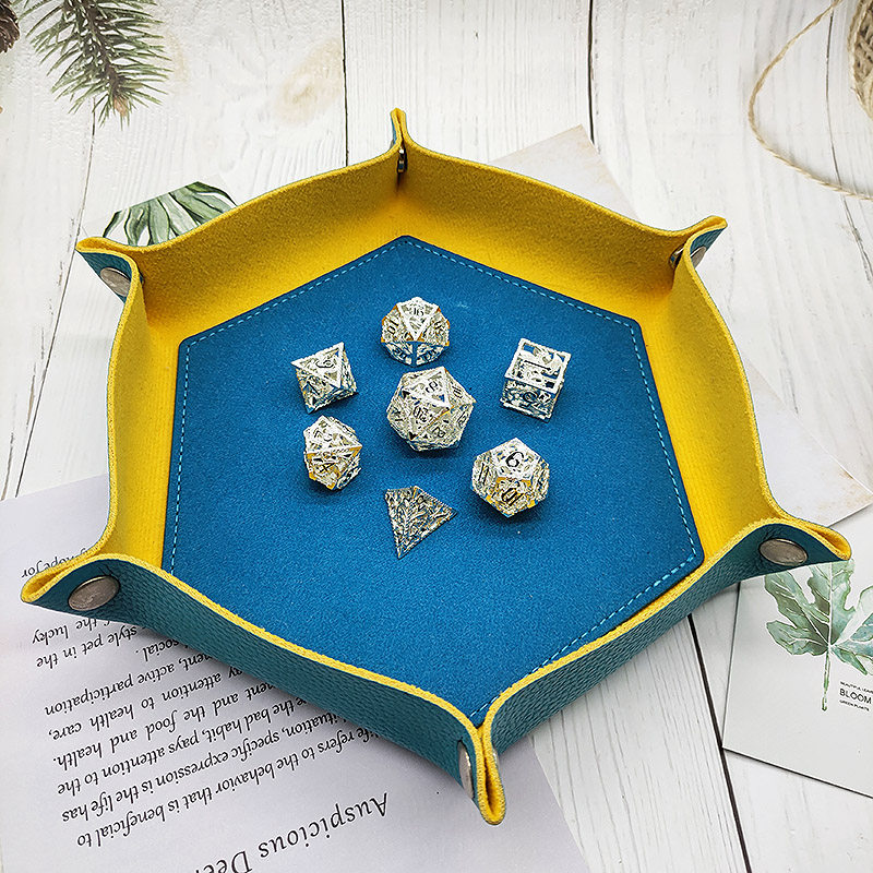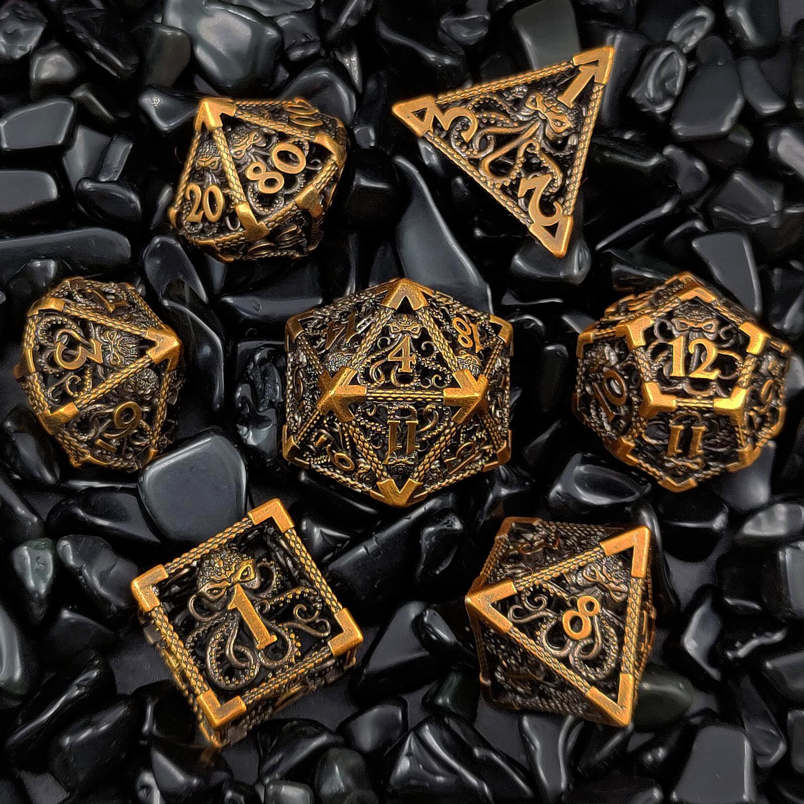 套餐包含:7顆金屬空心骰子,和一個金屬收納盒!骰子包括:D4,D6,D8,D10(0-9)D10(00-90),D12,D20