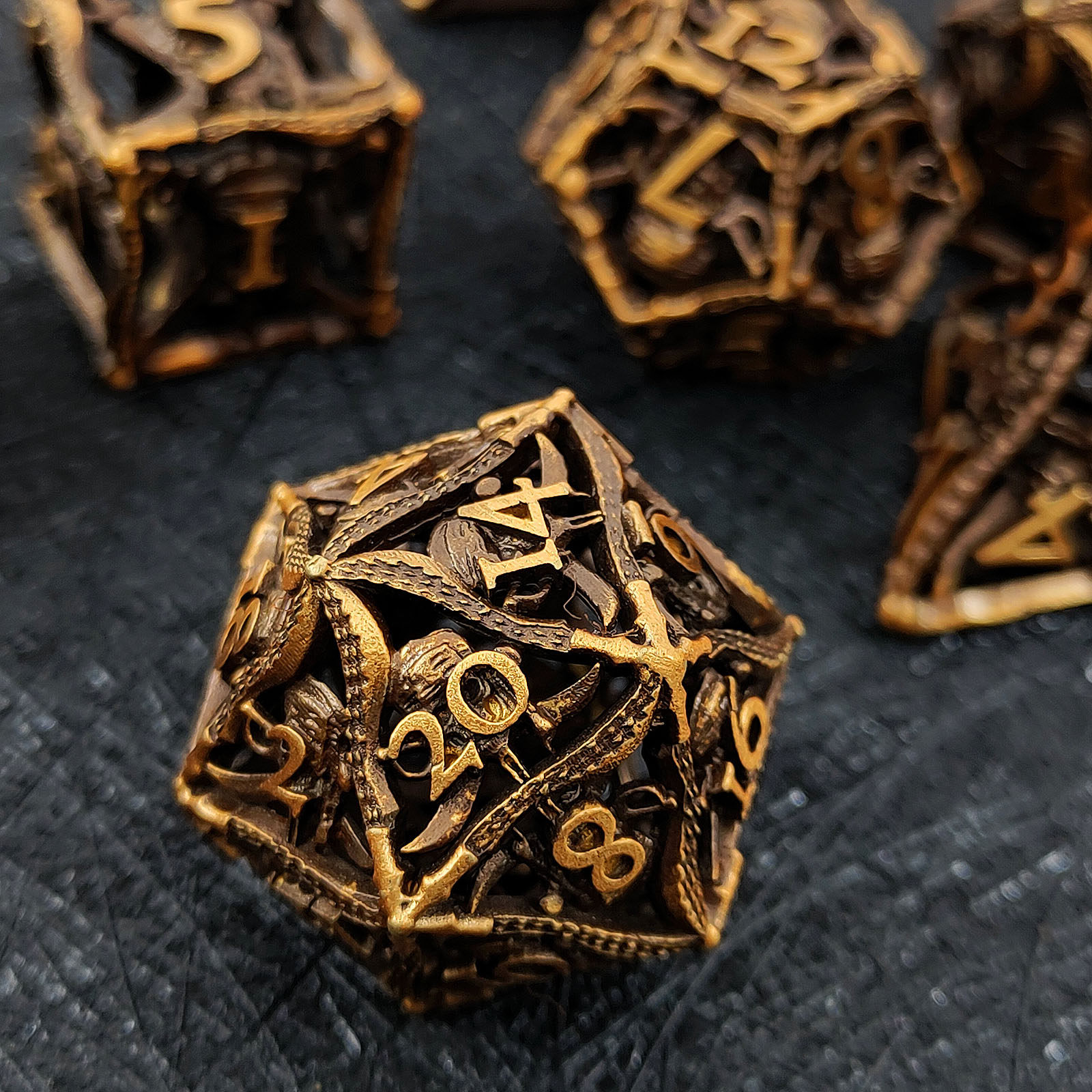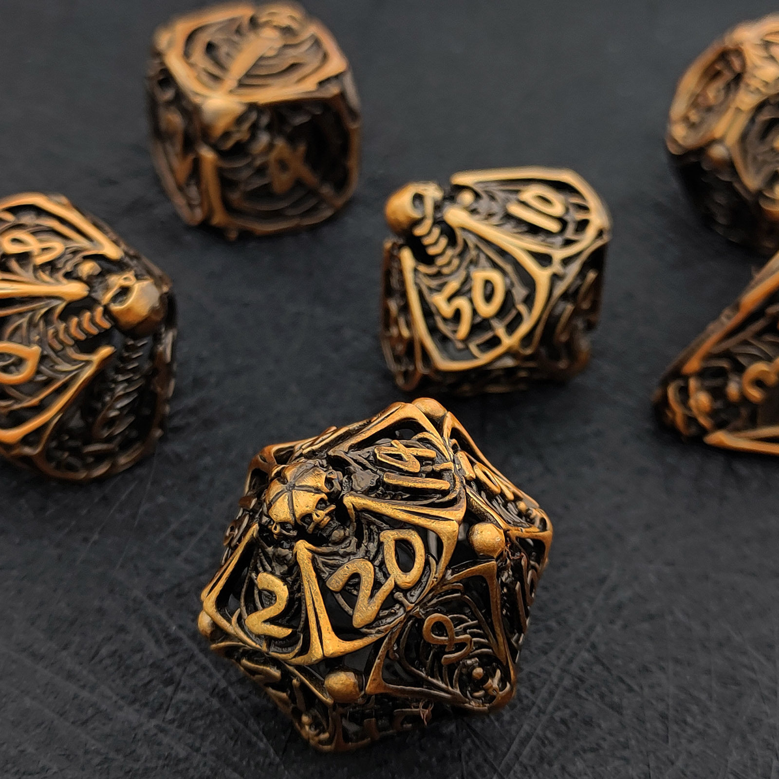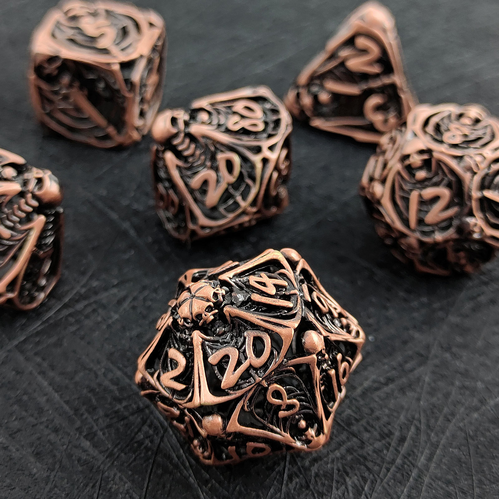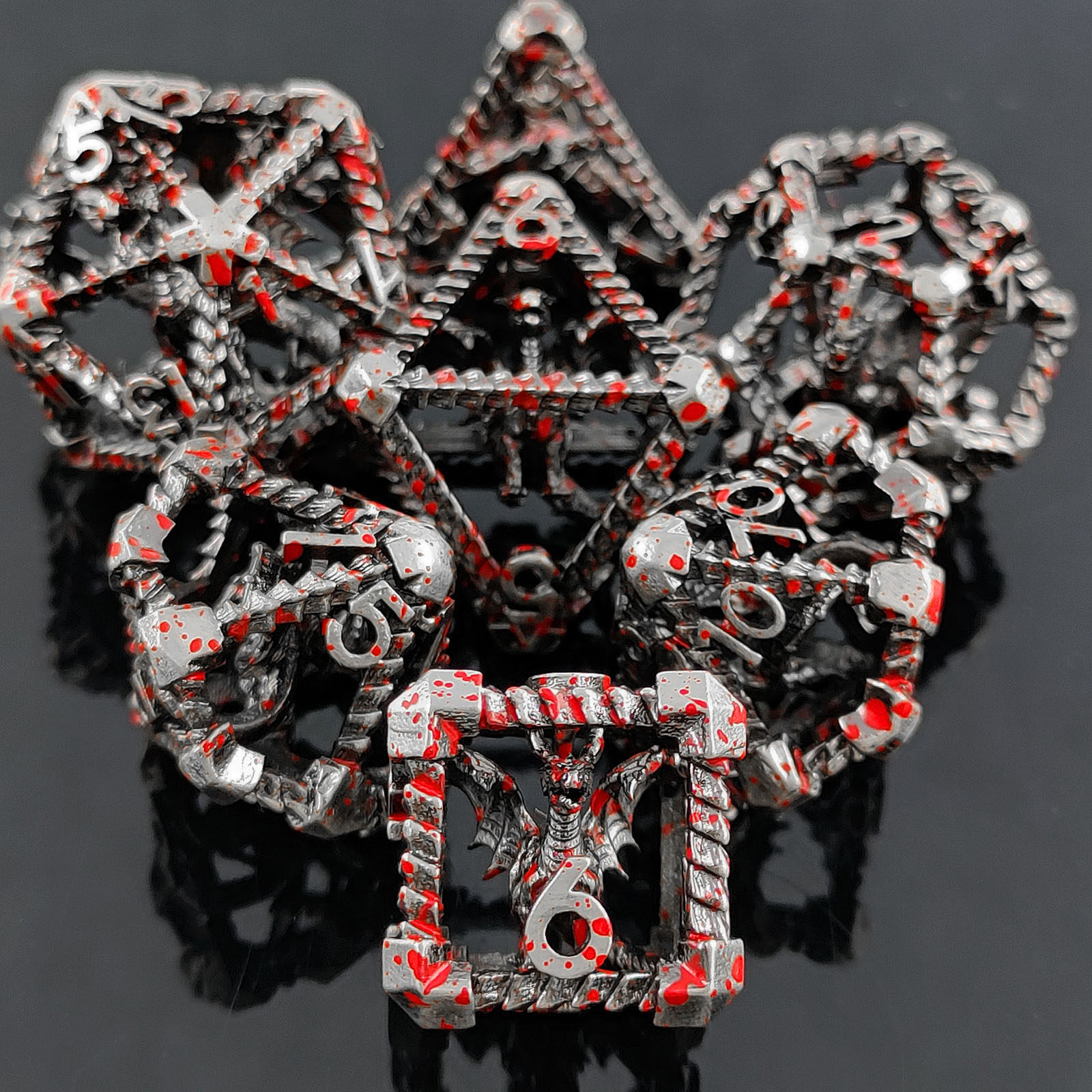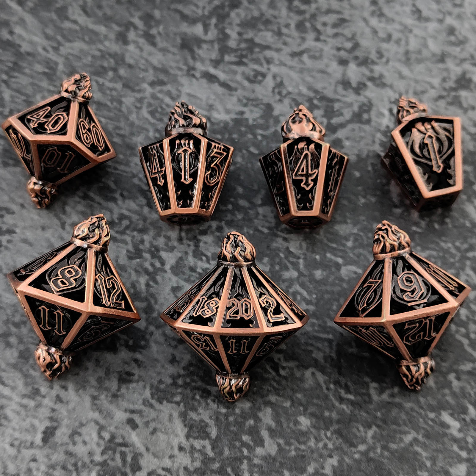 套餐包含:7顆金屬空心骰子,和一個金屬收納盒!骰子包括:D4,D6,D8,D10(0-9)D10(00-90),D12,D20