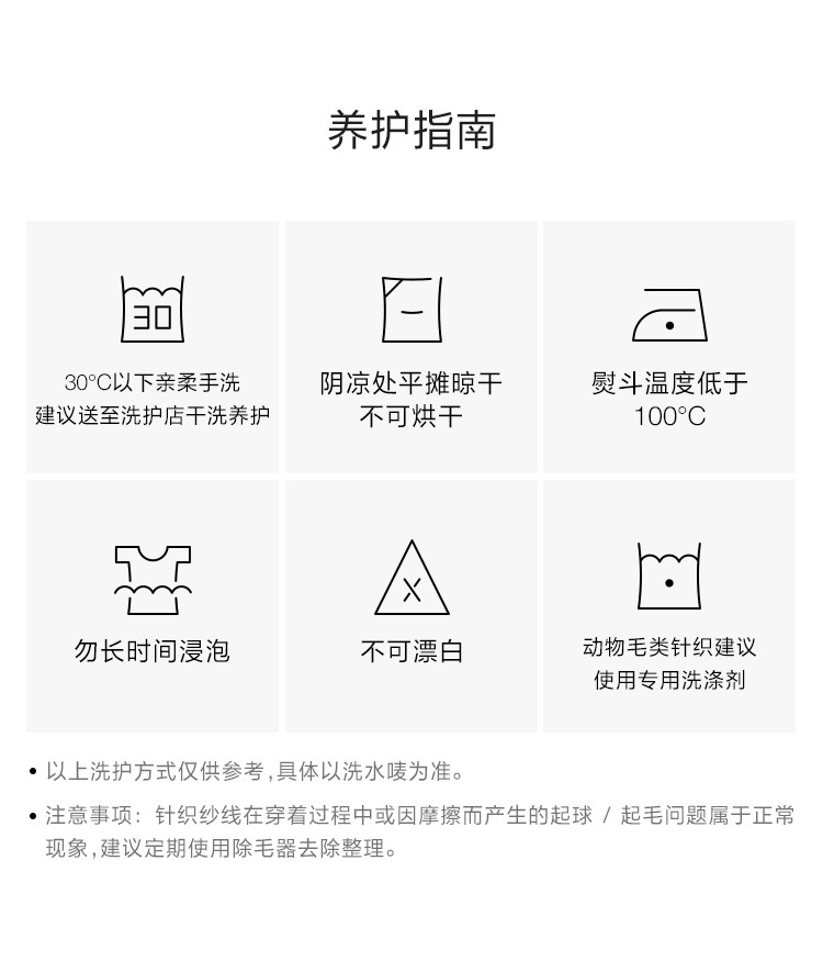 | 洗滌建議 | 針織衣服在洗滌前,拍去灰塵放在冷水中浸泡10~20分鐘,拿出后擠干水分,放入洗衣粉溶液或肥皂片溶液中輕輕搓洗,再用清水漂洗。為了保證毛線的色澤,可在水中滴入2%的醋酸(食用醋亦可)來中和殘留的肥皂。這樣針織衫洗后變大的可能性就降低了。 |
