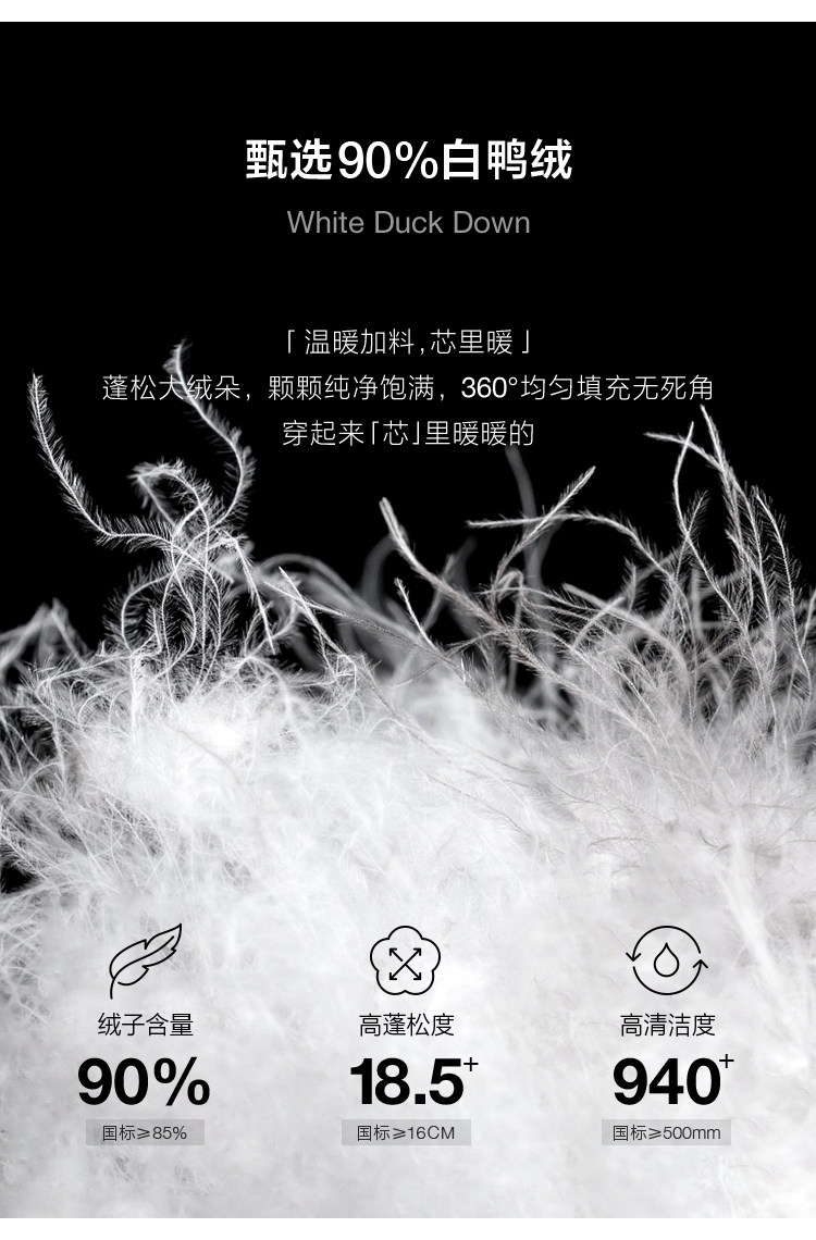 | 面 料 | 面料:聚酯纖維85%氨綸15%(薄膜除外),里料:錦綸100%,膽布:聚酯纖維100%, 填充物:白鴨絨, 絨子含量:90%, 充絨量:XS:150g S:155g M:165g L:175g XL:185g XXL:195g |