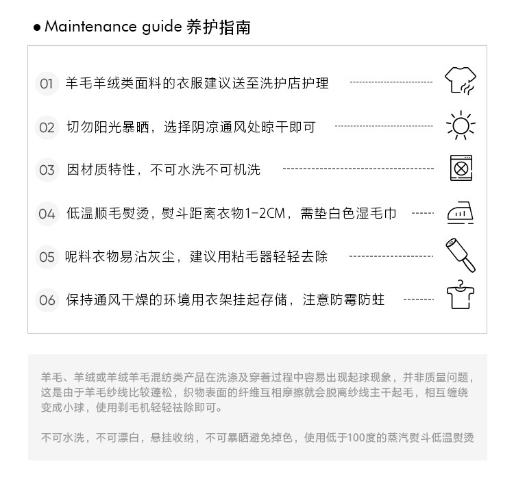 | 洗滌建議: | 對于毛呢大衣清洗我們建議是送到專業的干洗店去清洗。切勿水洗,機洗。 |