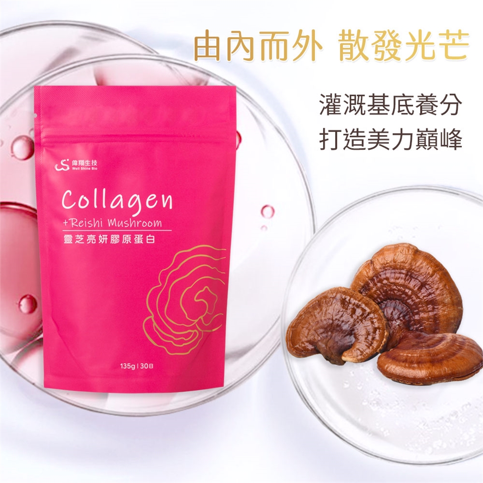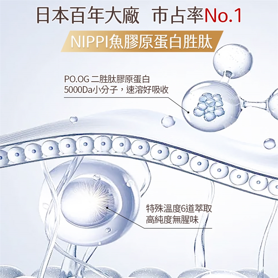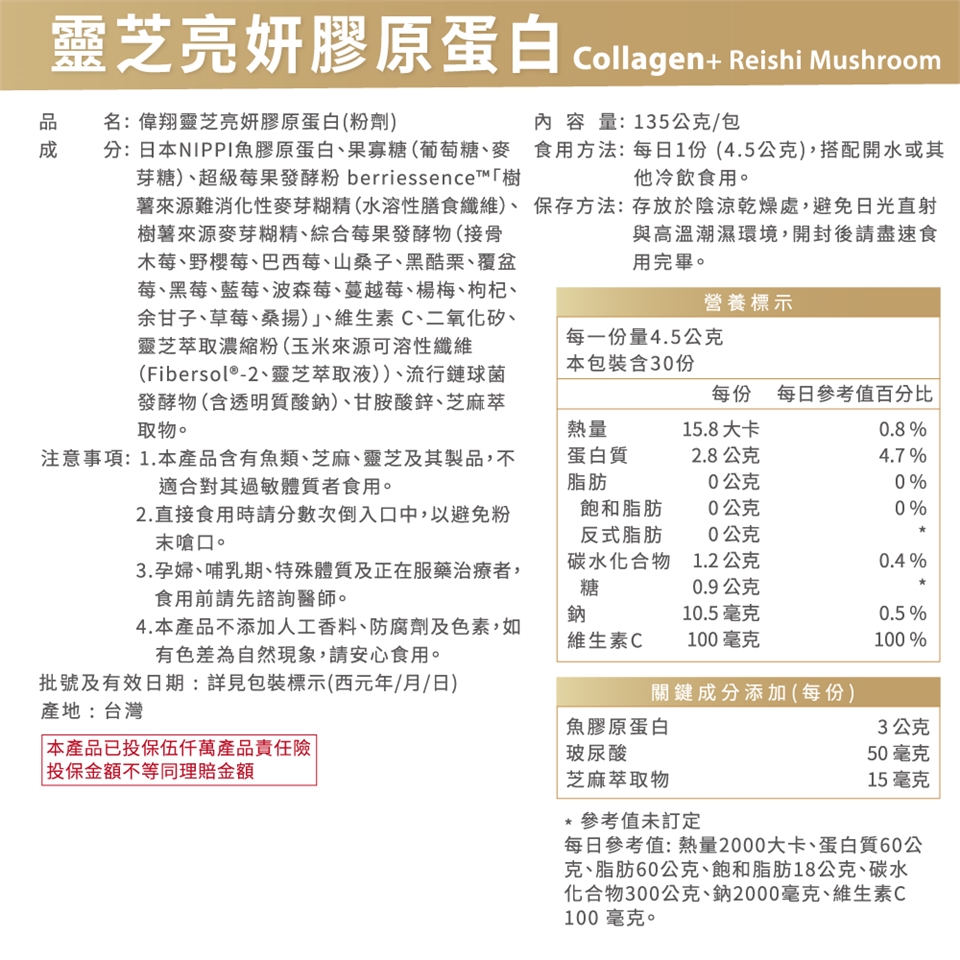 日本nippi膠原蛋白(每份3000mg)+台灣靈芝子實體,專利膠原蛋白製程,無腥味好吸收,還有淡淡莓果香,無添加化學香精及甜味劑,全方位美妍配方,給予肌膚基底養分,打造美力顛峰。
