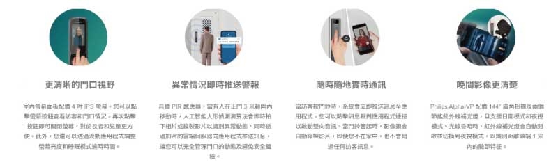 -異常情況即時推送警報,具備PIR感應器,當有人在正門3米範圍內移動時,人工智能人形偵測演算法會即時拍下相片或錄製影片以識別異常動態,
