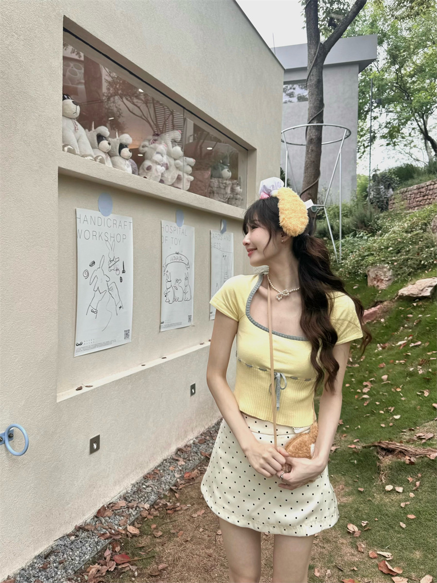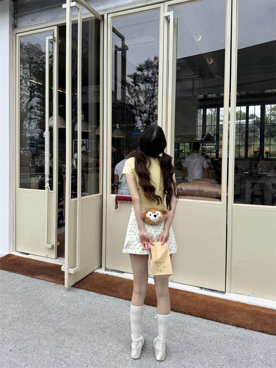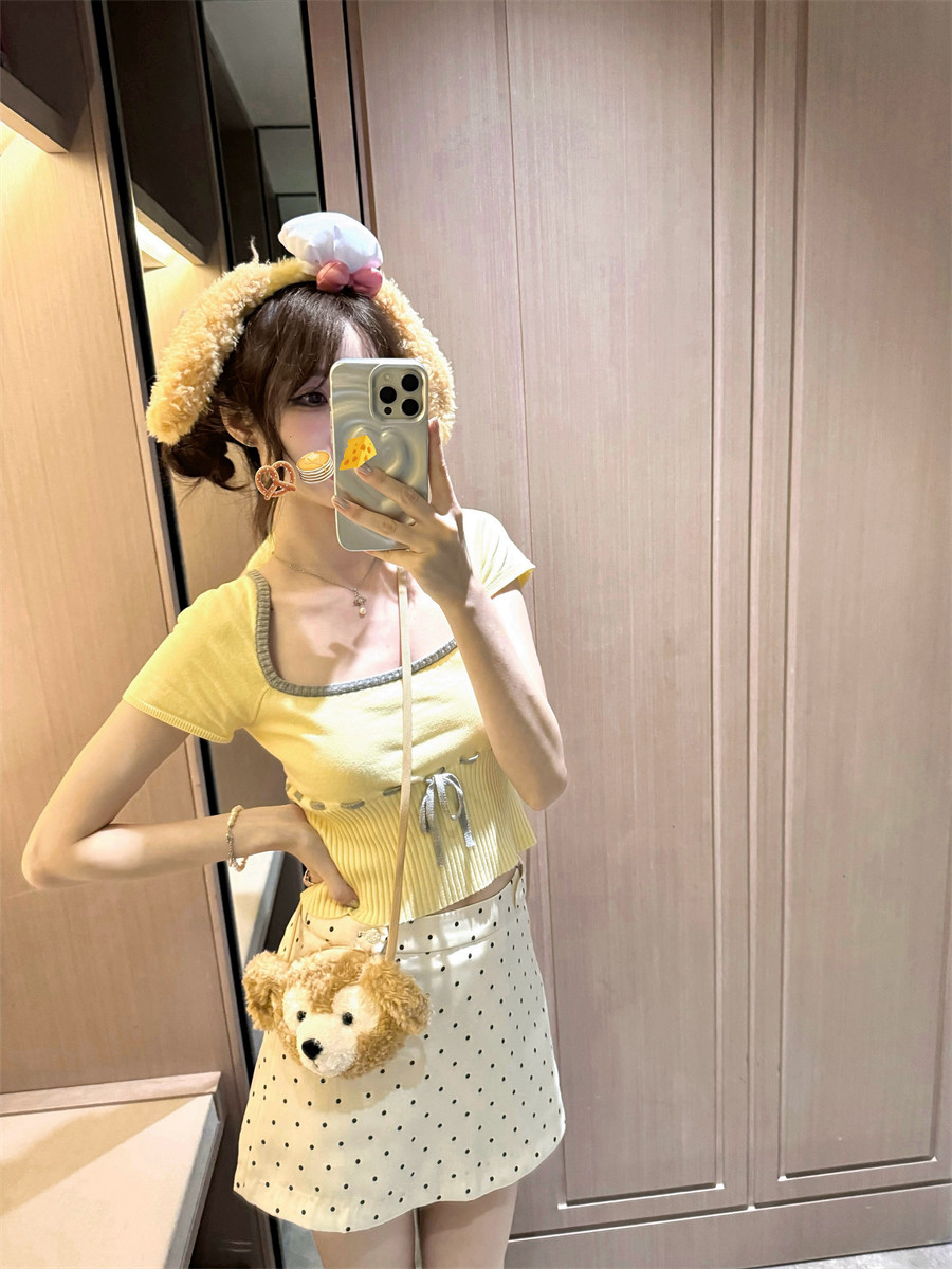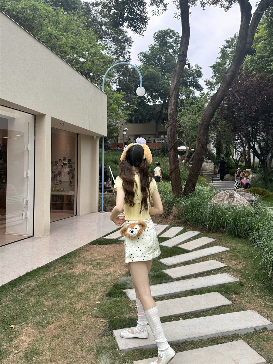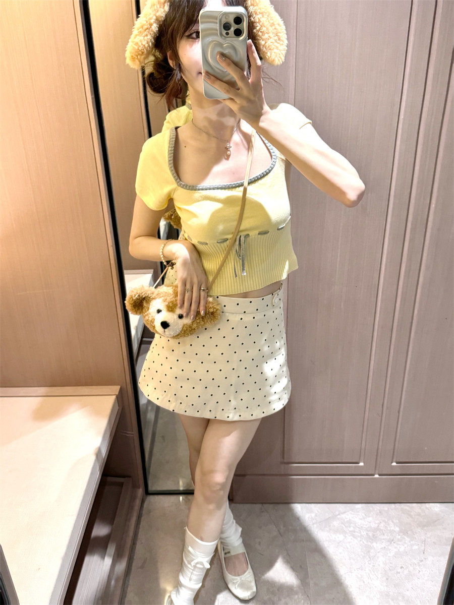 小雞黃針織上衣給大家搭配了緞面波點裙來搭配 一身又嫩又少女 穿著想立馬去迪士尼~