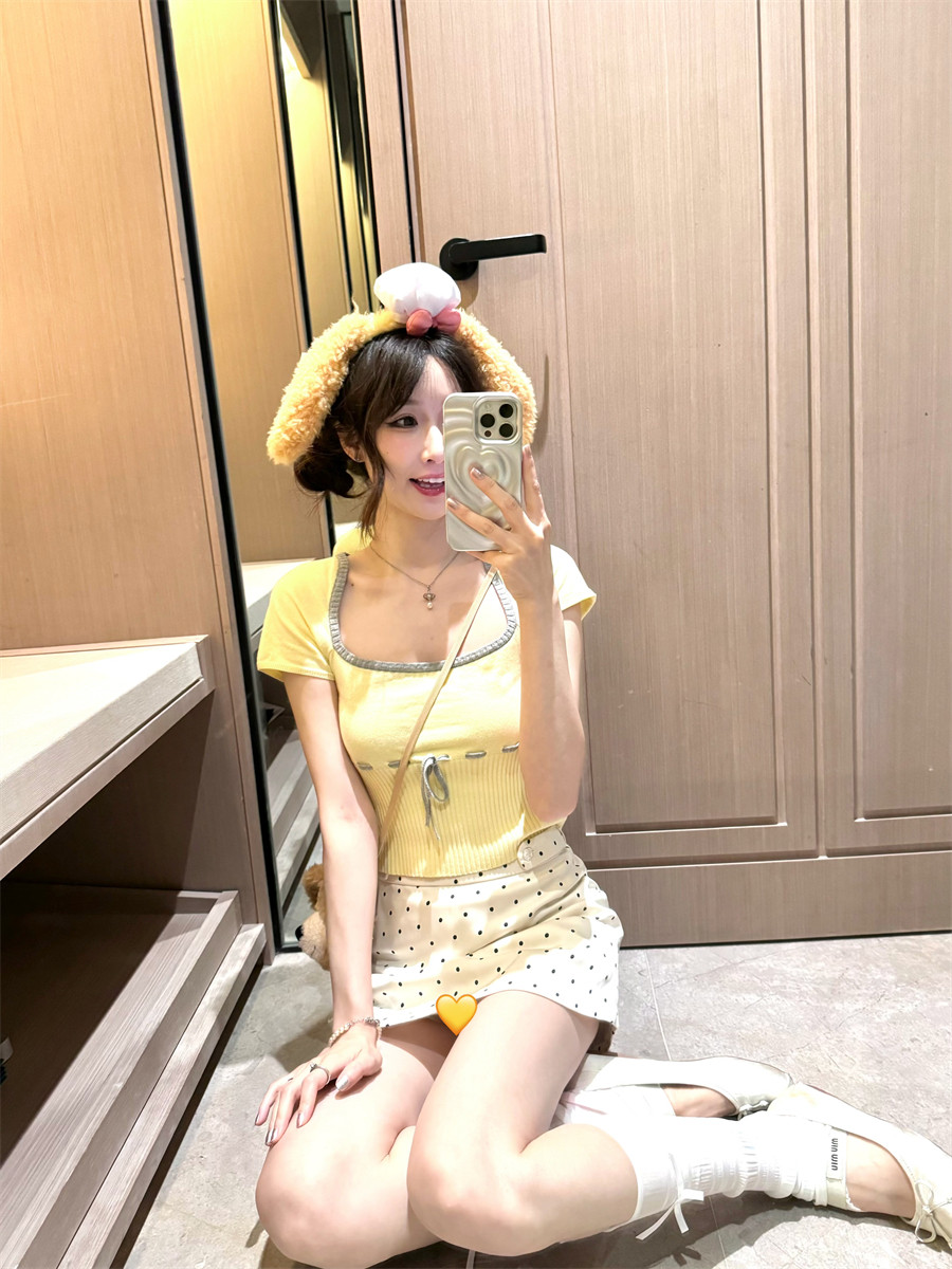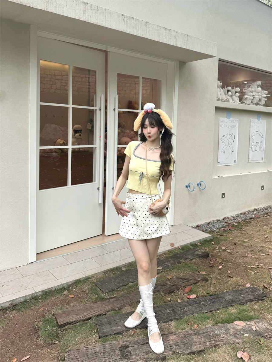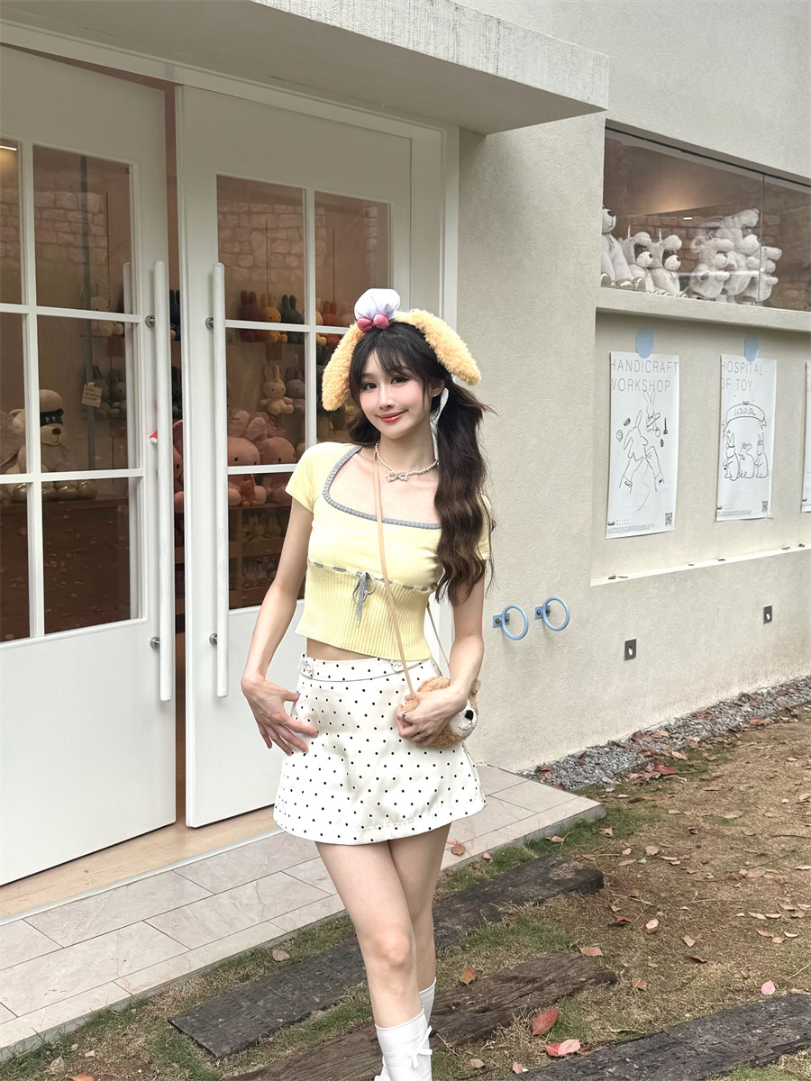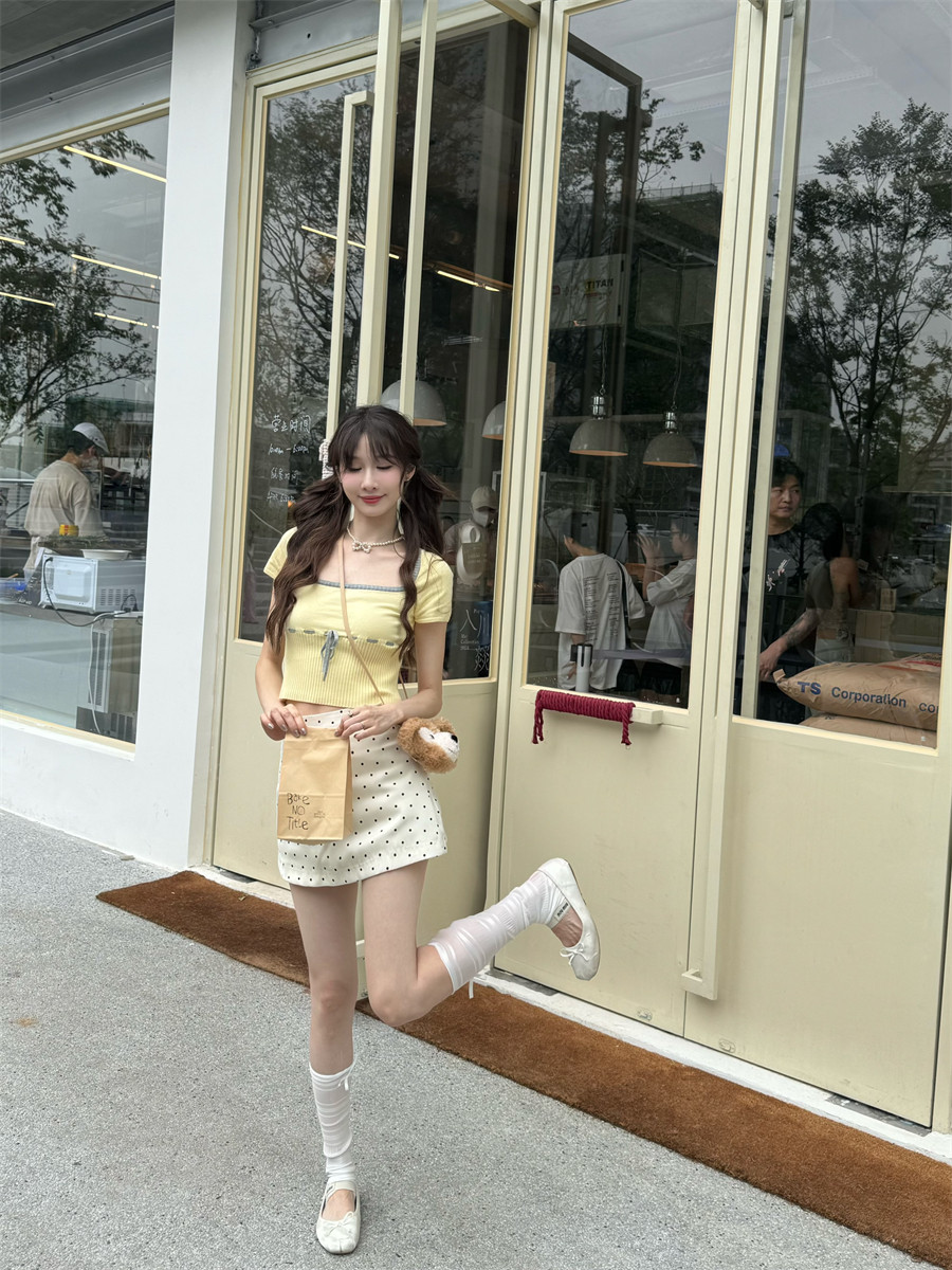 小雞黃針織上衣給大家搭配了緞面波點裙來搭配 一身又嫩又少女 穿著想立馬去迪士尼~