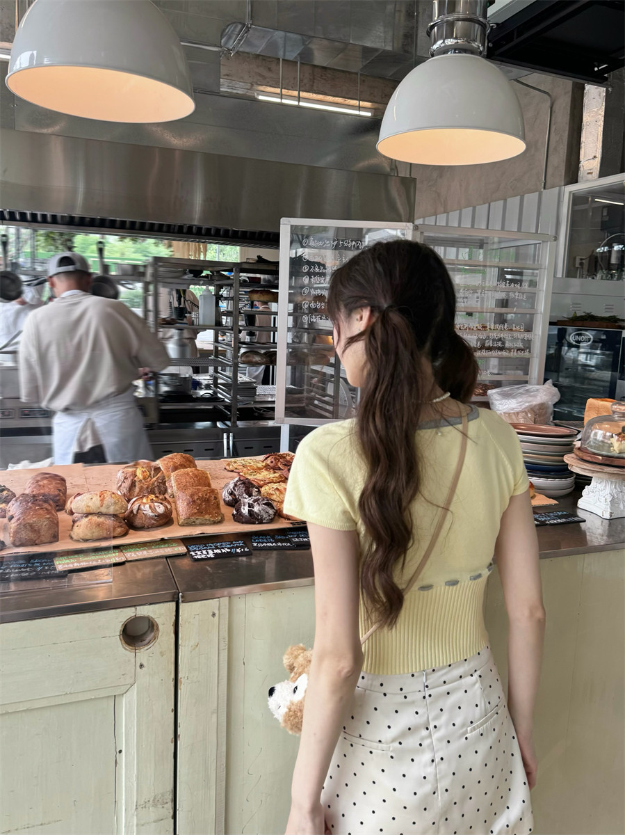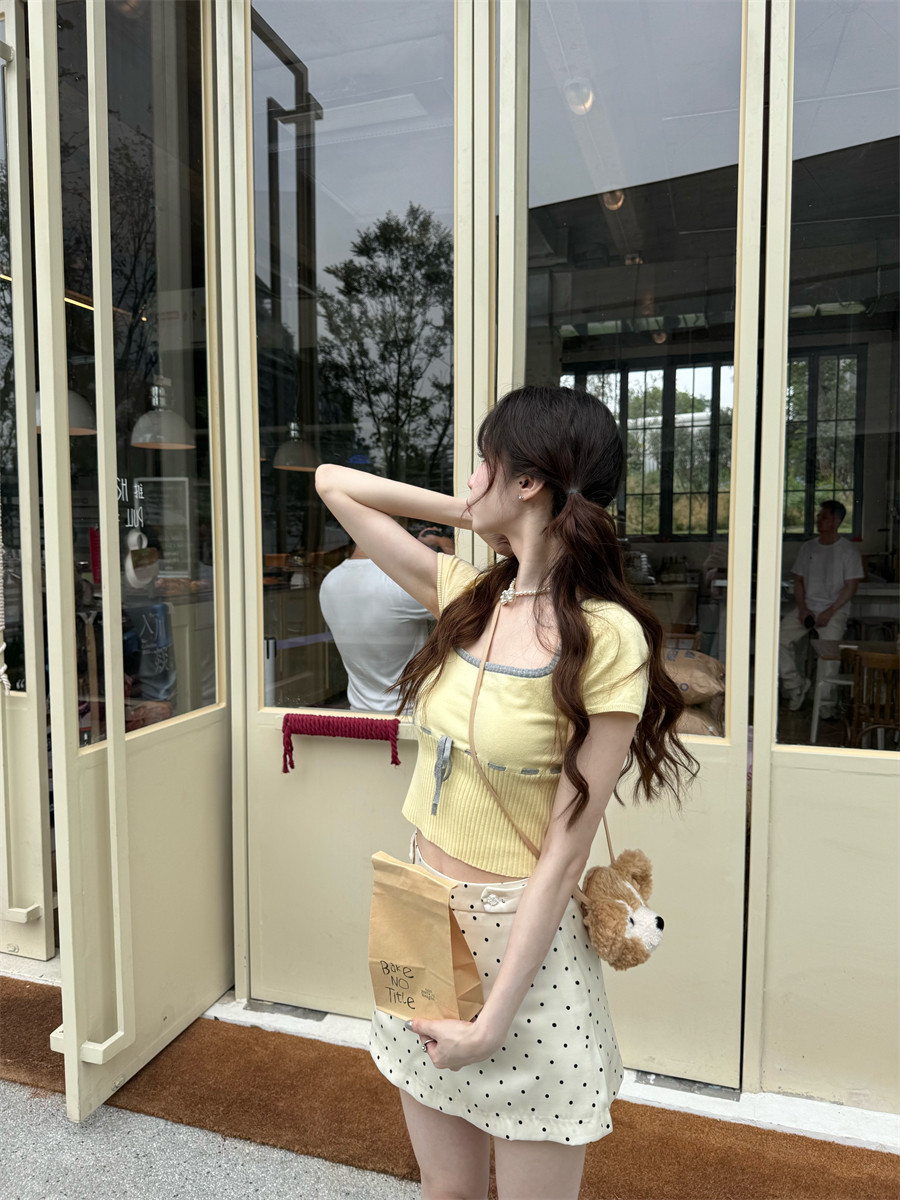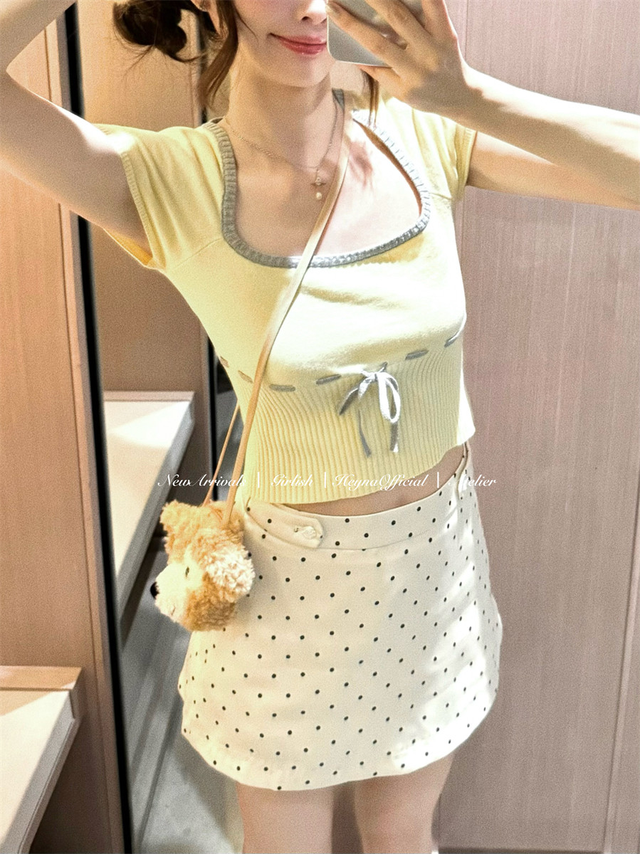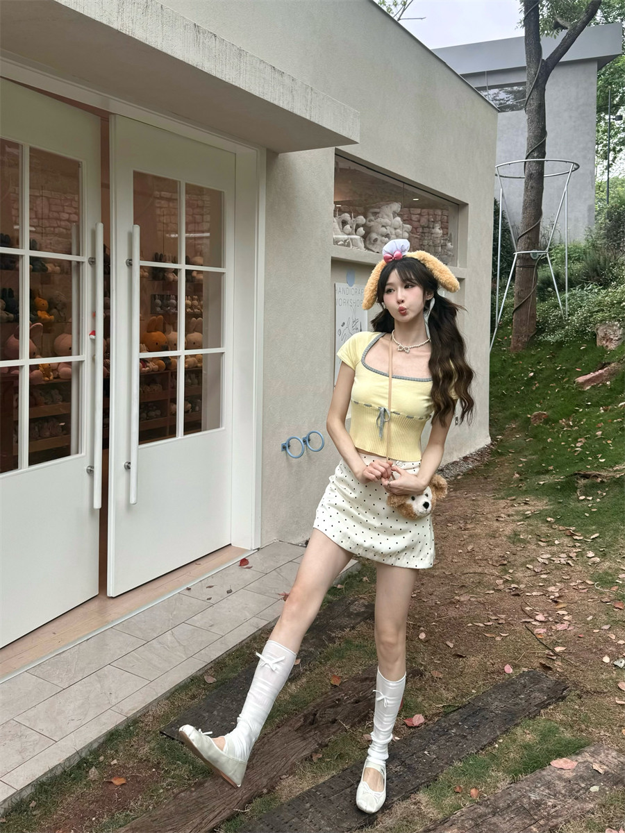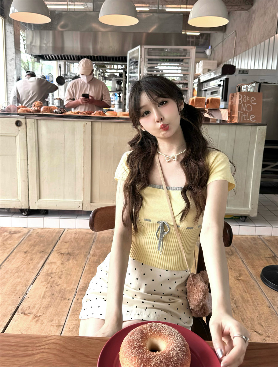 小雞黃針織上衣給大家搭配了緞面波點裙來搭配 一身又嫩又少女 穿著想立馬去迪士尼~