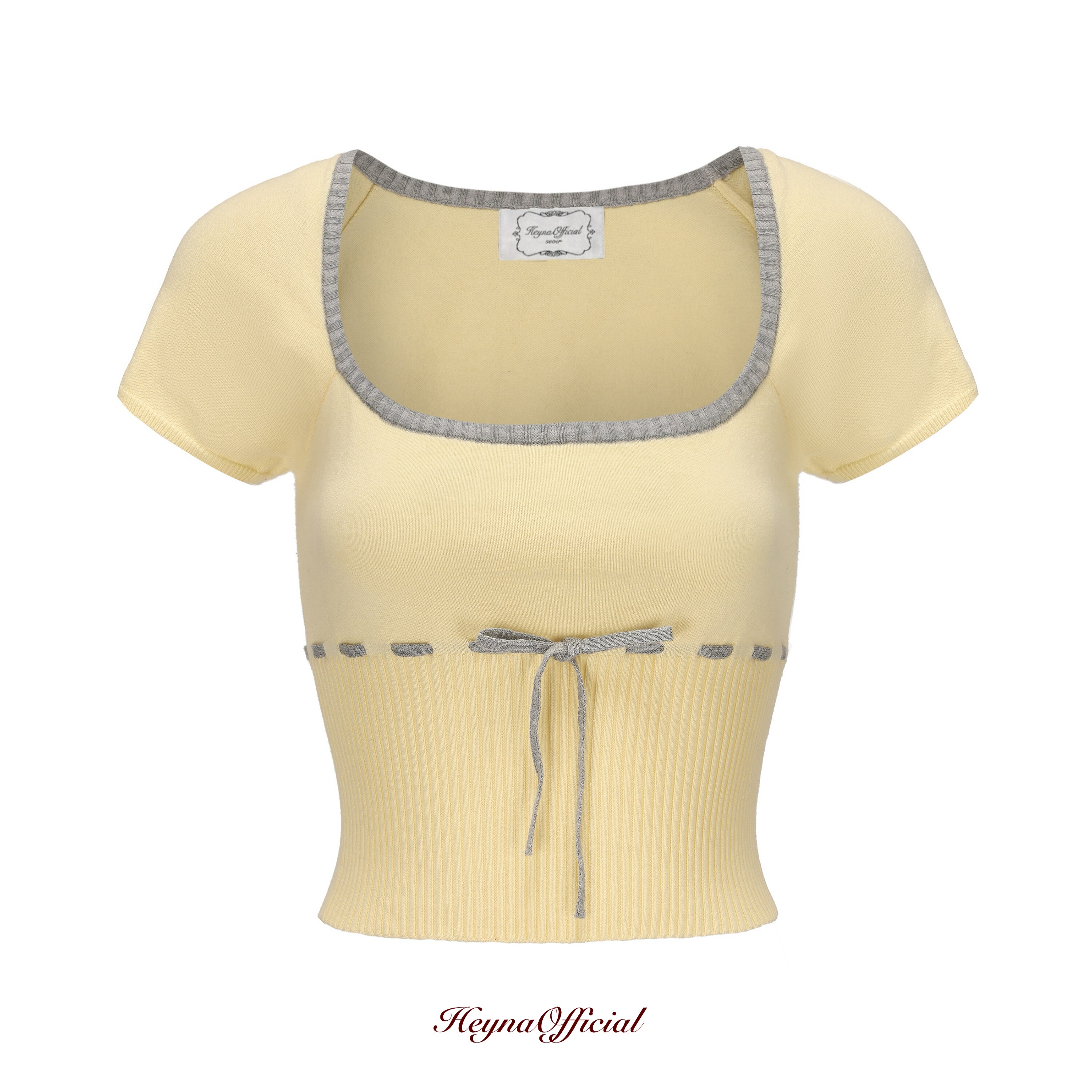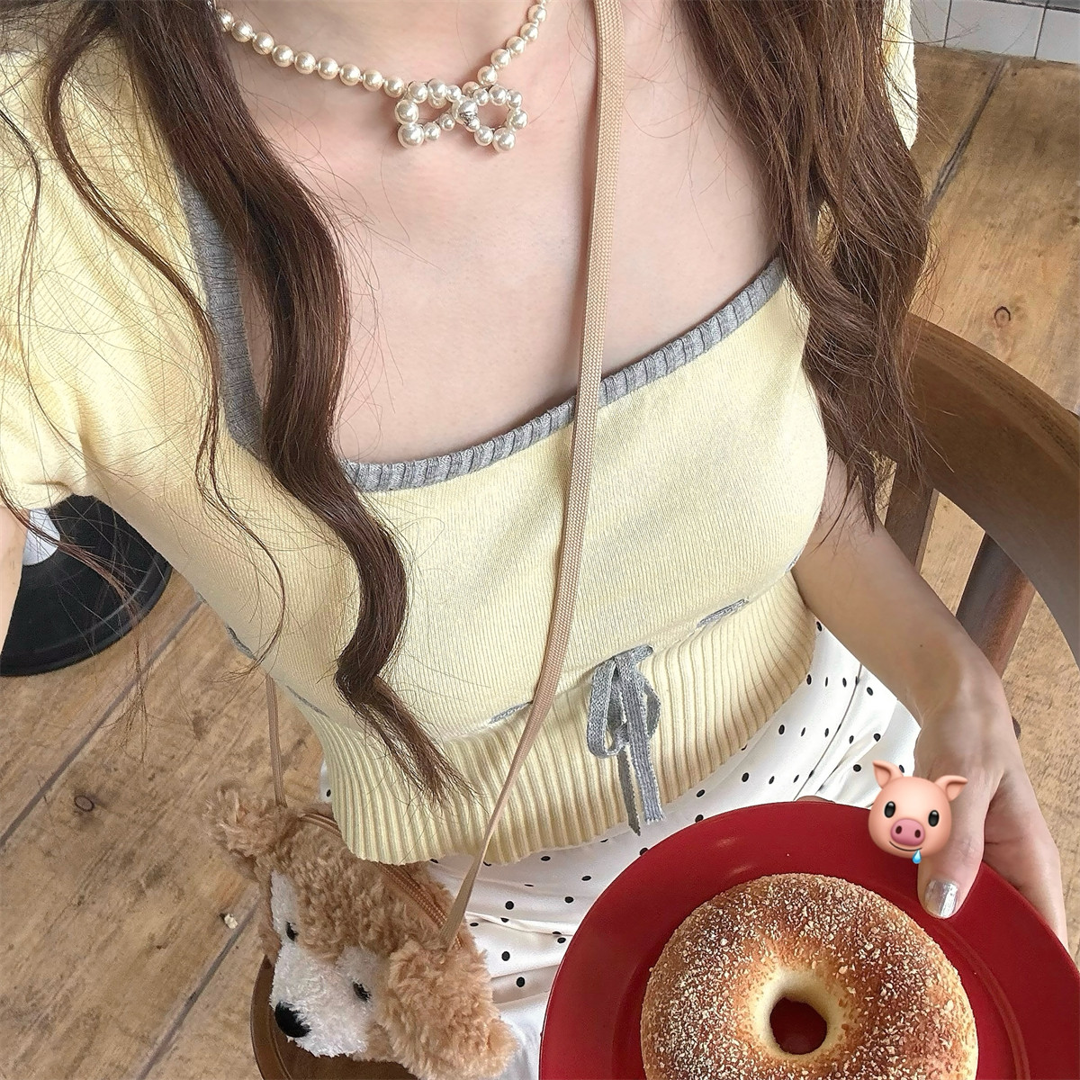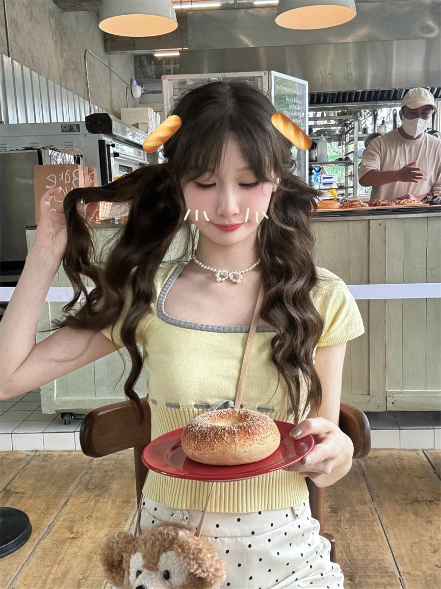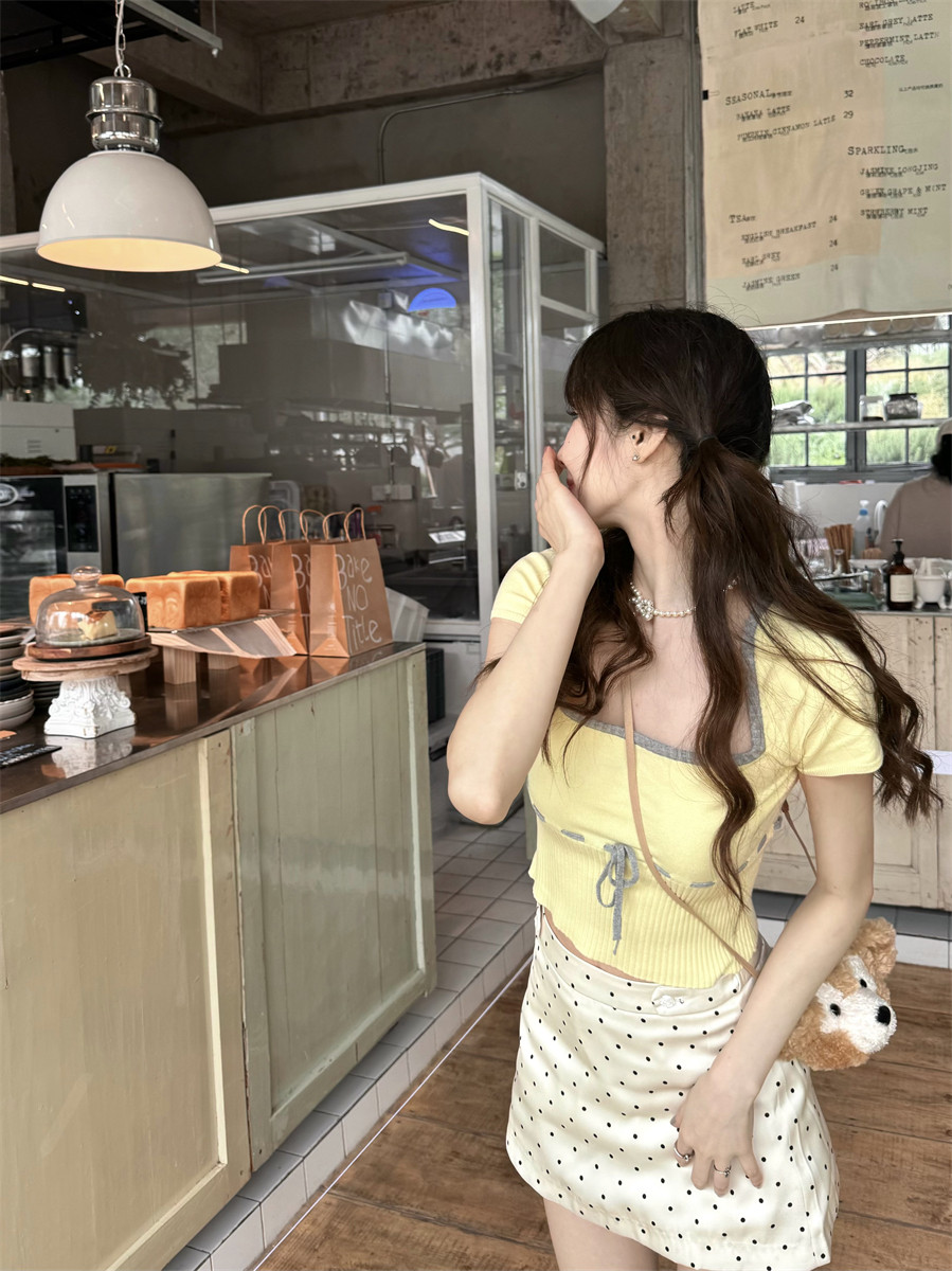 小雞黃針織上衣給大家搭配了緞面波點裙來搭配 一身又嫩又少女 穿著想立馬去迪士尼~