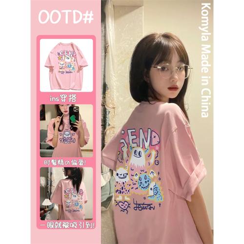 100%重磅純棉日系甜妹穿搭粉色短袖t恤女閨蜜夏季新款卡通上衣ins