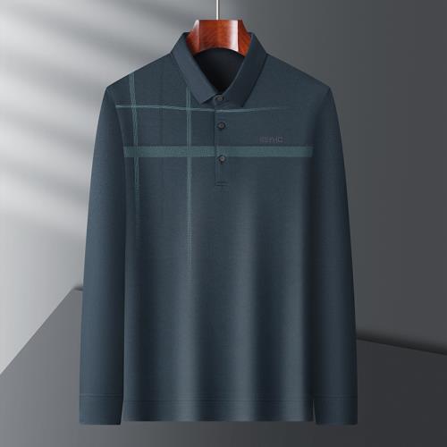 春秋新款中老年男士翻領冰絲長袖T恤老人寬松打底衫中年薄款上衣