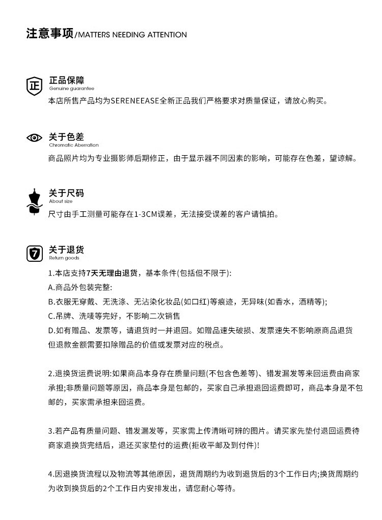 海外代購是依照消費者要求而提供協助購買商品之服務,係屬於「客製化給付」,依據《通訊交易解除權合理例外情事適用準則》規定不適用《消費者保護法第19條》鑑賞期規定。一旦訂單進入「已出貨」狀態,即無法取消訂單。收到商品後,若與預期不符,亦無法申請退貨或退款。 - 瑕疵商品退換貨規定