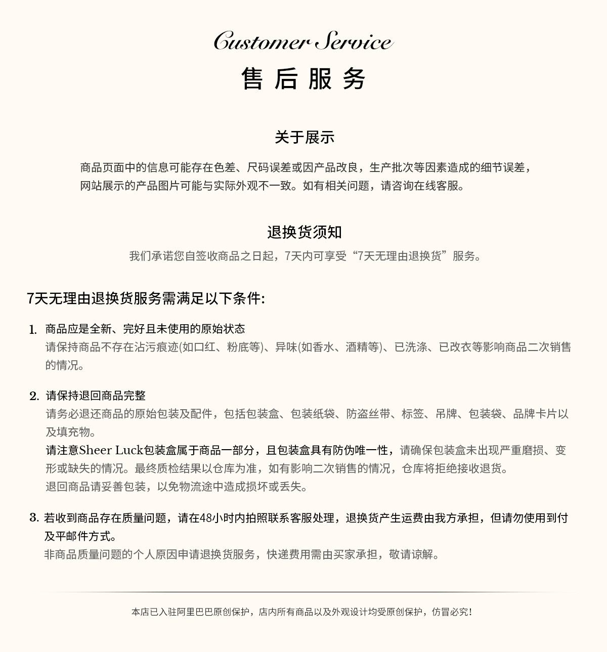 海外代購是依照消費者要求而提供協助購買商品之服務,係屬於「客製化給付」,依據《通訊交易解除權合理例外情事適用準則》規定不適用《消費者保護法第19條》鑑賞期規定。一旦訂單進入「已出貨」狀態,即無法取消訂單。收到商品後,若與預期不符,亦無法申請退貨或退款。 - 瑕疵商品退換貨規定