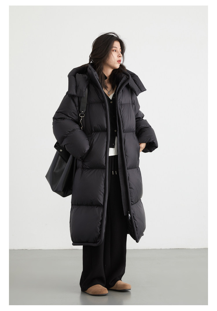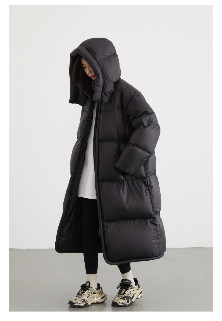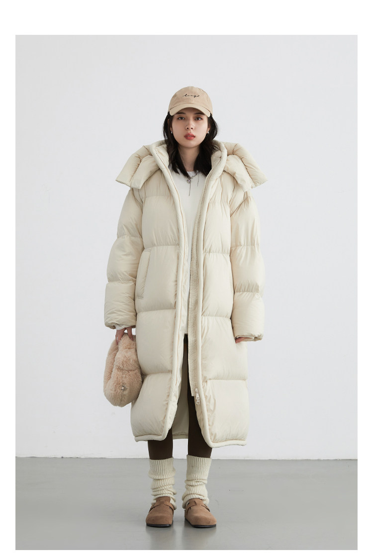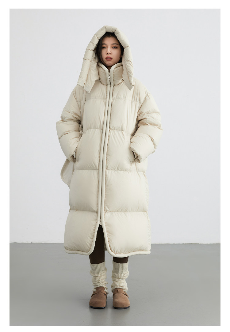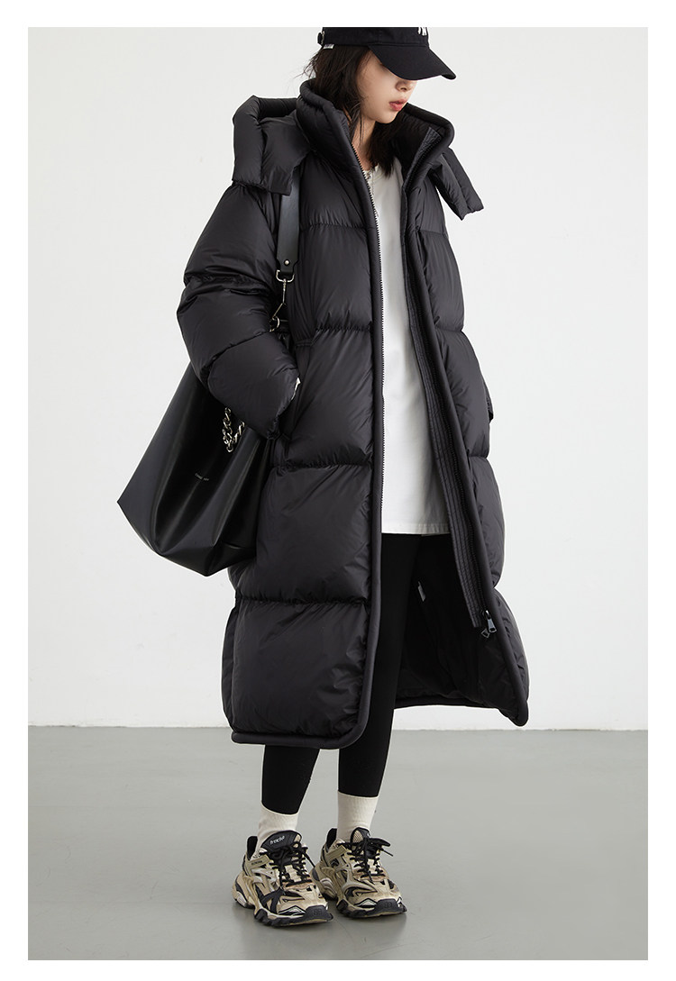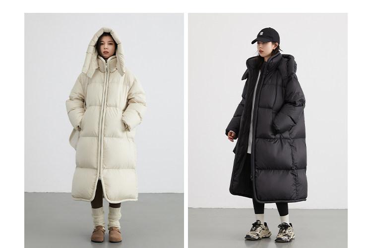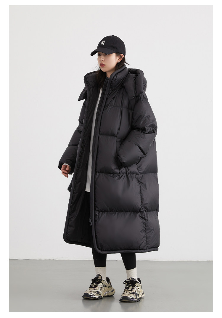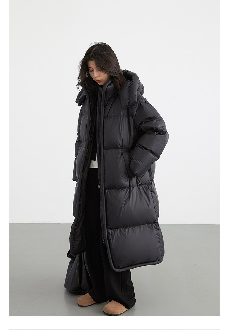 零下也可保命的長款羽絨服來擼~ 長款H型寬松休閑版型對身材的包容性很好 長度及踝設計,腿部怕冷也可以防風保暖 從頭部到腿部給足溫暖守護,東北姐妹放心入!