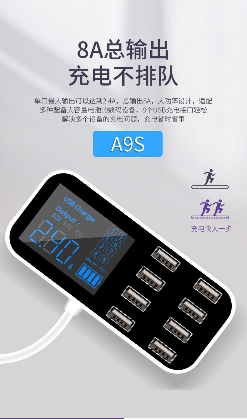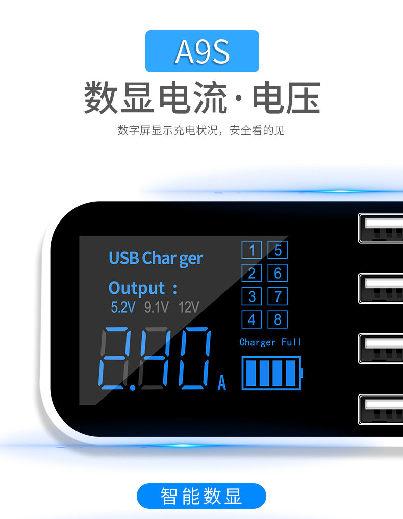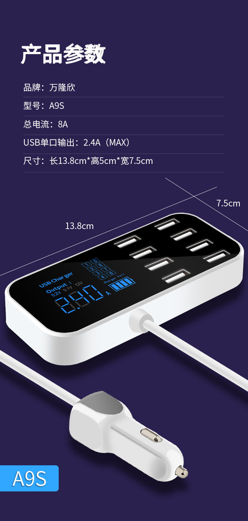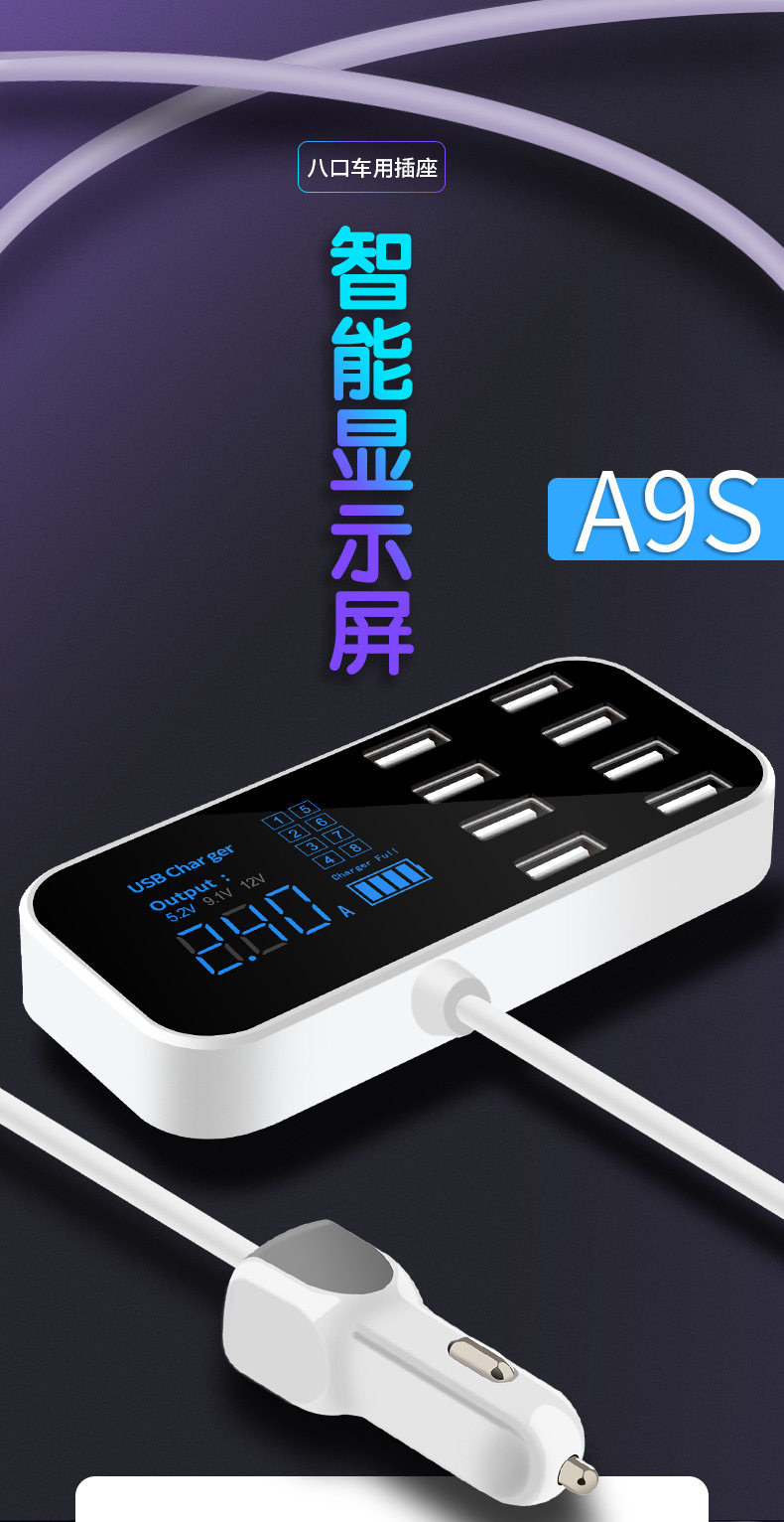 產品名稱:8口USB車載顯示充電器