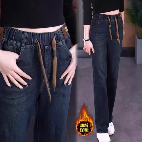 2025新款冬季松緊腰牛仔褲女高腰窄版顯瘦直筒褲加絨加厚春秋百搭