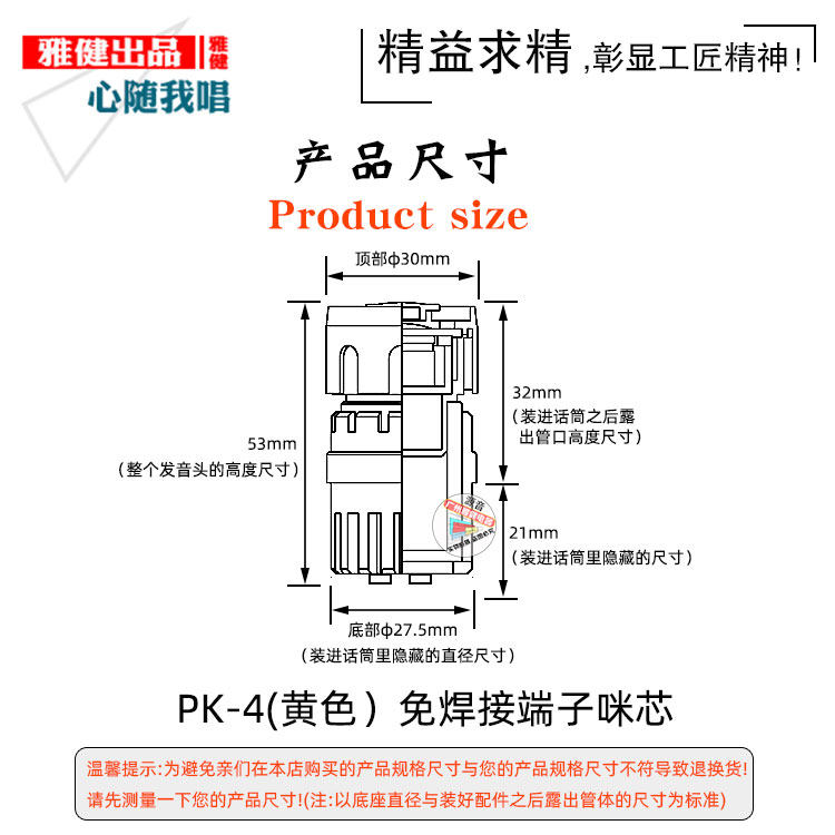 免焊線/免焊接端子麥克風咪芯,解決一般家用無電烙鐵焊接的煩惱!購買前請測量好尺寸,避免安裝好咪頭高而頂到網罩,或聯系客服咨詢相關問題,避免退換貨導致糾紛,感謝您的咨詢與信任,祝您生活愉快!