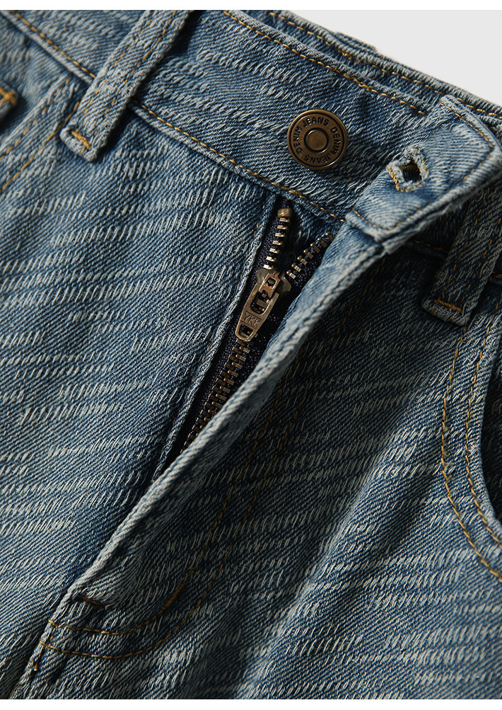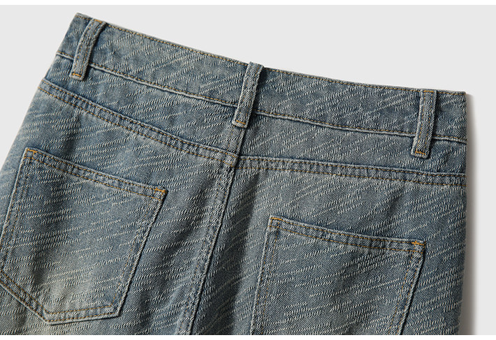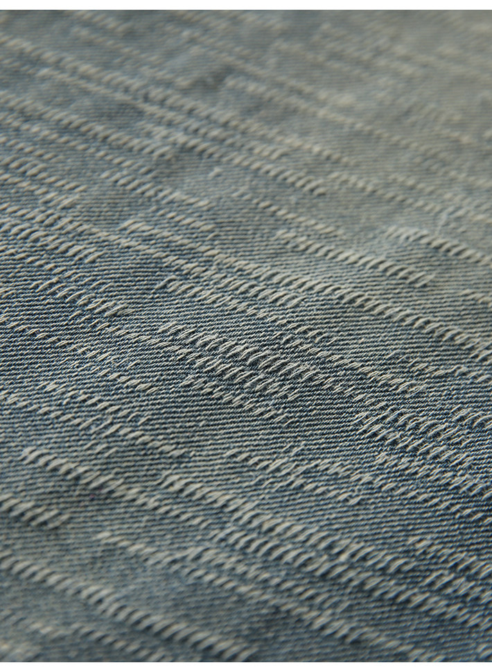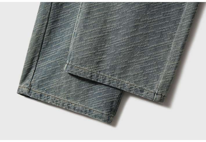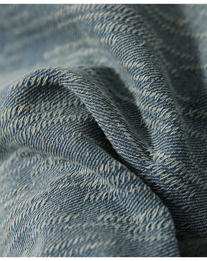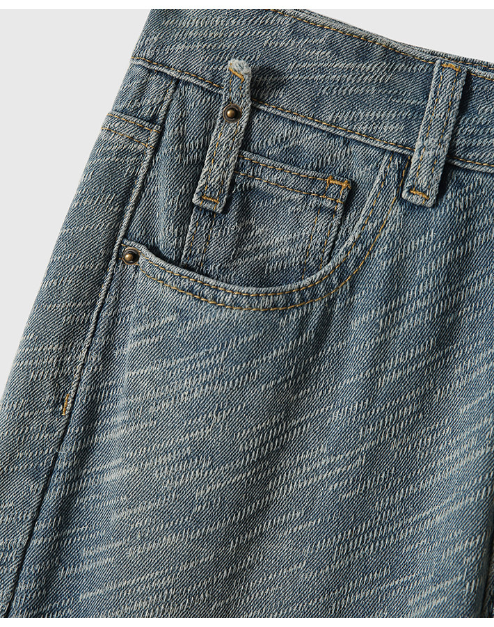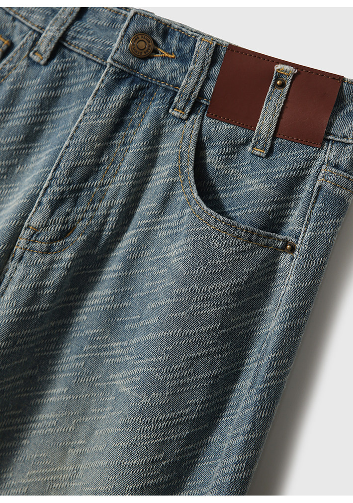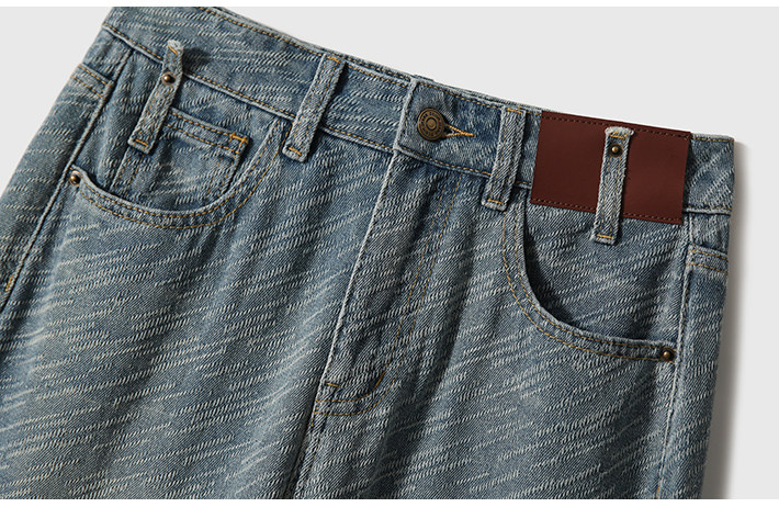 在基礎的寬松牛仔褲上做了不規則斜條提花肌理感