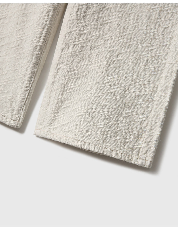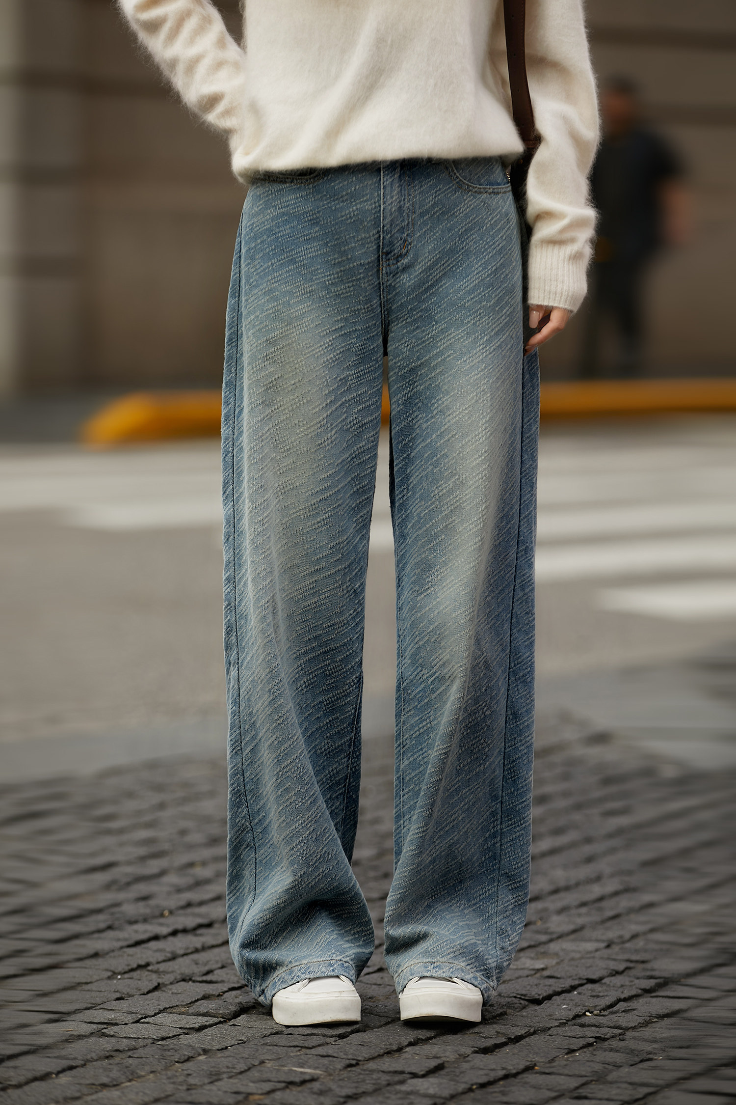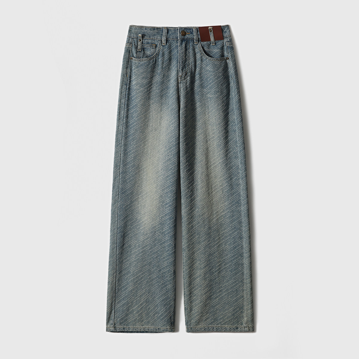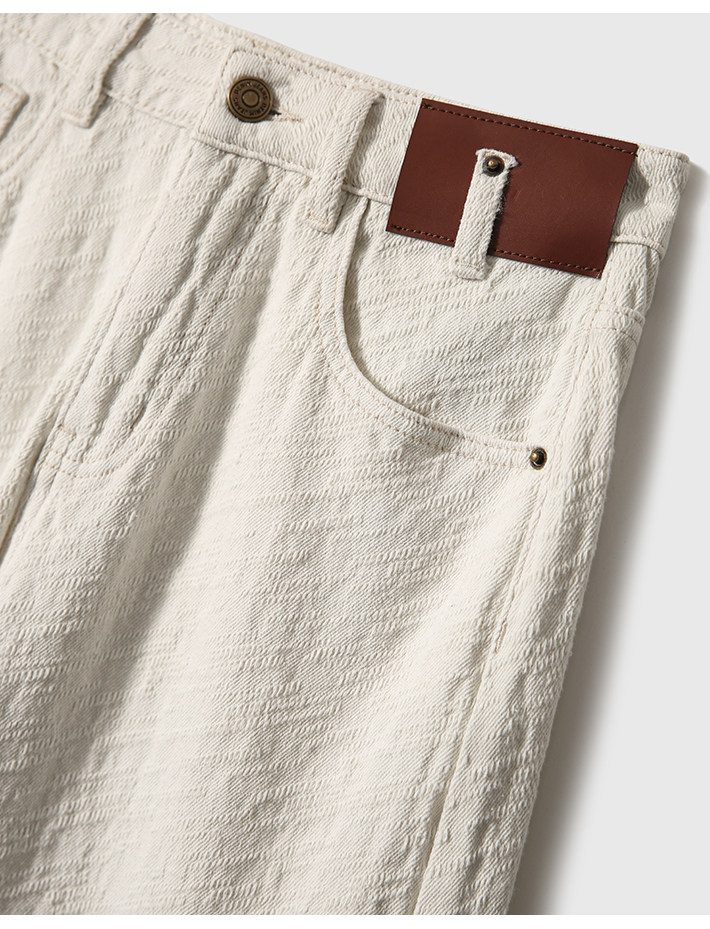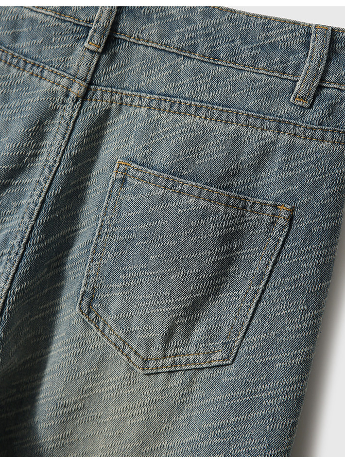 在基礎的寬松牛仔褲上做了不規則斜條提花肌理感