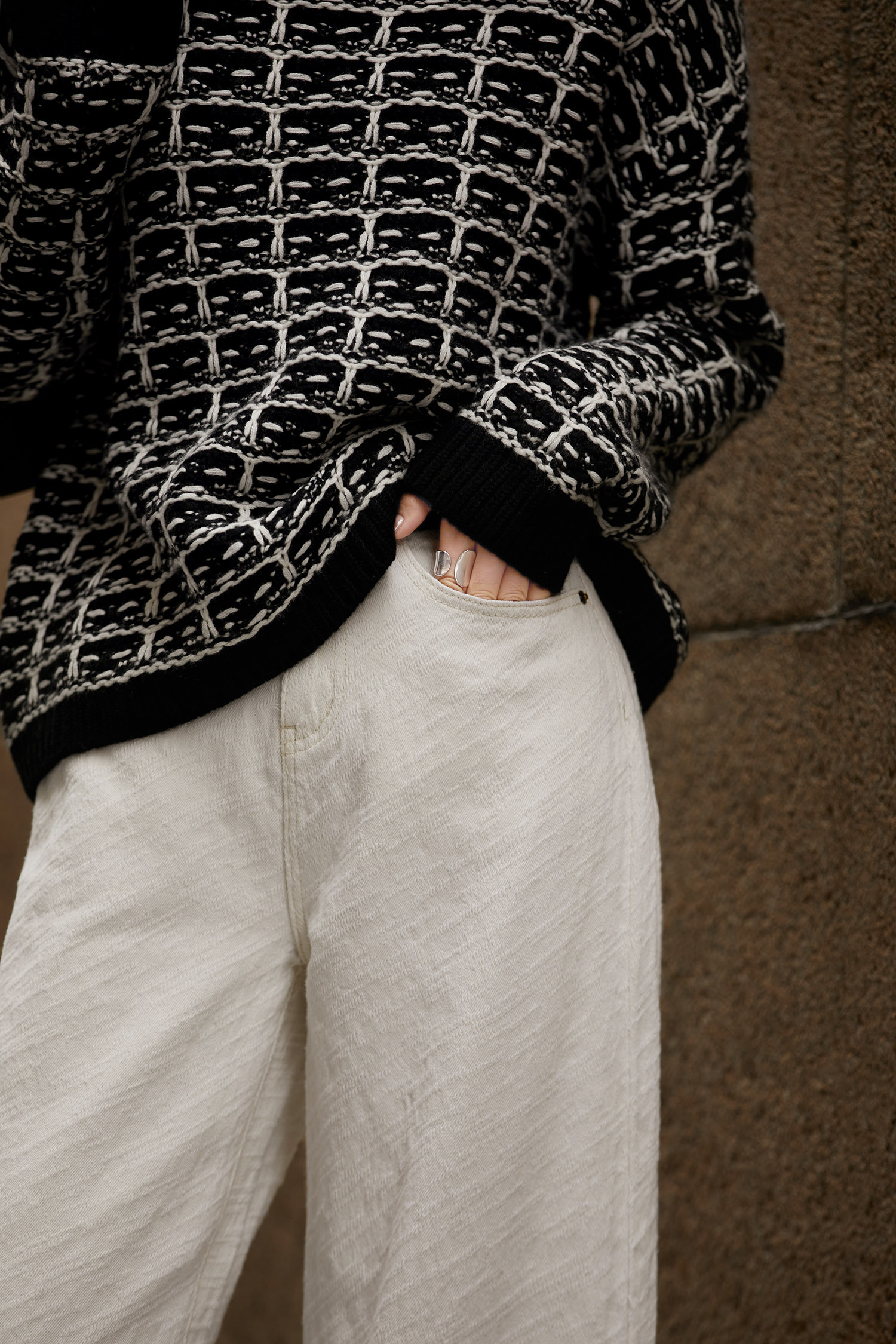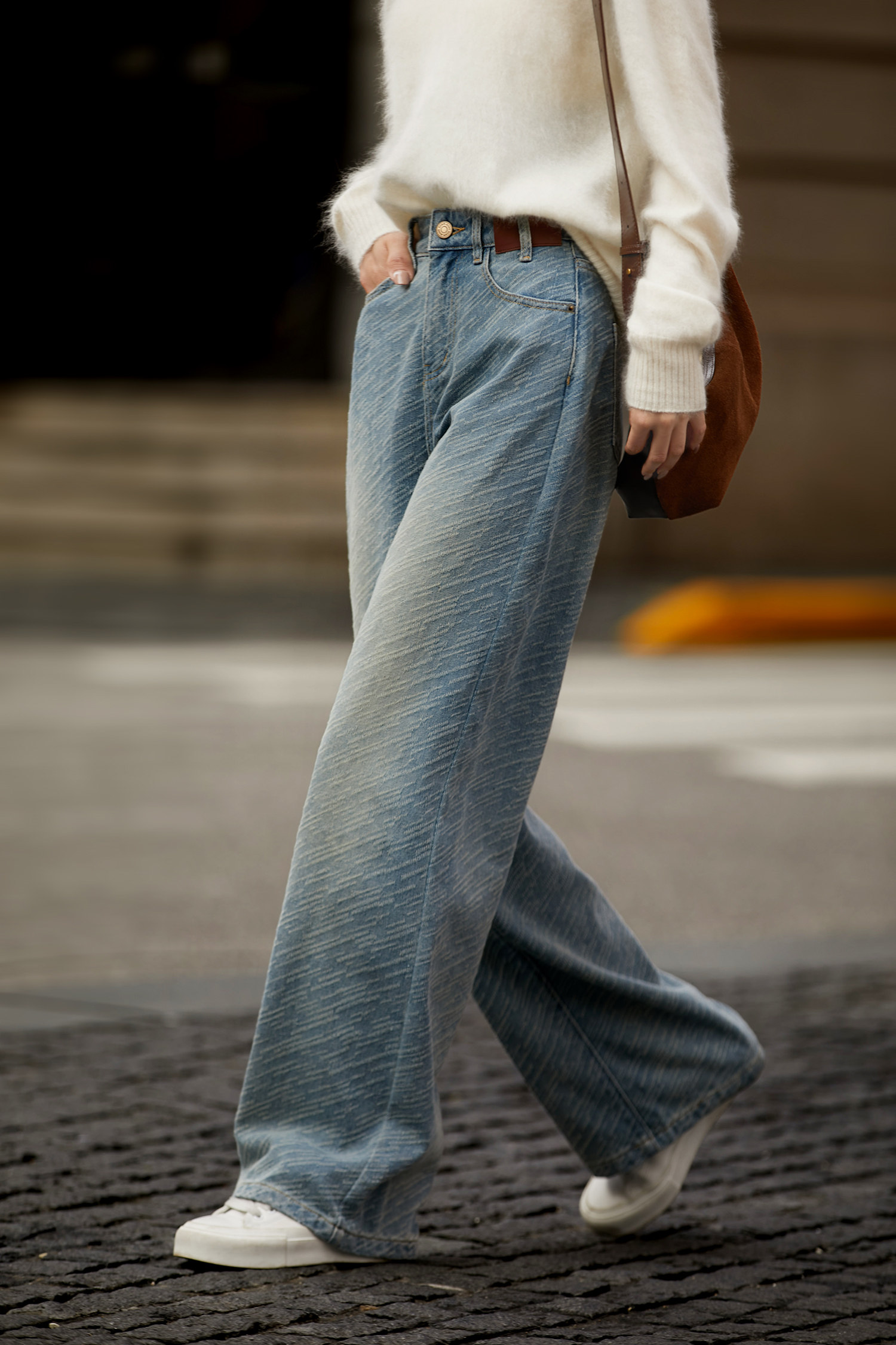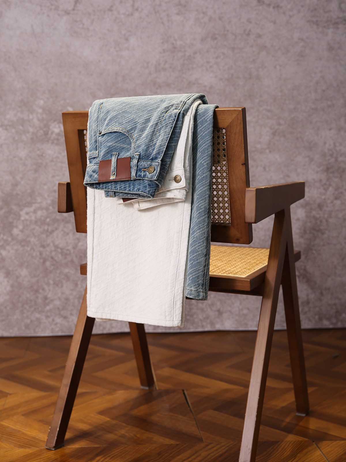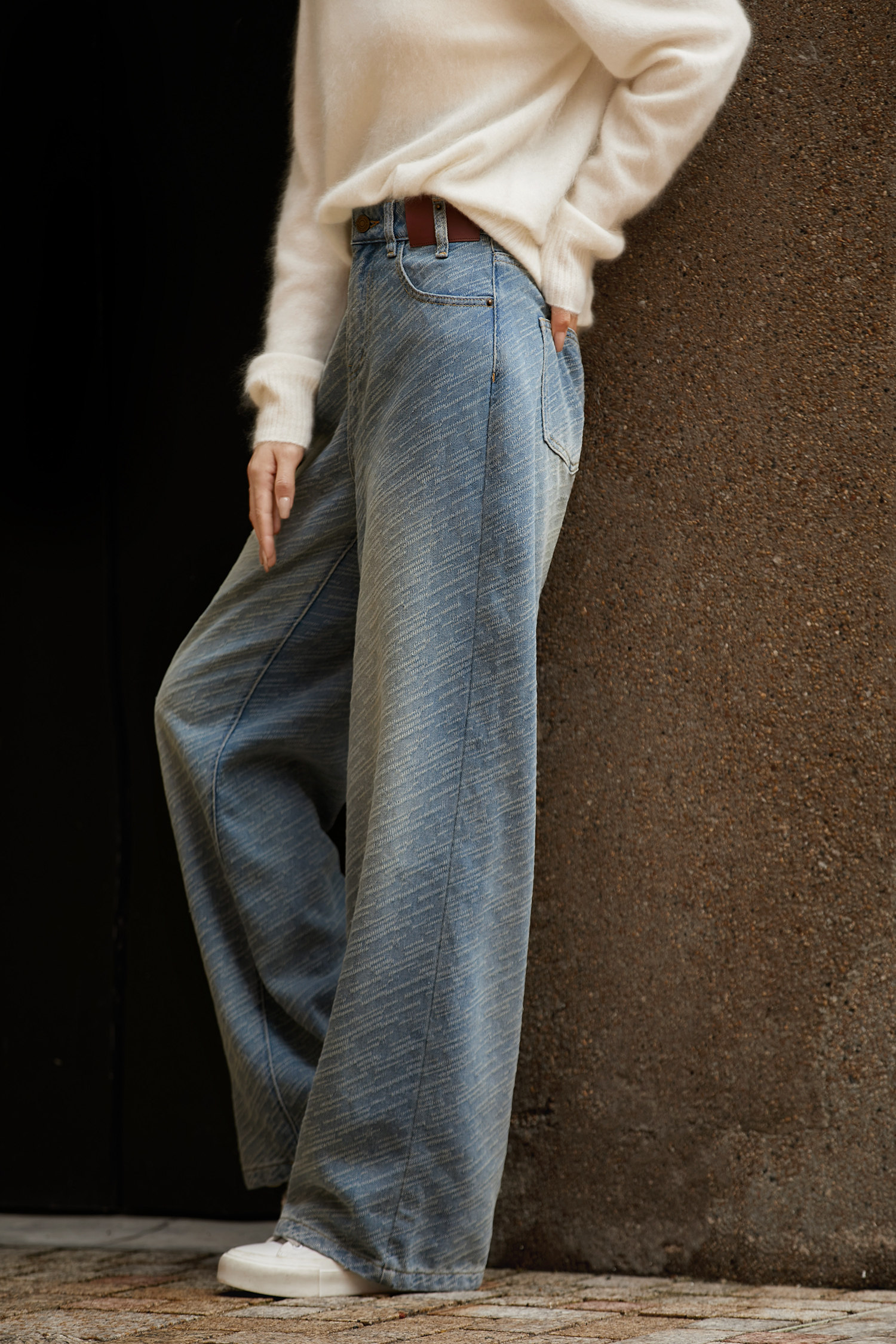 在基礎的寬松牛仔褲上做了不規則斜條提花肌理感