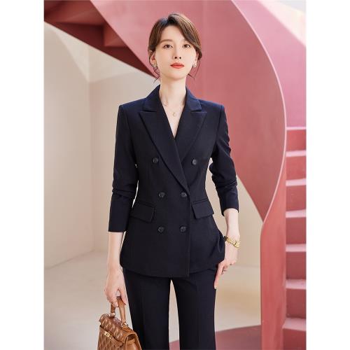 (免運)詩璐雅商務正裝女長袖西裝藏青色雙排扣職業套裝春秋公考面試西服