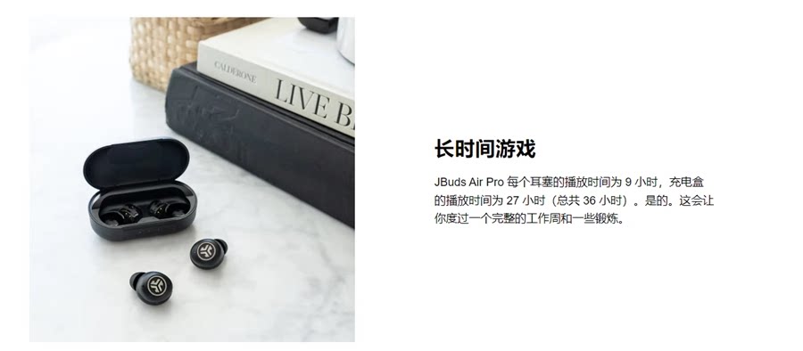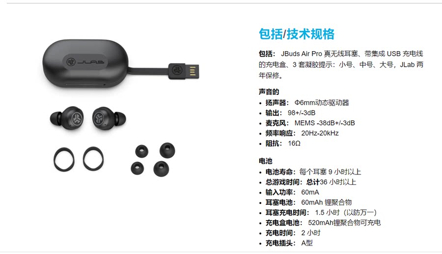 • 包括:JBuds Air Pro True無線耳機、帶集成USB充電電纜的充電盒、