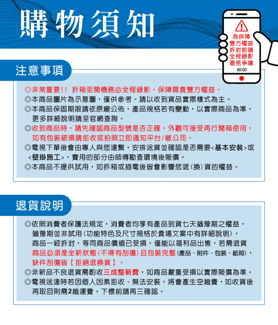 📌拆封請全程錄影為了保障雙方權益,請您在開箱過程中務必全程錄影,以確保商品是否遺漏。寄錯、缺貨、瑕疵品等,請皆以「完整錄影檔」為依據,(從外送箱未開封的完整狀態開始拍攝才是完整錄影檔)。影片需清楚拍攝【未拆封狀態】、【開箱過程】、【物件本體】、【貨品明細】等。影片需提供「原檔清晰開箱影片」,快轉或有明顯剪輯痕跡的影片皆不在受理範圍。