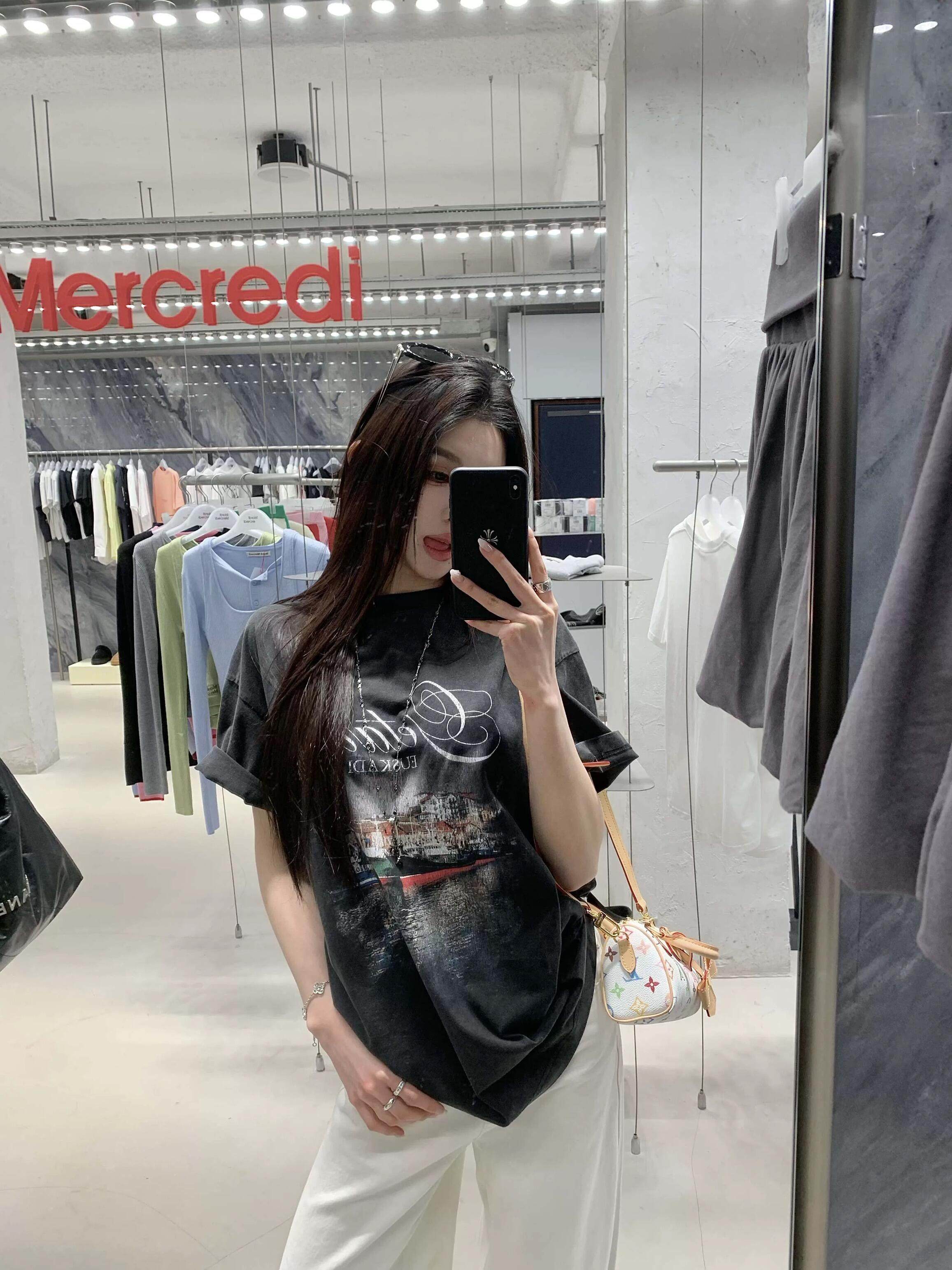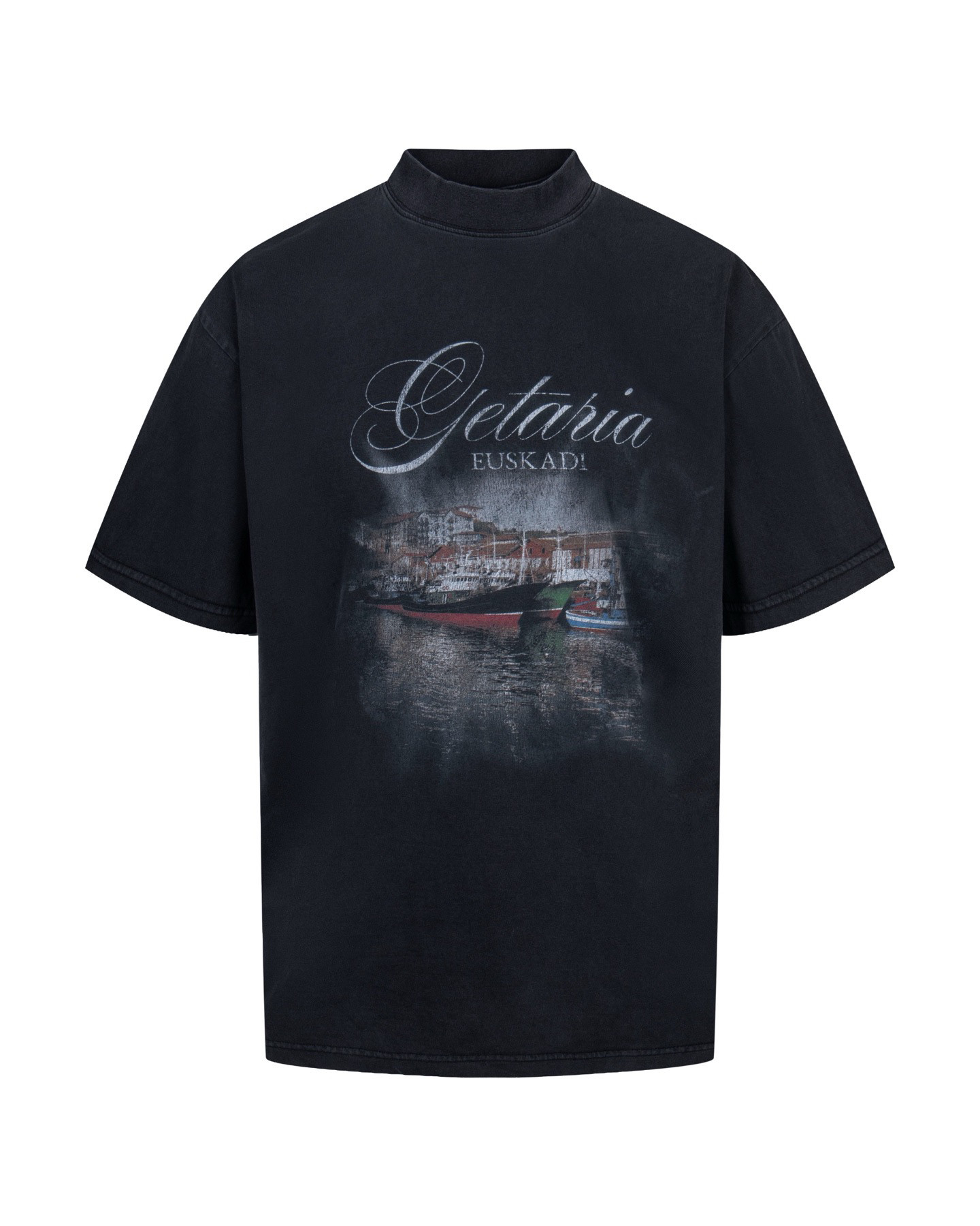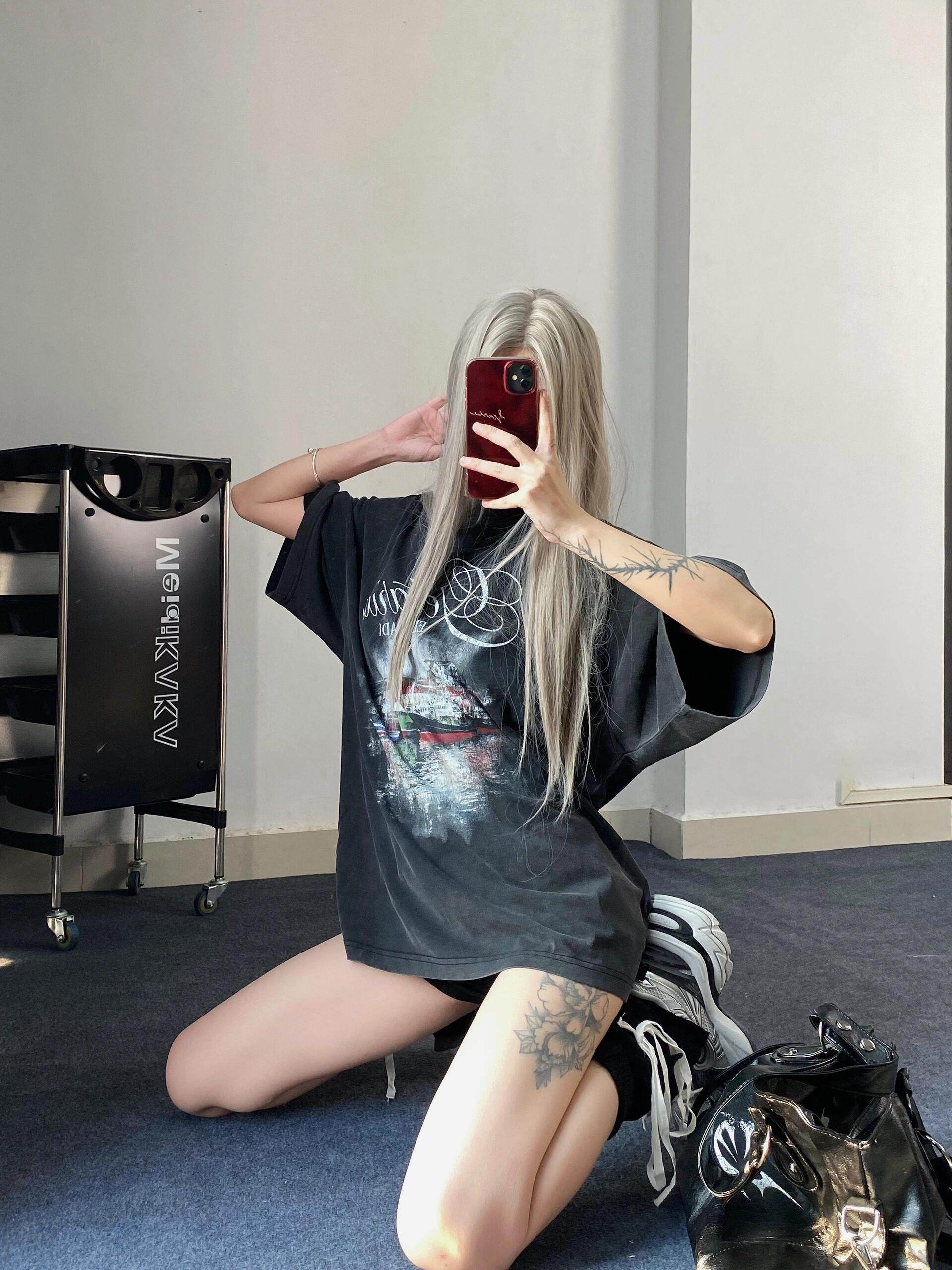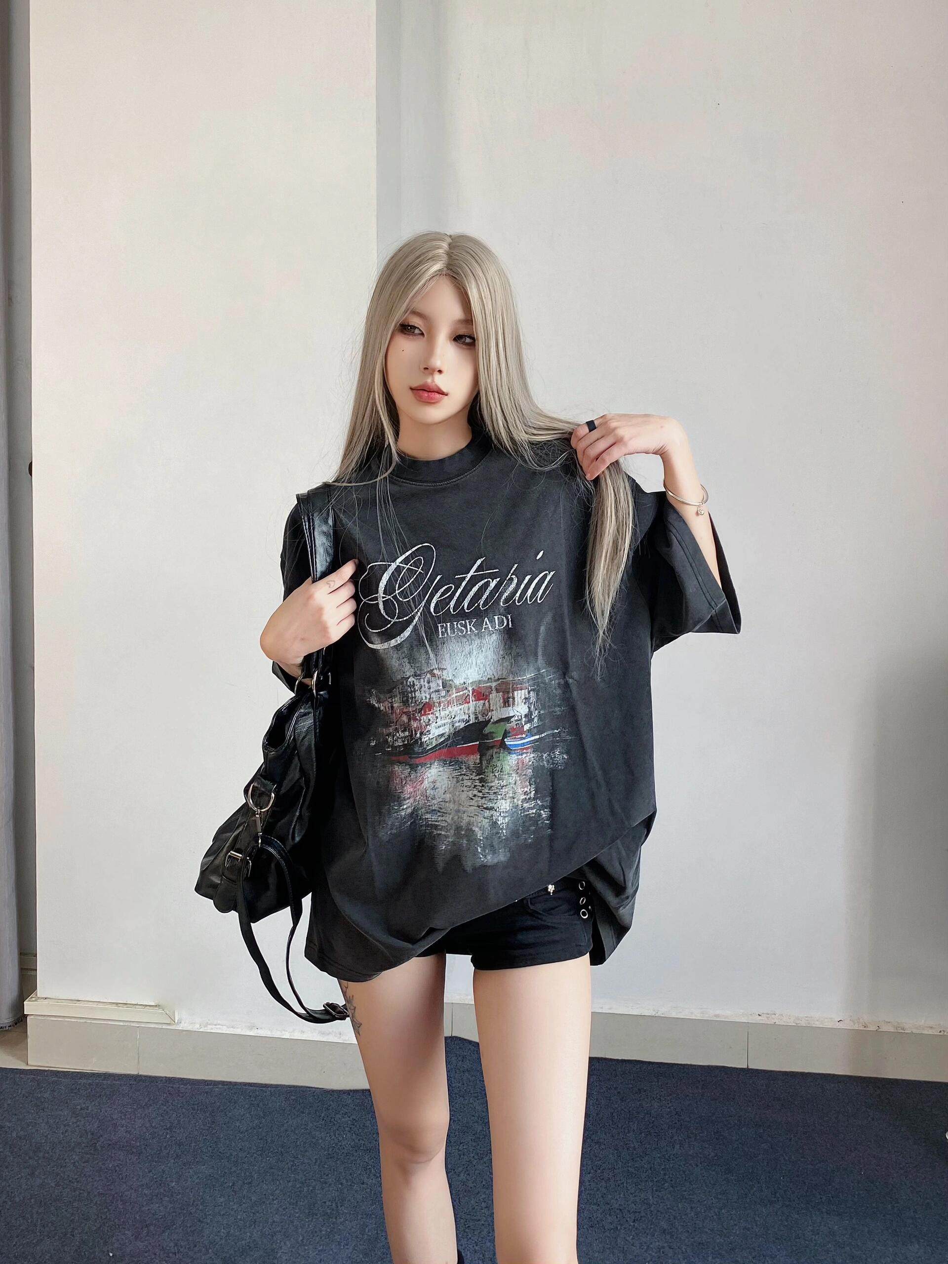 巴黎風格船舶夜景字母直噴印花水洗做舊短袖T恤