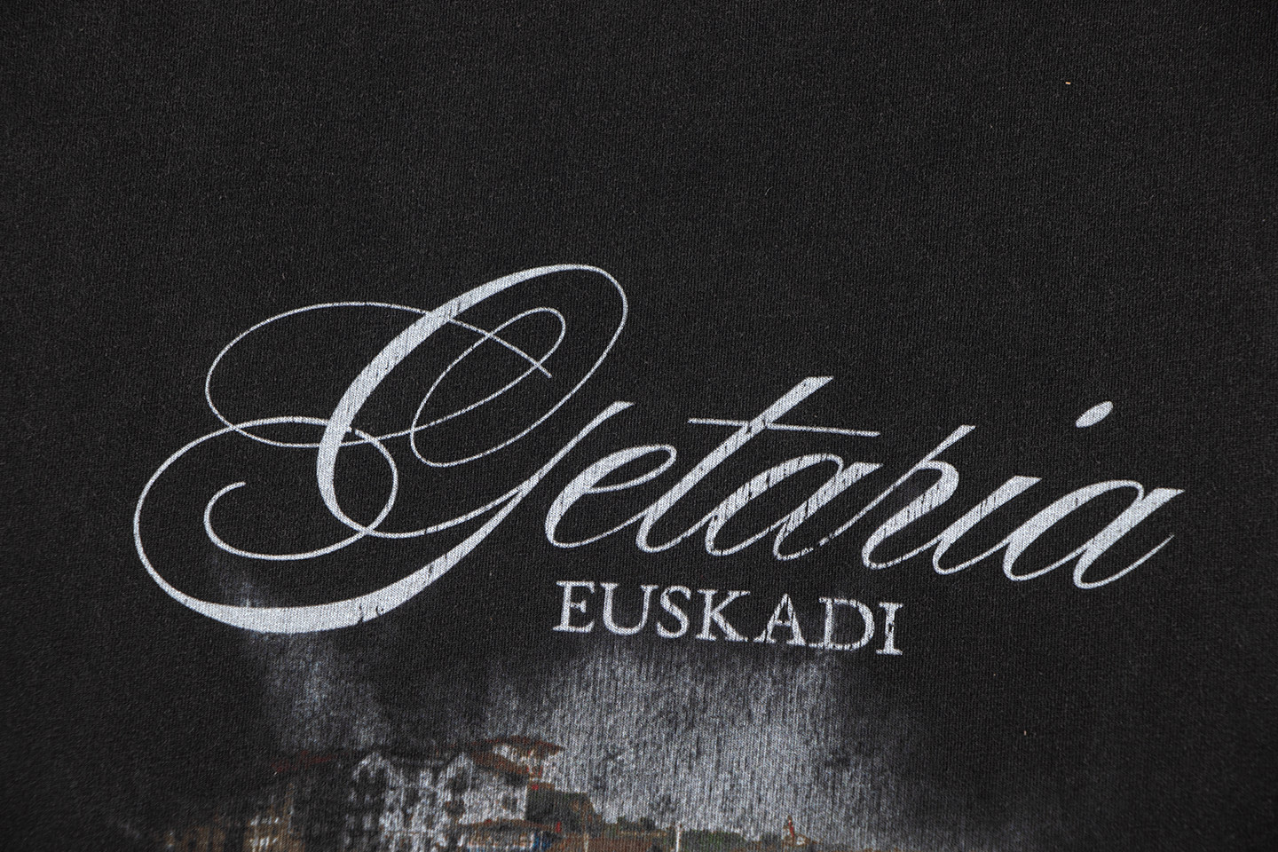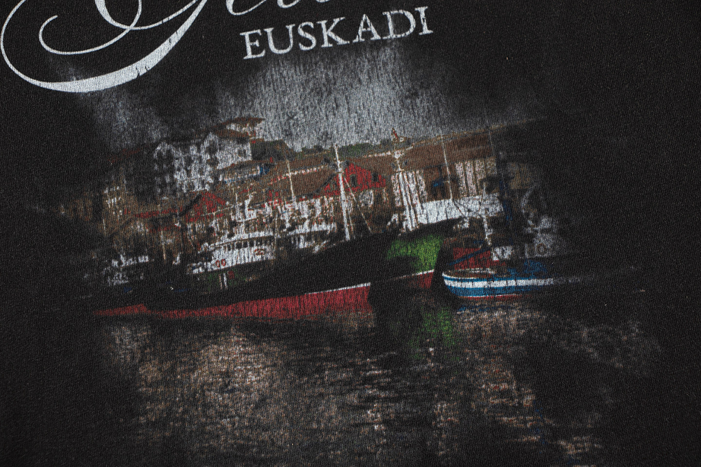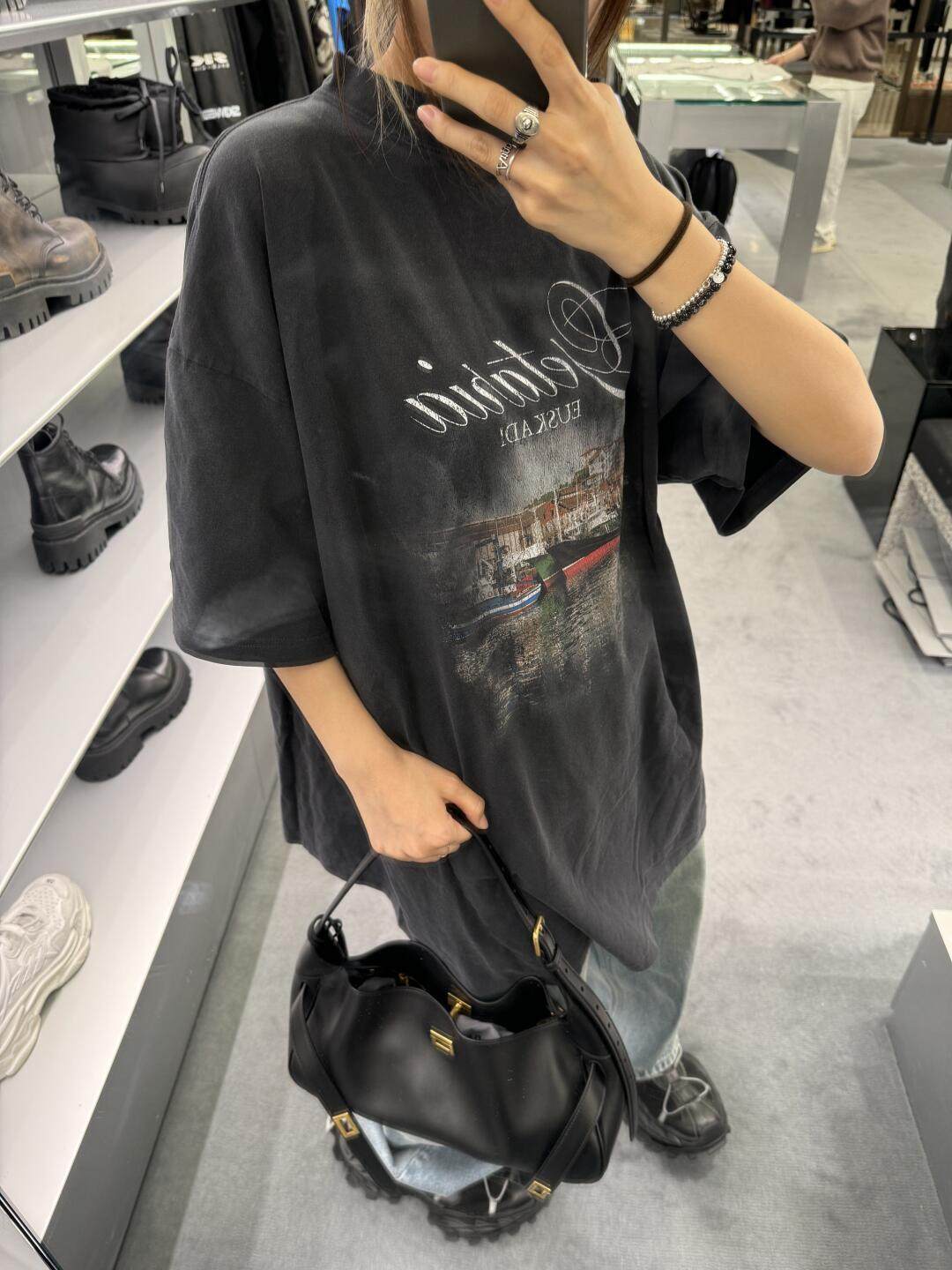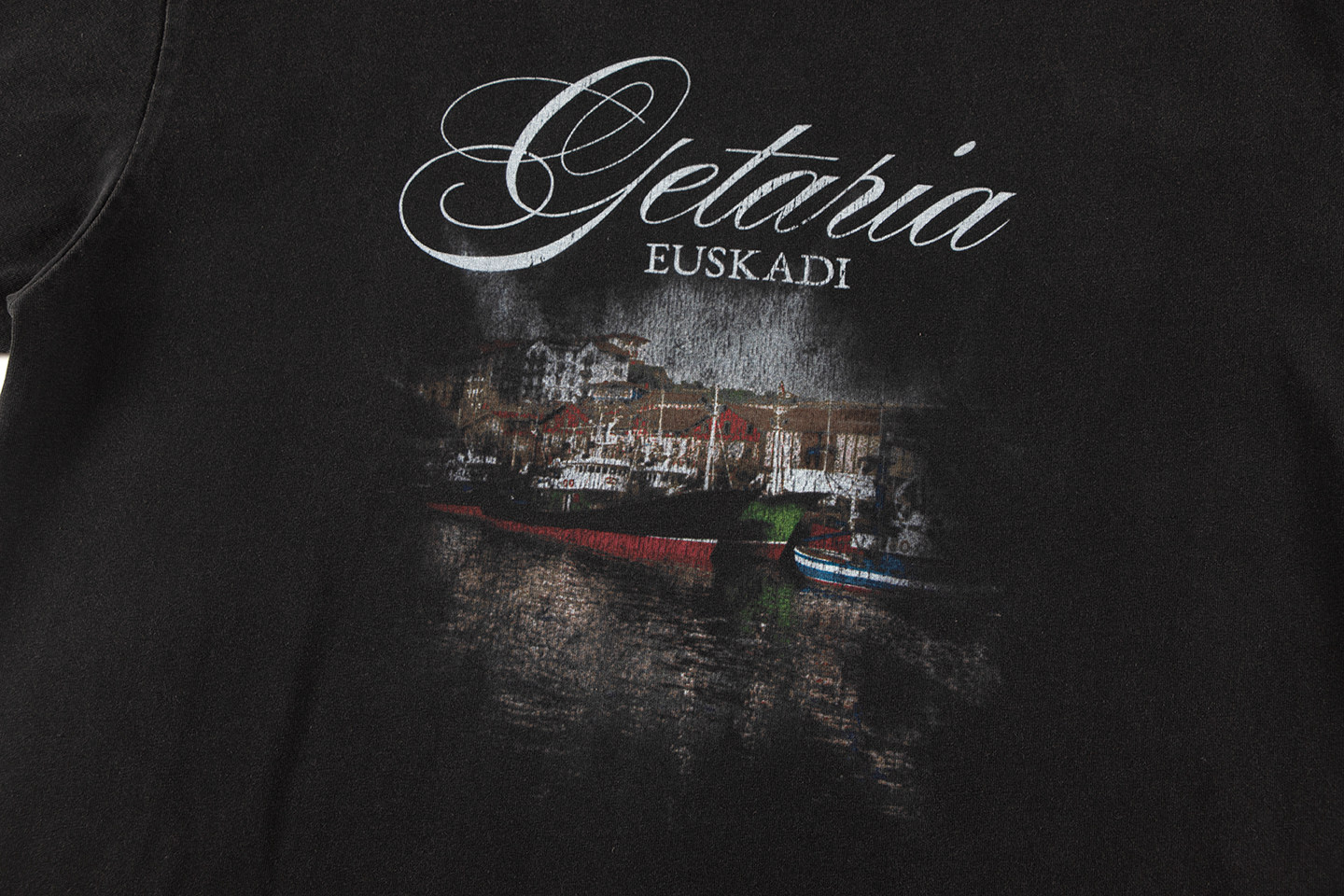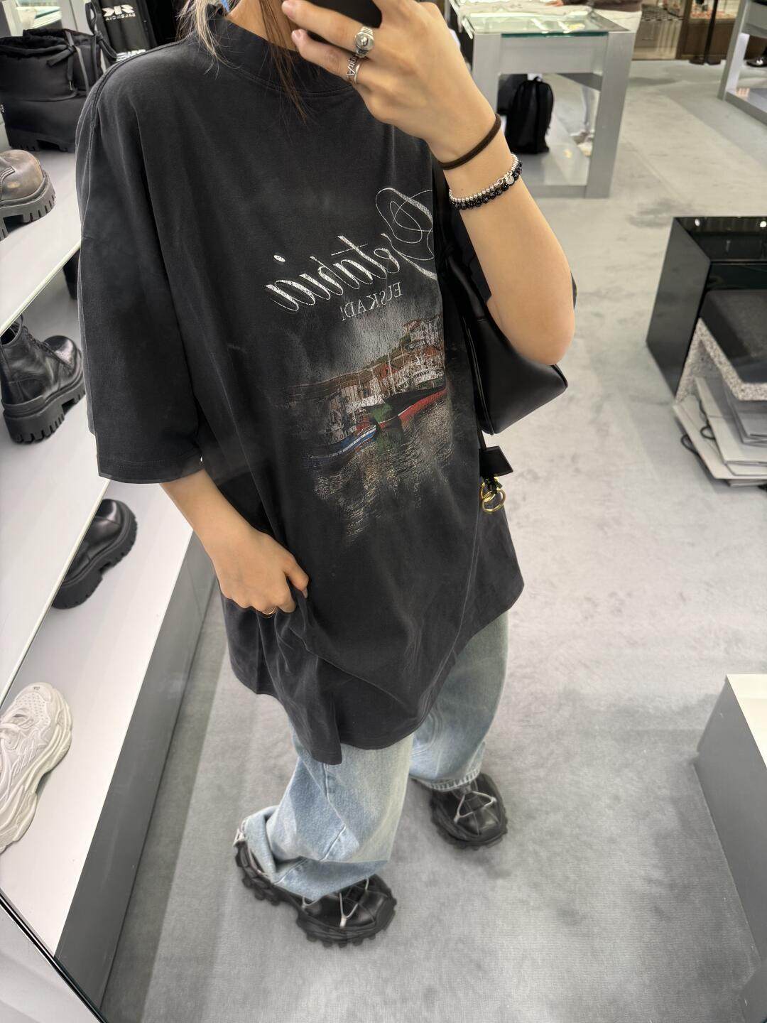 巴黎風格船舶夜景字母直噴印花水洗做舊短袖T恤